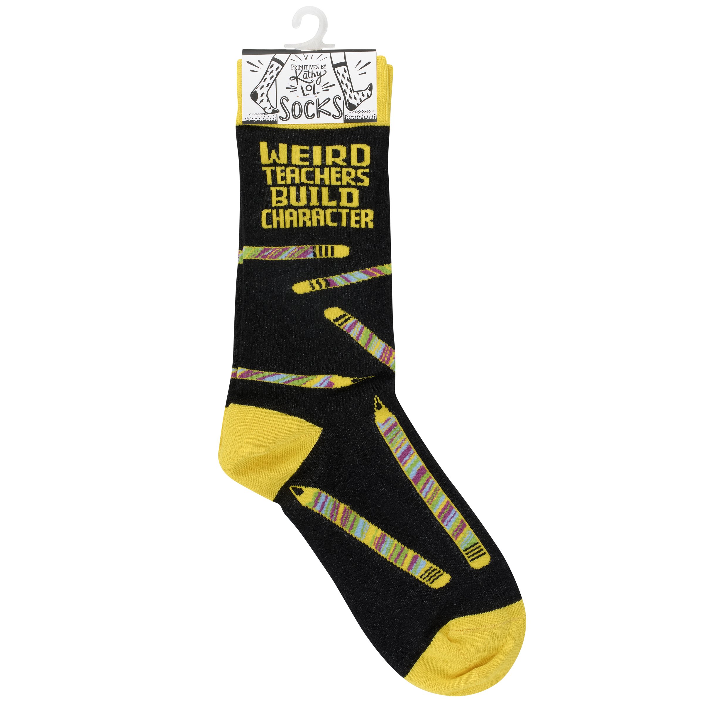 A pair of colorful socks from our Teacher Gift Collection displaying playful hand illustrated designs of striped pencils with a fun teacher inspired sentiment that reads "Weird Teachers Build Character." These giftable socks are made with a cotton, nylon, and spandex blend for a one size fits most design. Our Weird Teachers Build Character socks come with a decorative header card and a clear plastic hanger for easy rack display and gifting. A fun gift for teachers perfect for everyday self-expression.