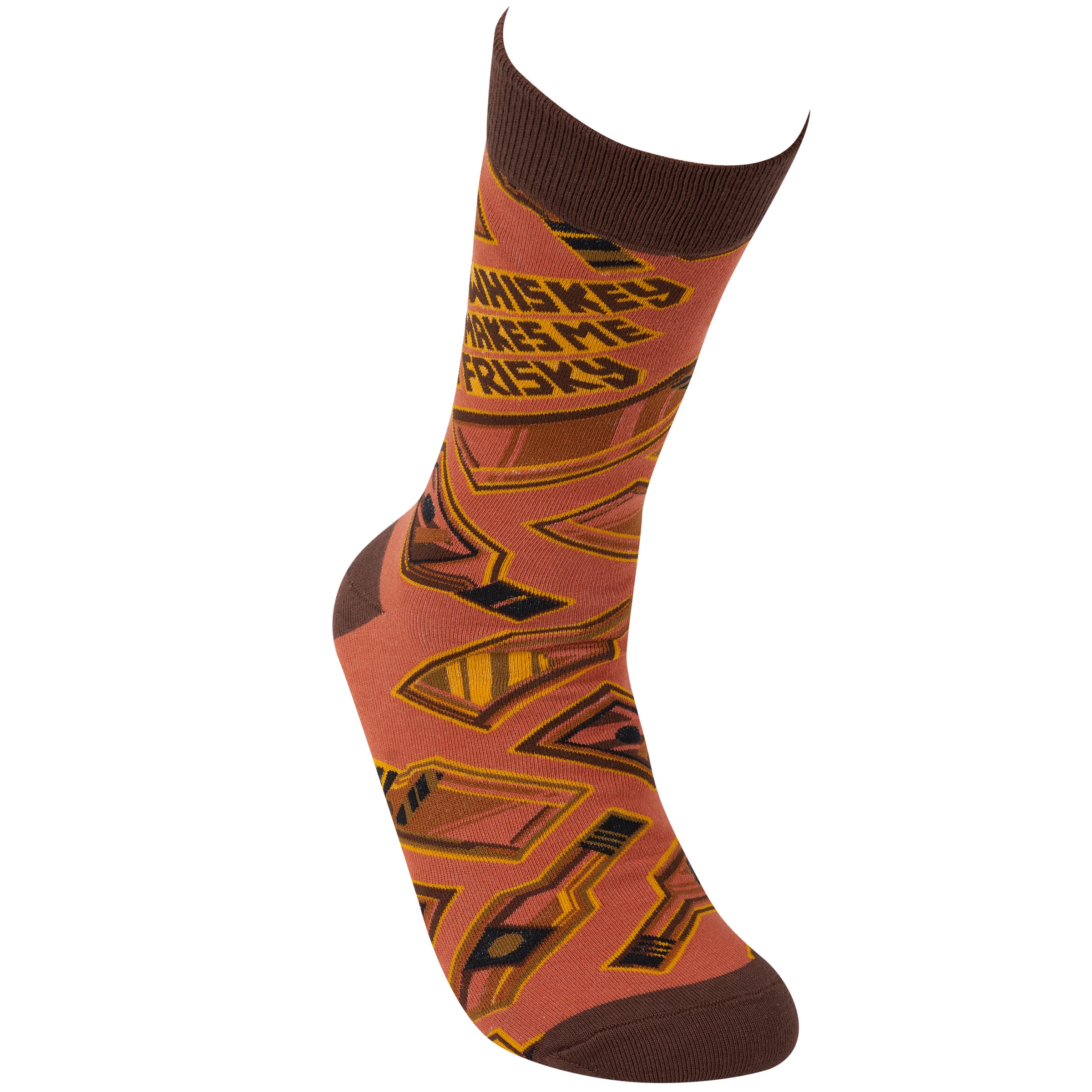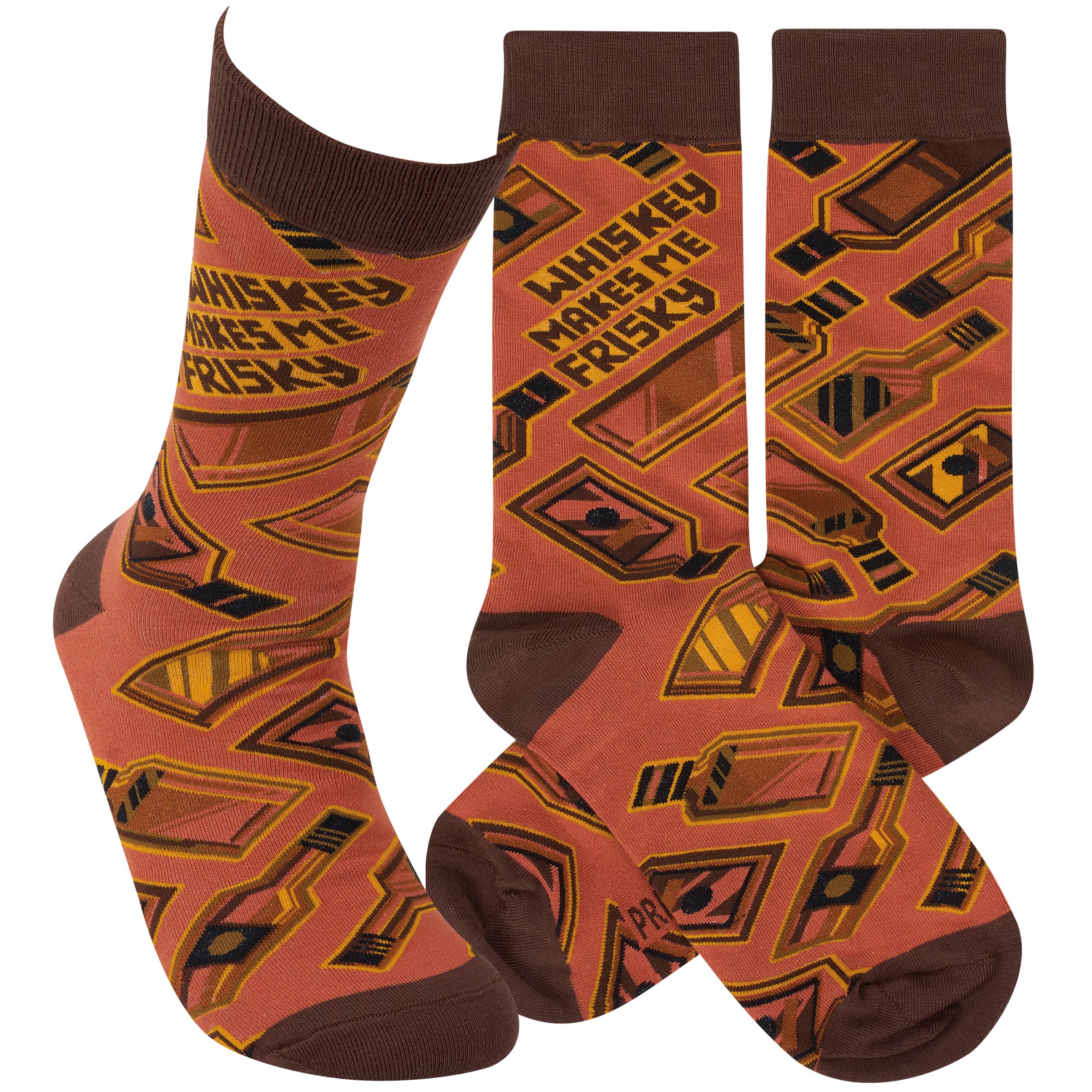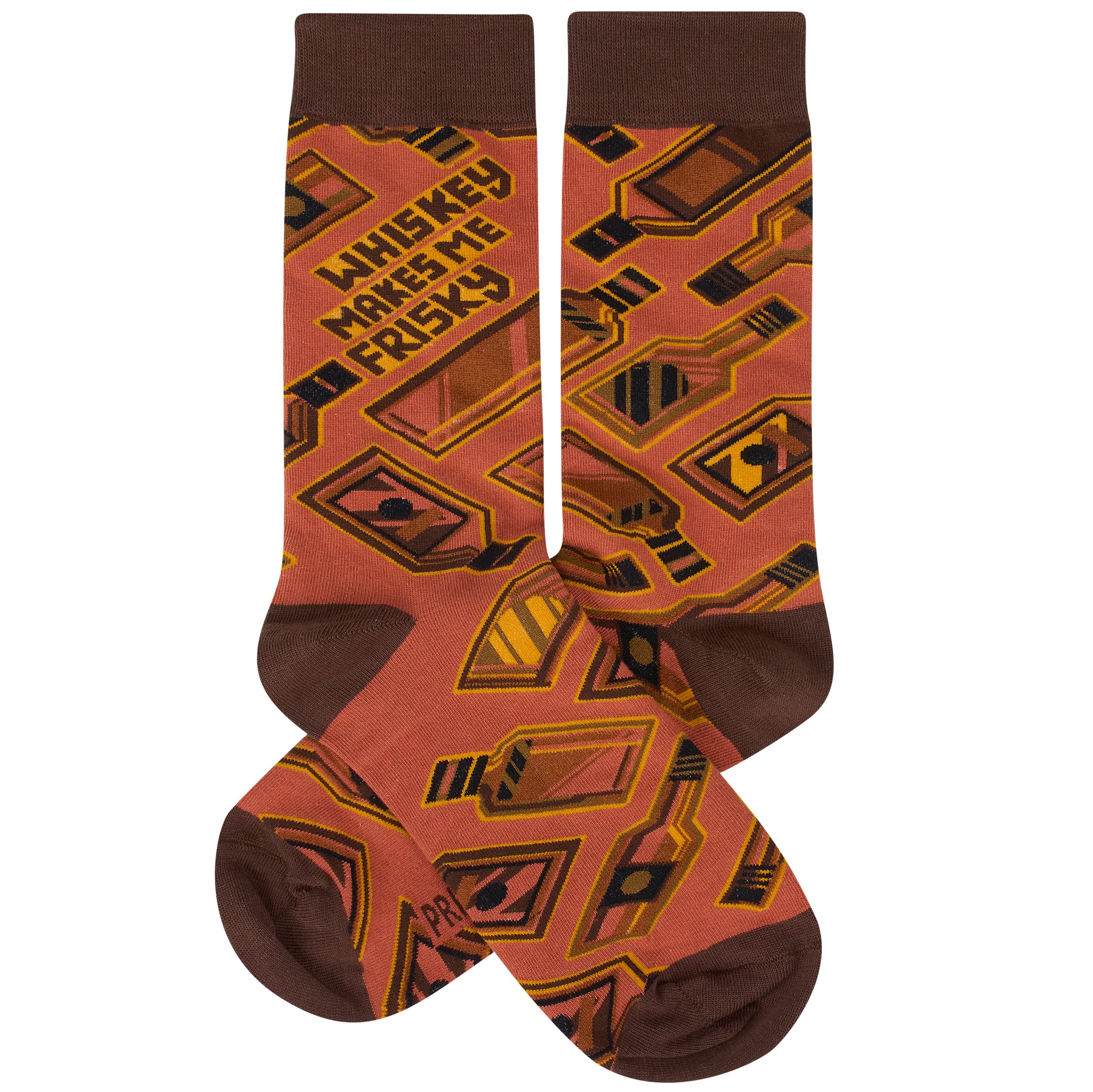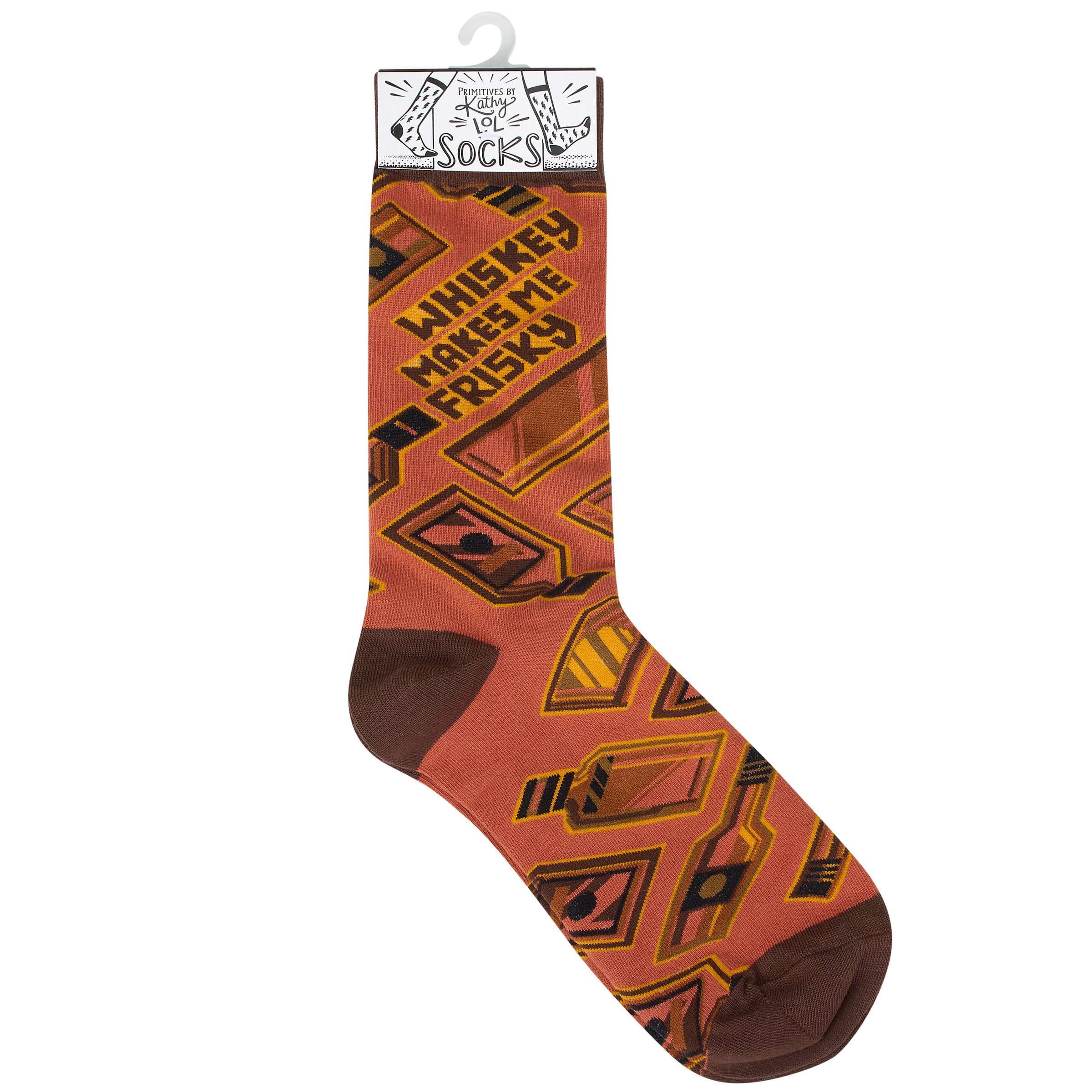 A pair of colorful socks from our LOL-Made You Smile Collection displaying playful hand illustrated designs of various whiskey bottles with a fun alcohol inspired sentiment that reads "Whiskey Makes Me Frisky." These giftable socks are made with a cotton, nylon, and spandex blend for a one size fits most design. Our Whiskey Makes Me Frisky socks come with a decorative header card and a clear plastic hanger for easy rack display and gifting. A fun alcohol themed gift perfect for everyday self-expression.