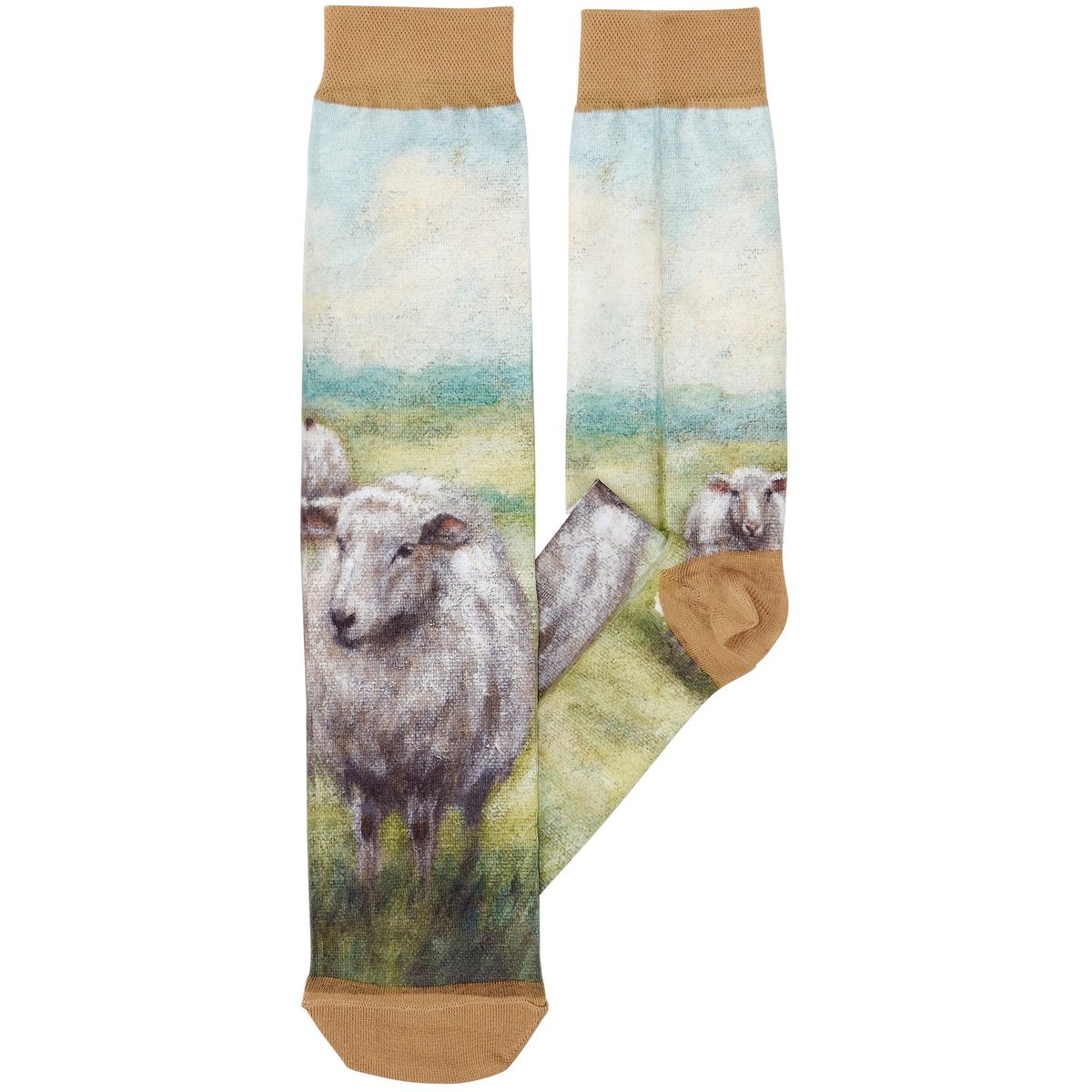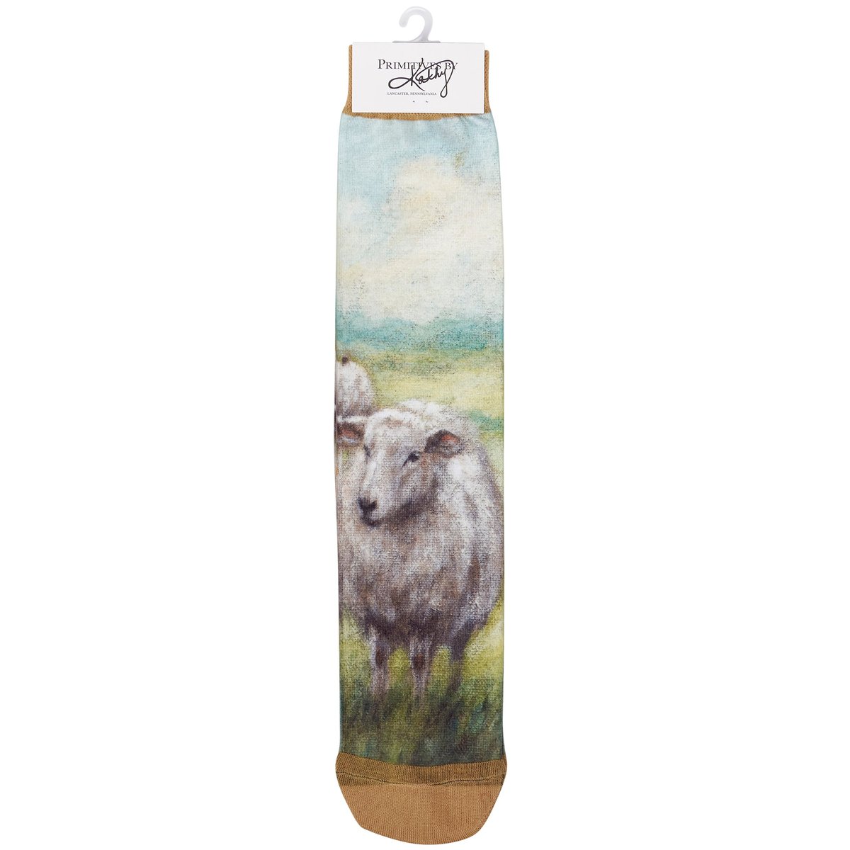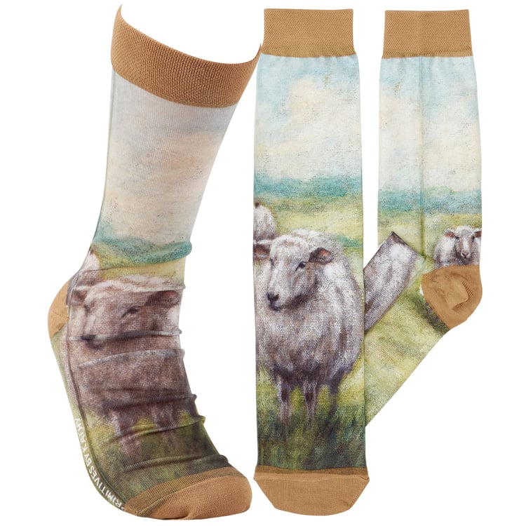 A pair of colorful knee-high socks from our Farmhouse Collection displaying a hand painted design of white sheep in a field on each sock. Sheep design is digitally printed replicating original artwork painted onto burlap canvas, giving the art a unique depth and texture. These giftable socks feature a knee-high length to easily show off the full design made with a spandex blend for a one size fits most design. Our knee-high White Sheep socks come with a decorative header card and a clear plastic hanger for easy rack display and gifting. A charming farm-themed gift perfect for everyday self-expression.