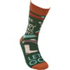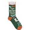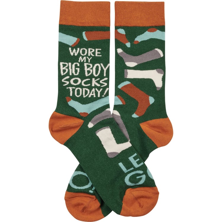 A pair of colorful woven socks from our LOL Made You Smile Collection displaying hand illustrated designs of various socks with sentiments that read "Wore My Big Boy Socks Today! - LET'S GO." Socks feature a one size fits most design made with cotton, nylon, and spandex. Our Wore My Big Boy Socks Today socks come with a header card and a clear plastic hanger for display. A fun everyday accessory perfect for self-expression or gifting on any occasion.