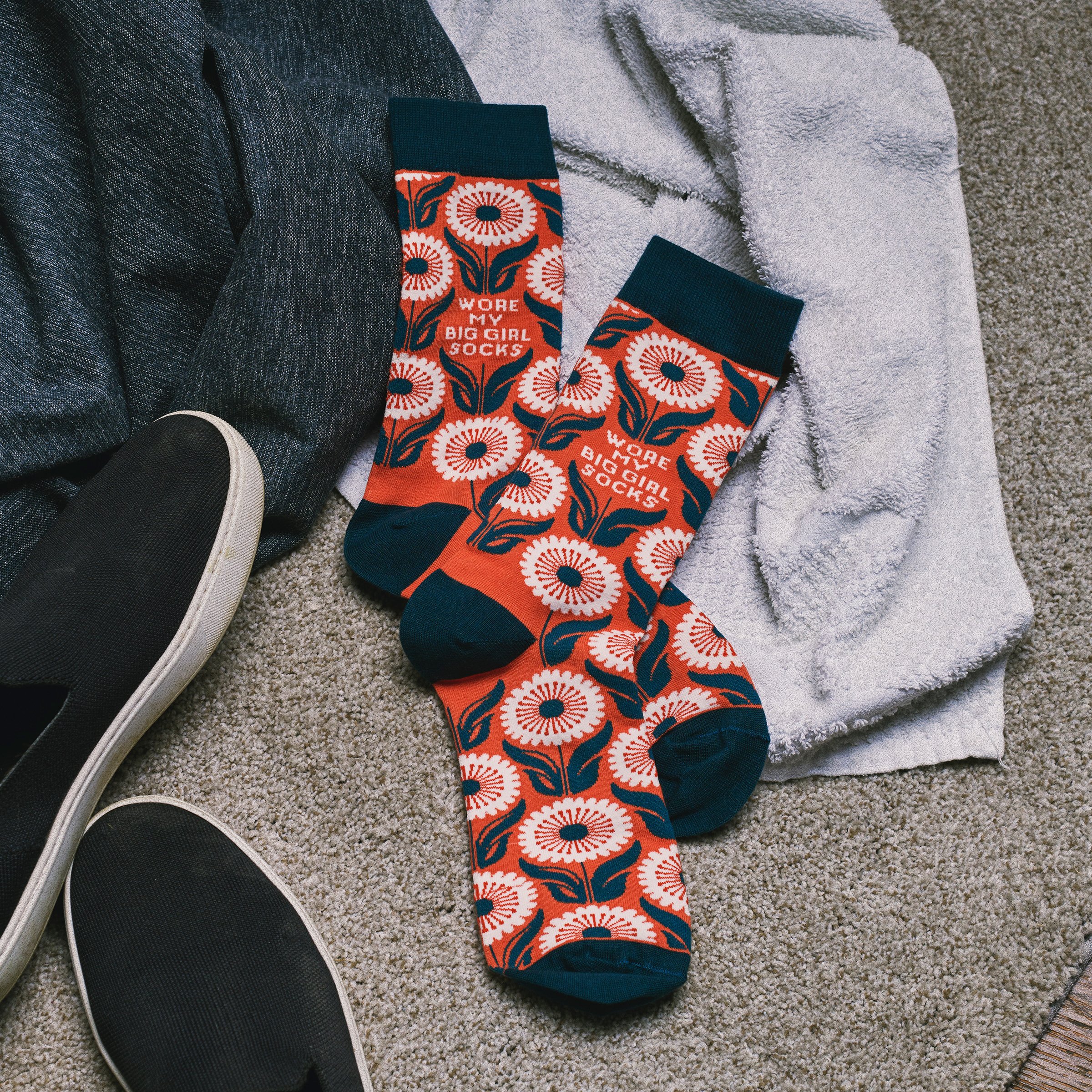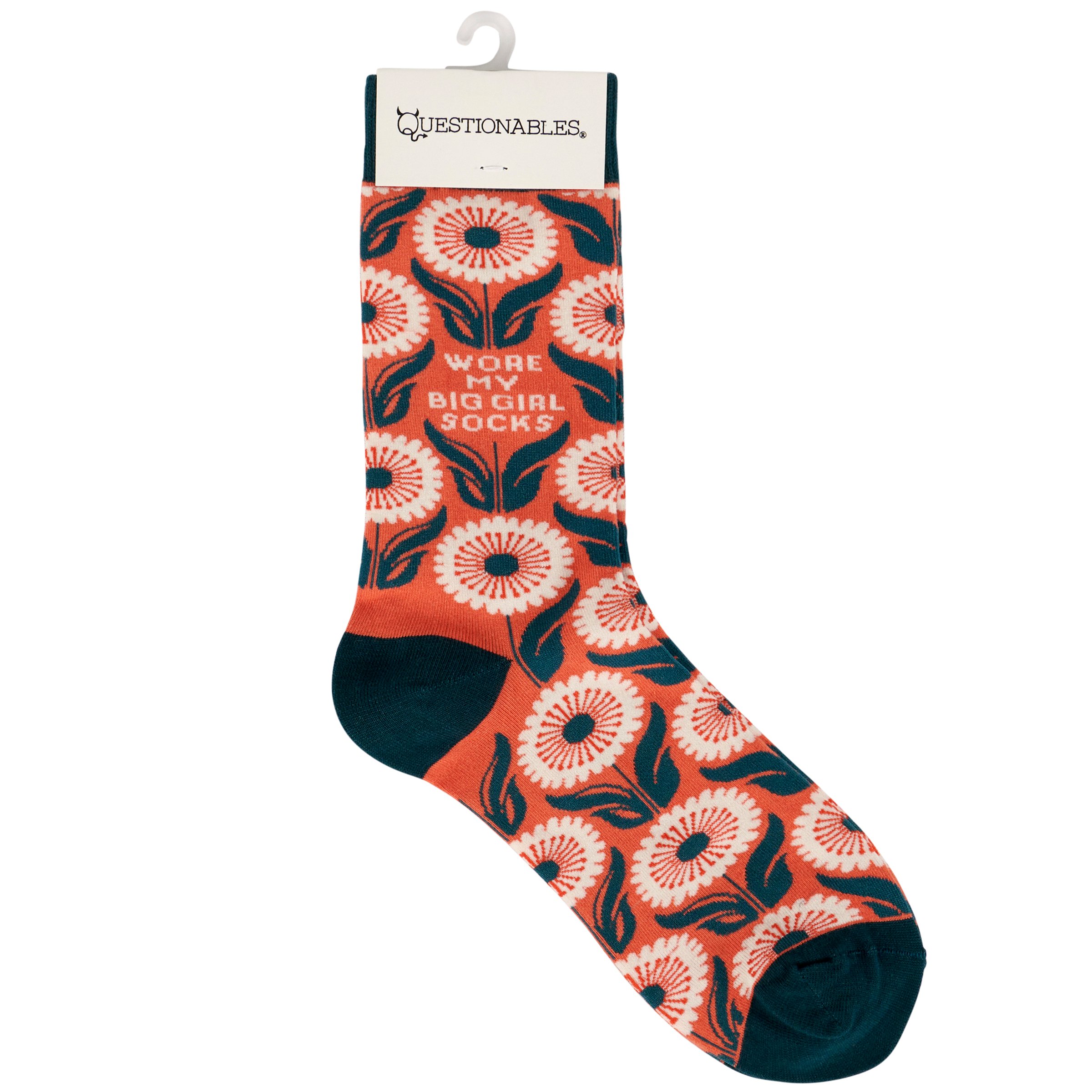 Let 'em know that everyday life can be hard and you got this, but make sure to do it in style! This pair of colorful socks flaunts a vibrant floral pattern with a relatable sentiment that reads "Wore My Big Girl Socks." Questionables socks are made with cotton, nylon, and spandex to create a one-size-fits-most design. Packaged on a clear plastic hanger with header card for graceful display in store. Our Big Girl socks are perfect for standing out and making a statement while getting a giggle out of others. Colorful and cozy socks always make a great gift that offer many ways to express themselves every day.