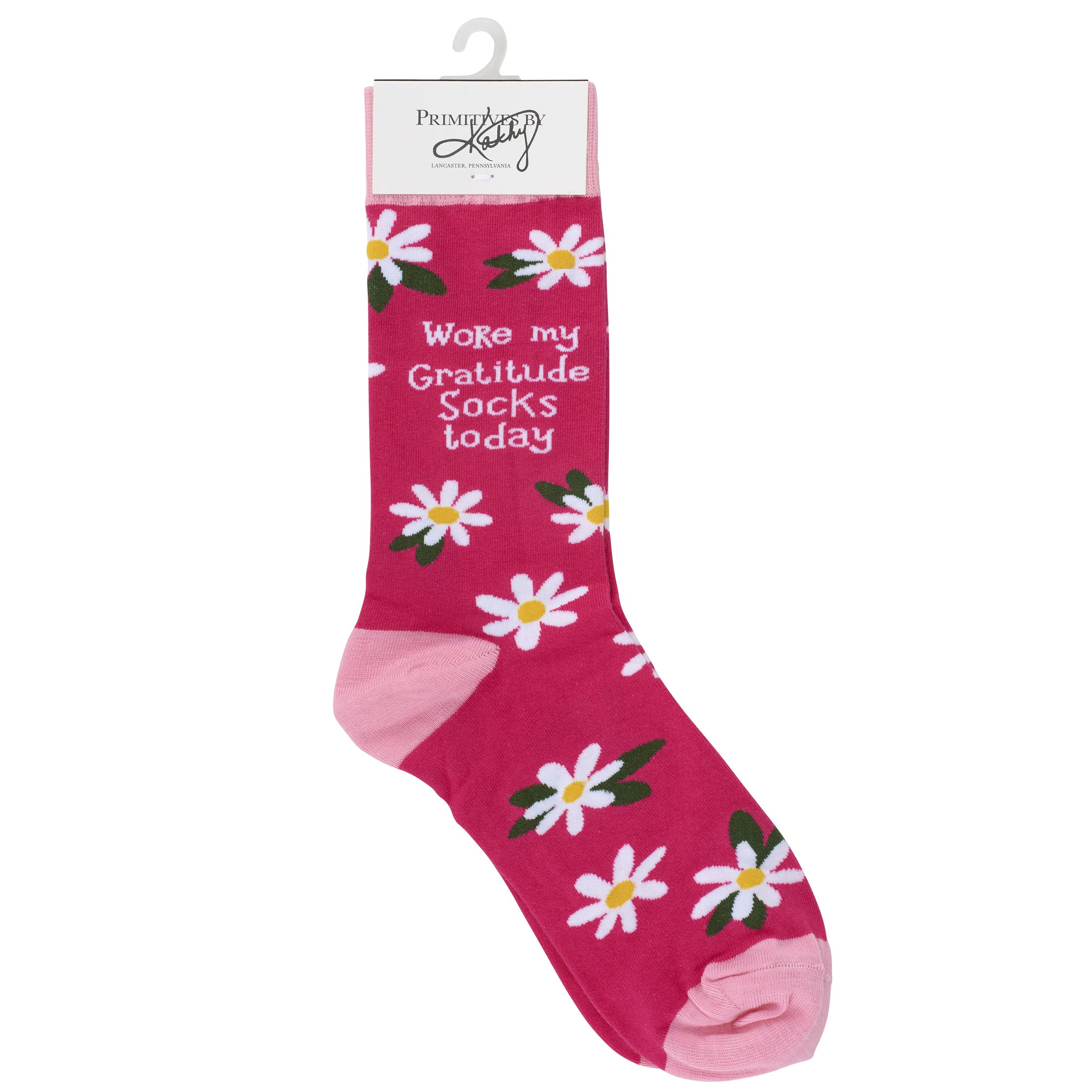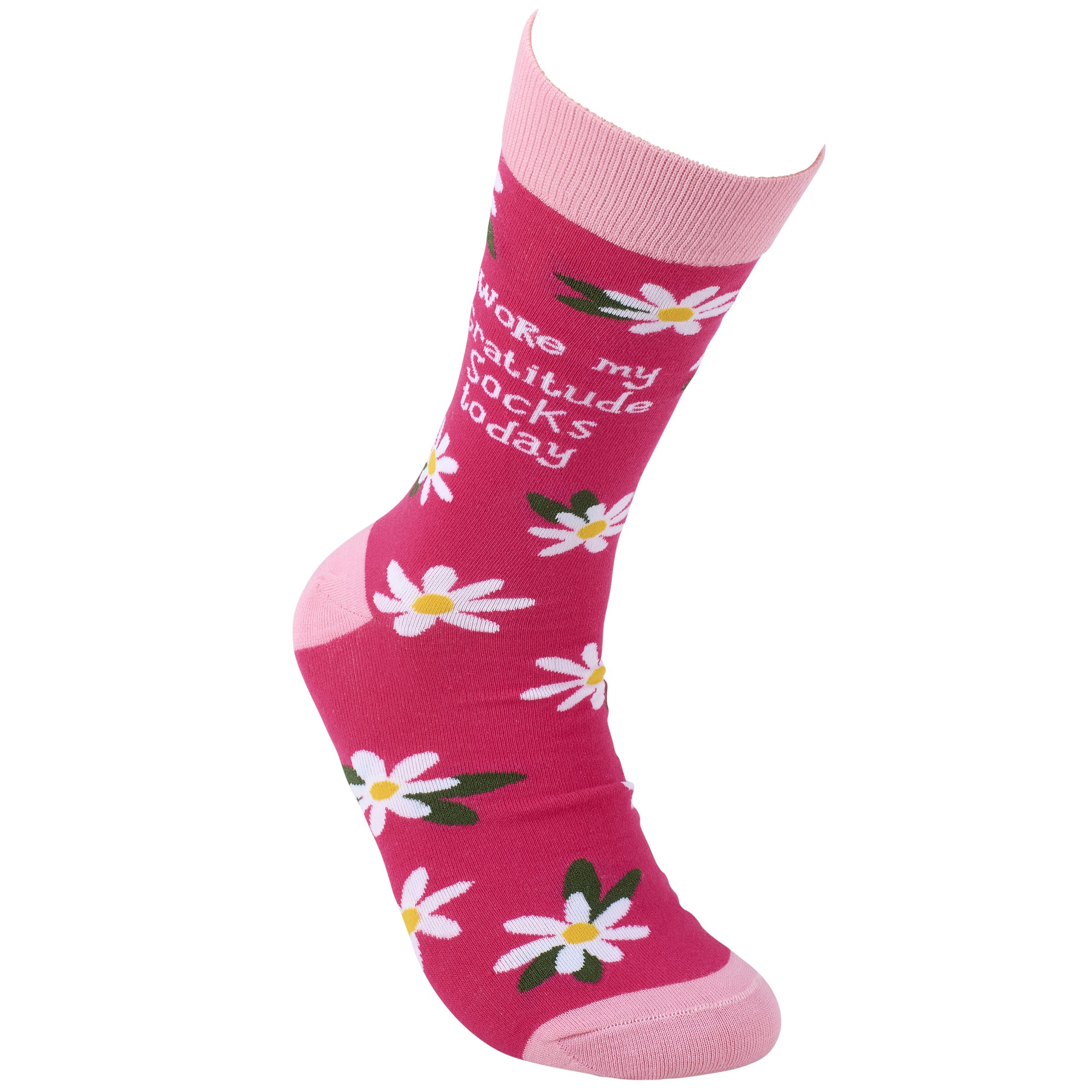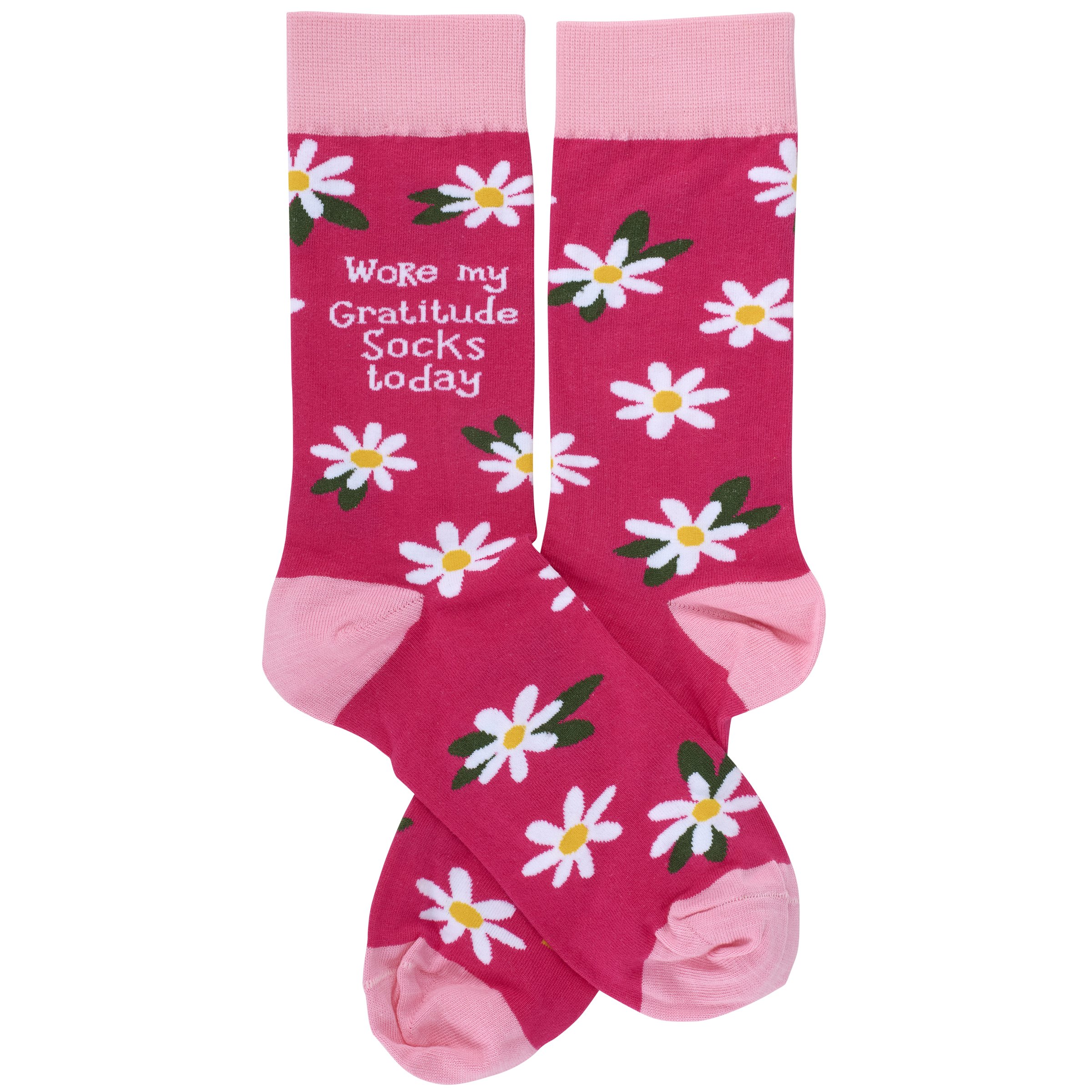 A pair of colorful socks from our Inspiration & Blooms Collection displaying woven designs of hand illustrated flowers on pink socks with a fun inspirational sentiment that reads "Wore My Gratitude Socks Today." Inspirational socks also feature light pink color accents on the cuff, heel, and toe. These giftable socks are made with a cotton, nylon, and spandex blend for a one size fits most design. Our Wore My Gratitude Socks Today socks come with a decorative header card and a clear plastic hanger for easy rack display and gifting. An inspirational gift perfect for everyday self-expression.