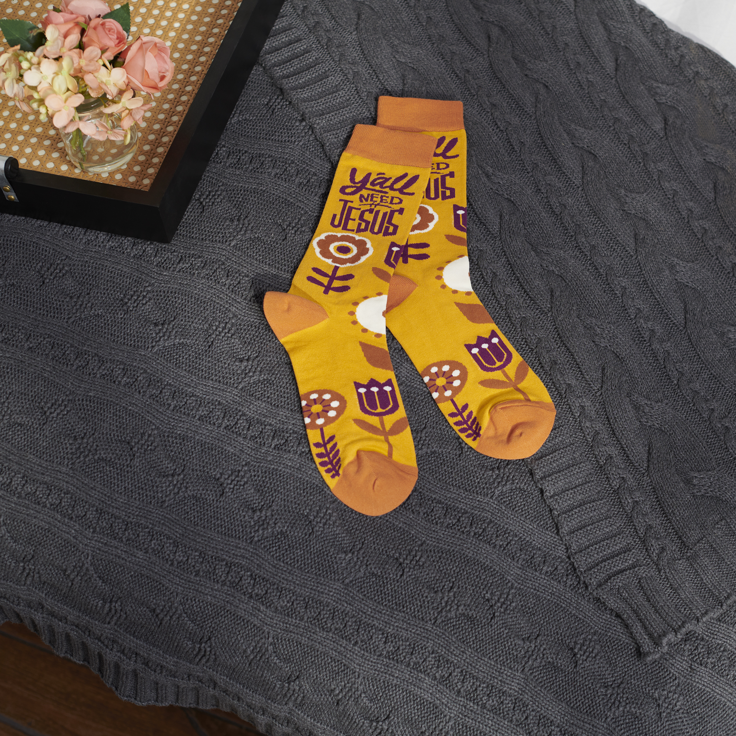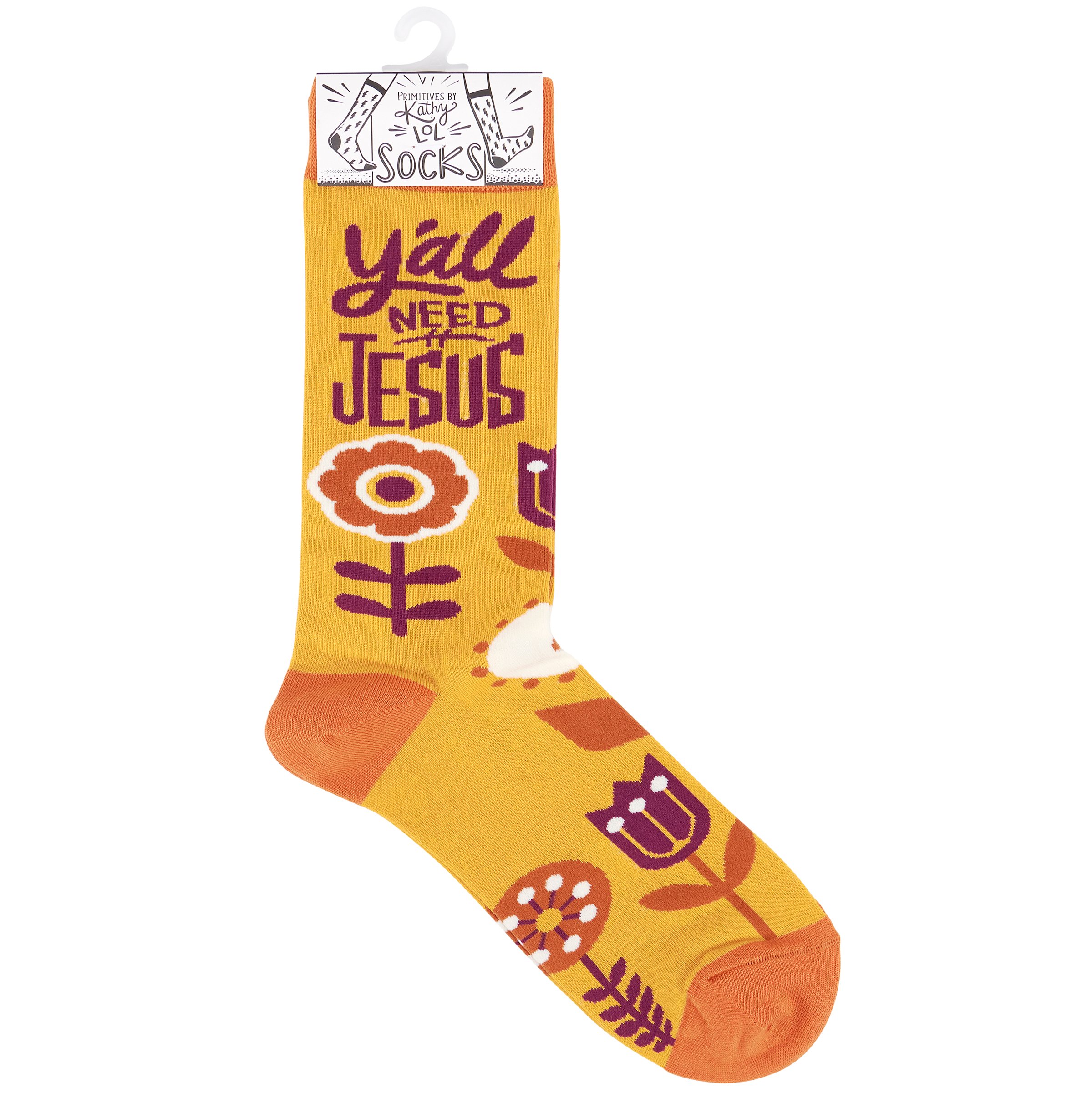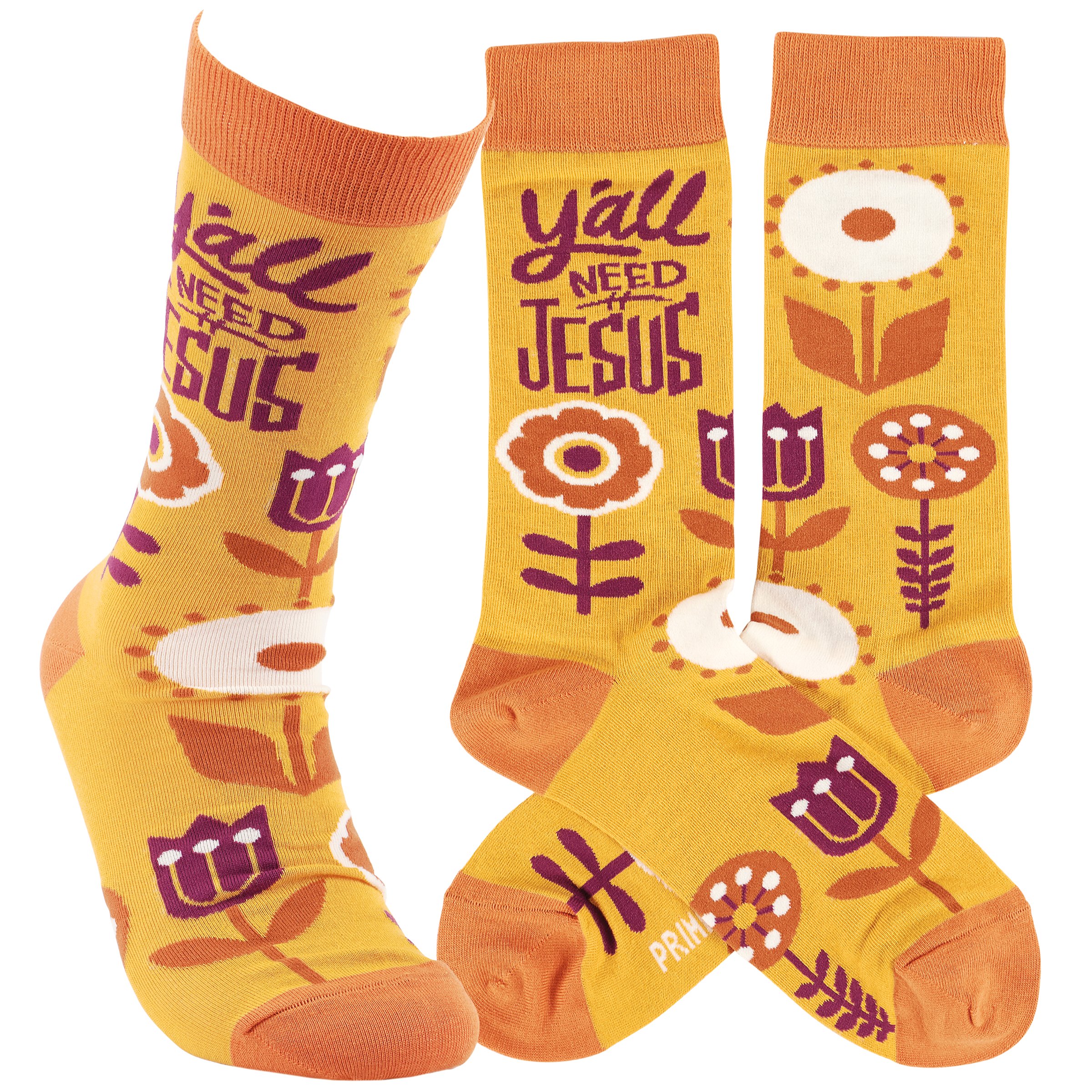 A pair of colorful socks from our LOL-Made You Smile Collection displaying delightful hand illustrated flowers with a fun faith inspired sentiment that reads "Y'all Need Jesus." These giftable socks are made with a cotton, nylon, and spandex blend for a one size fits most design. Our Y'all Need Jesus socks come with a decorative header card and a clear plastic hanger for easy rack display and gifting. A fun faith-themed gift perfect for everyday self-expression.
