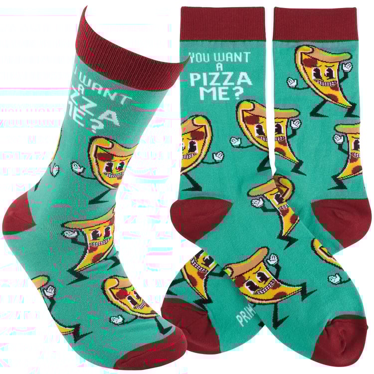 A pair of colorful socks from our LOL-Made You Smile Collection displaying playful hand illustrated designs of a pizza character in a fun retro style with a food inspired sentiment that reads "You Want A Pizza Me?" These giftable socks are made with a cotton, nylon, and spandex blend for a one size fits most design. Our You Want A Pizza Me? socks come with a decorative header card and a clear plastic hanger for easy rack display and gifting. A fun food-themed gift perfect for everyday self-expression.