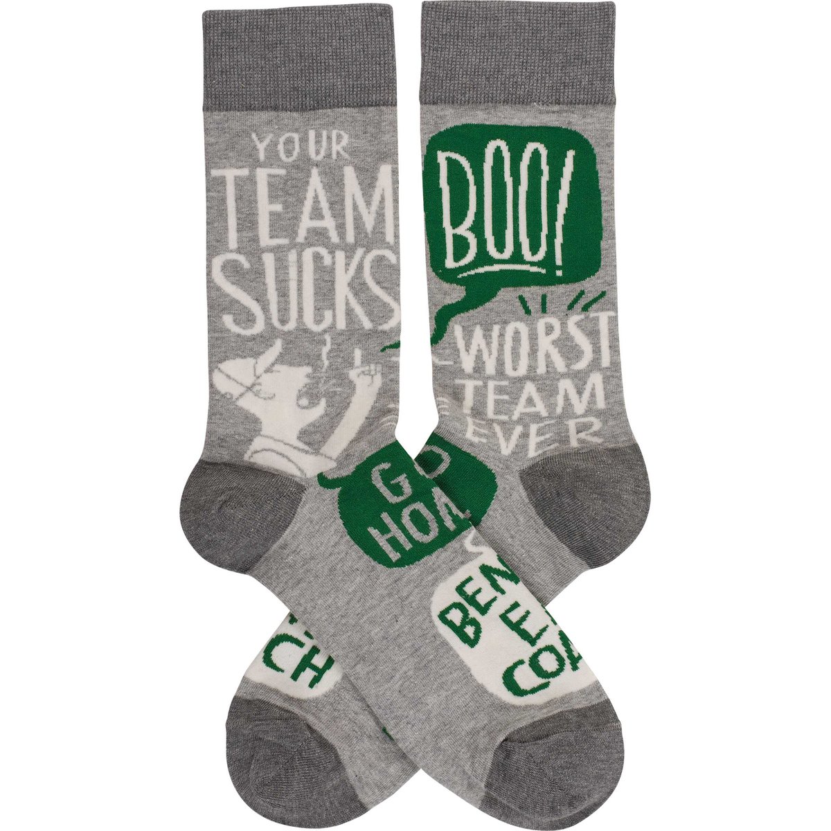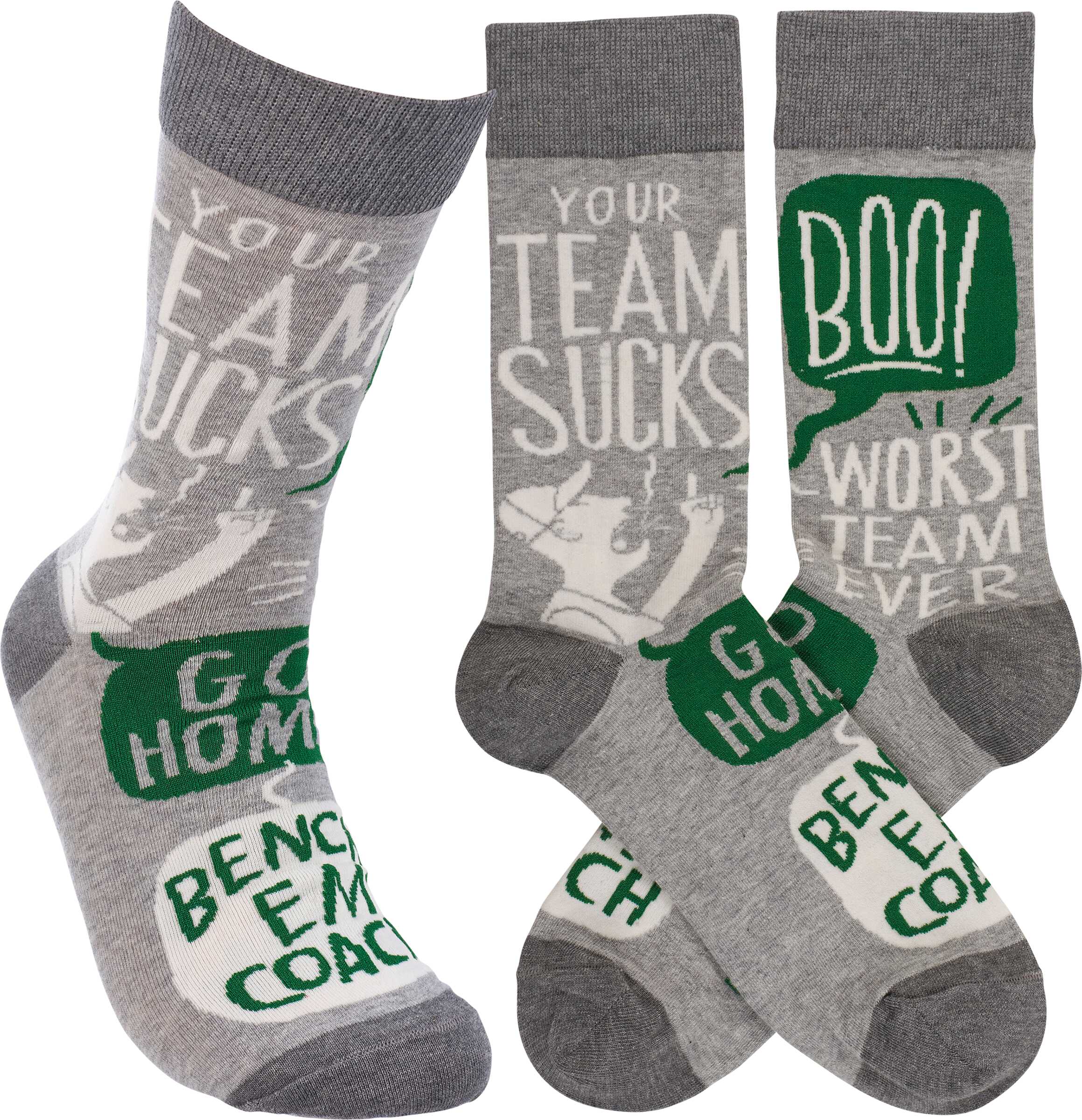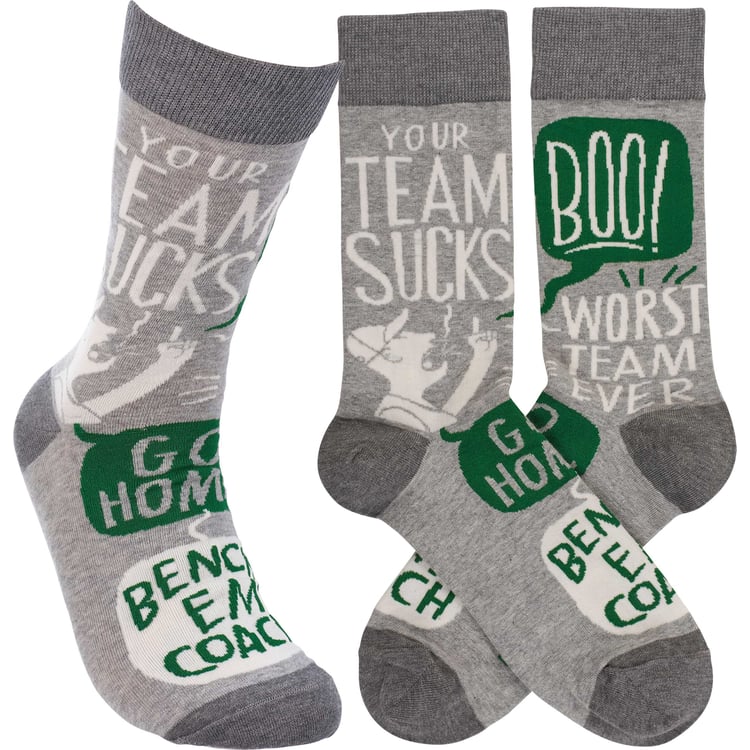 A pair of colorful woven socks from our Sports Collection displaying person shouting "Boo!" with coordinating sentiments reading "Your Team Sucks - Go Home! - Bench Em Coach - Worst Team Ever.". One size fits most design made with cotton, nylon, and spandex. Our Your Team socks come with a header card and a clear plastic hanger for display.