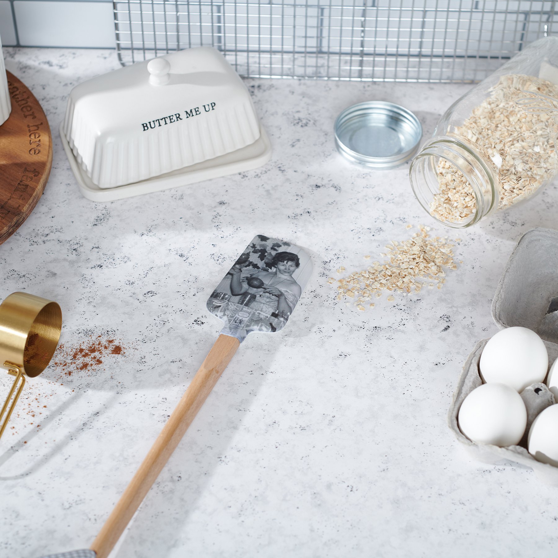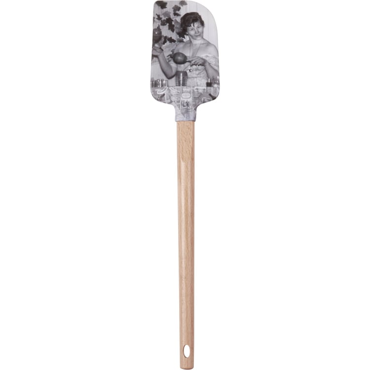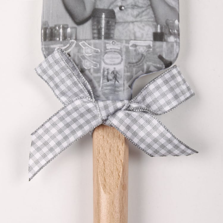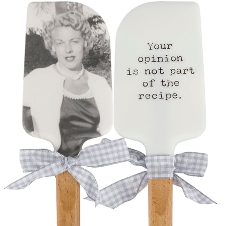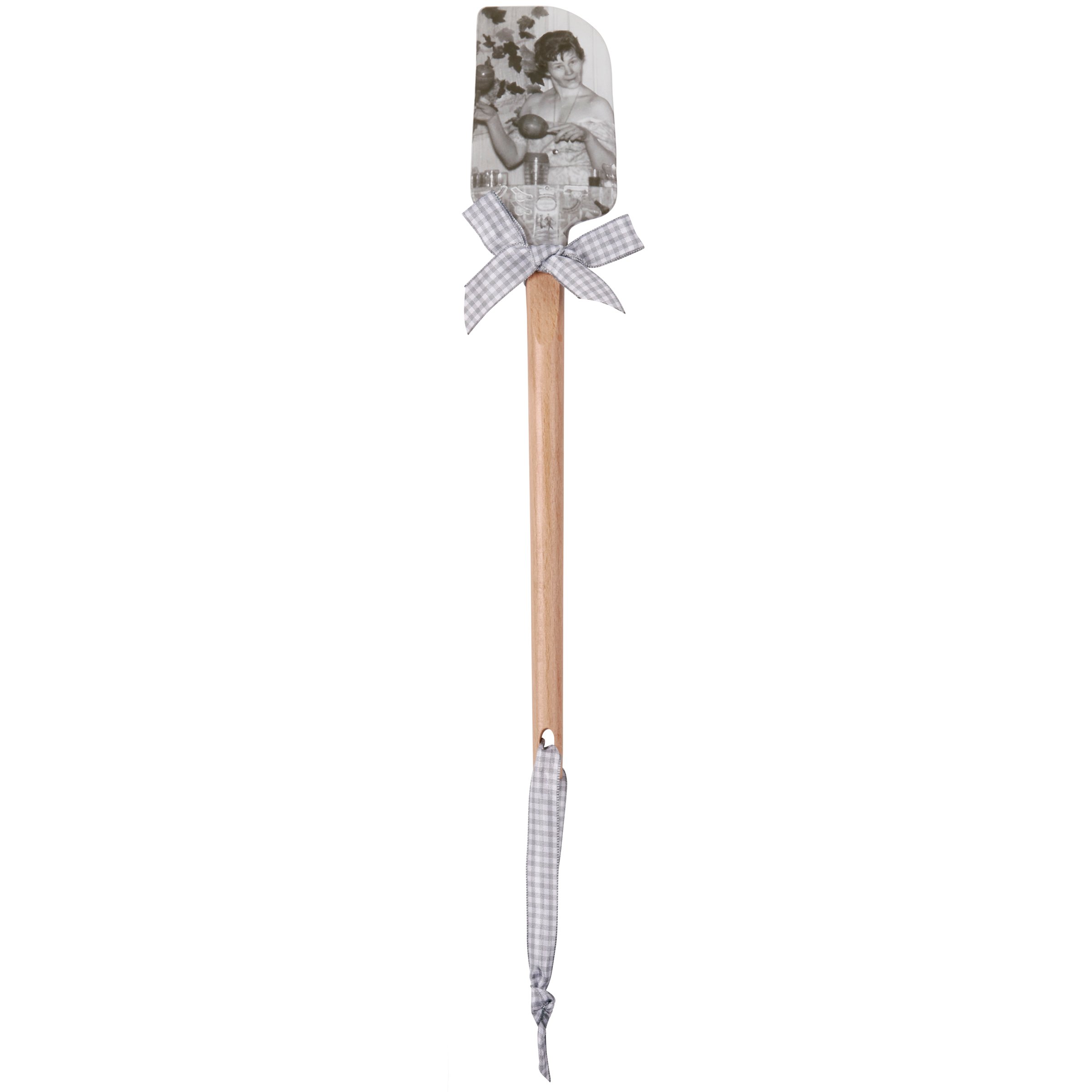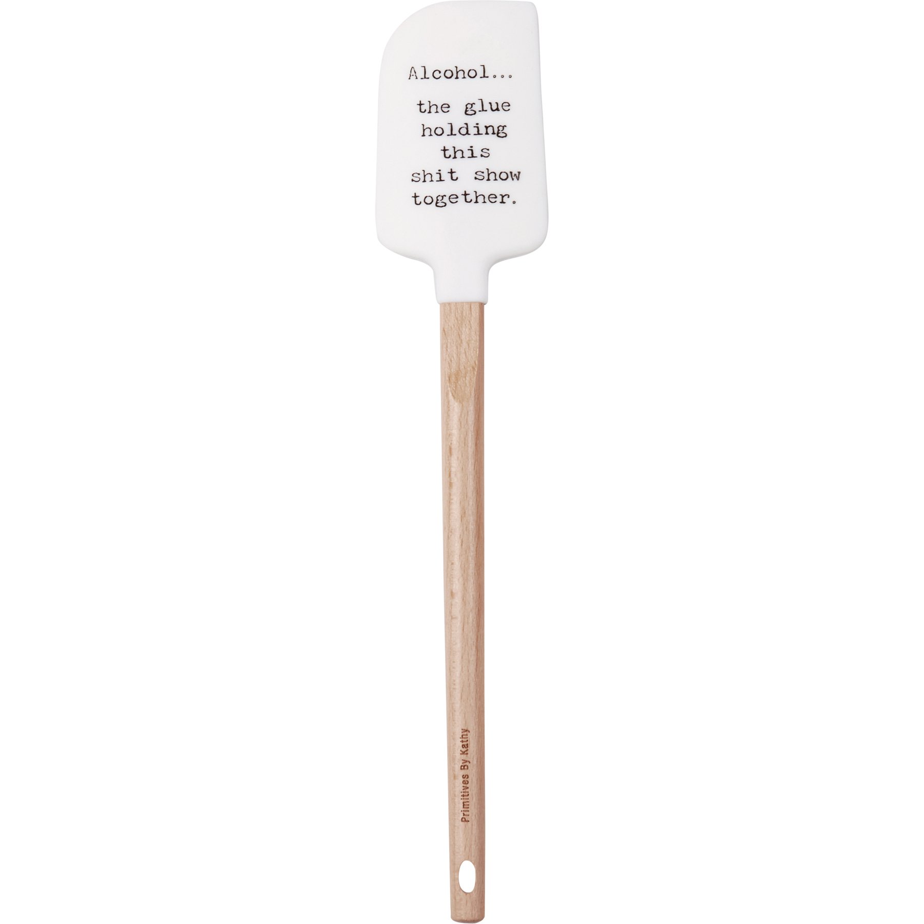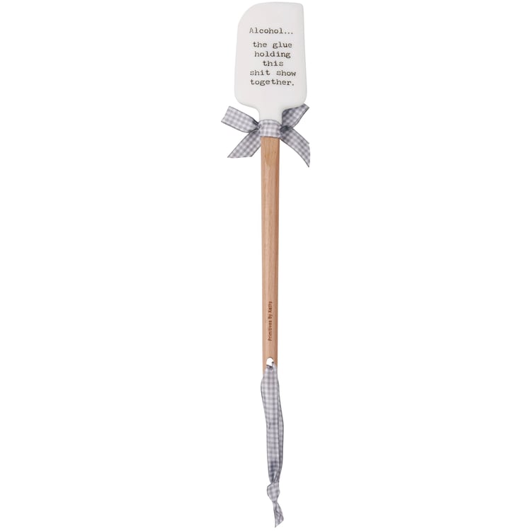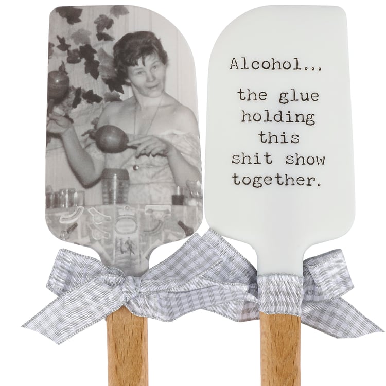 A double-sided silicone spatula from our Trash Talk by Annie Collection features a vintage photograph on one side, and "Alcohol...The Glue Holding This Shit Show Together" sentiment on the other side. Logo is engraved into wooden handle for added interest and includes a decorative gray and white gingham bow and ribbon for hanging. The Glue spatula is hand-wash recommended; not microwave safe.