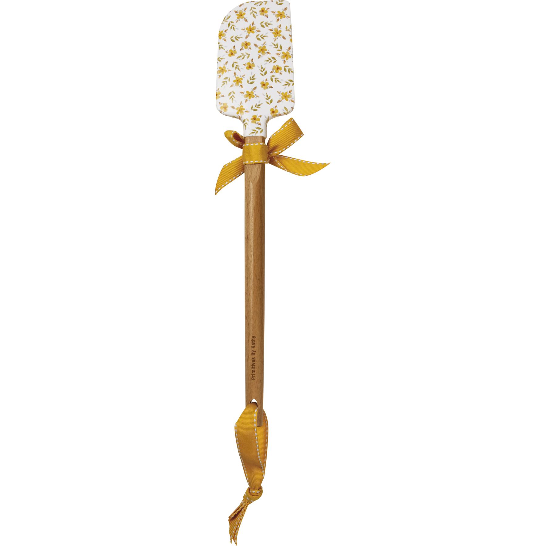 A silicone spatula with a wooden handle. Features "Happy" sentiment on front with bee design and floral designs on the back. Handles feature laser cut logos and drilled hole with ribbon loop for easy hanging. Hand-wash recommended. Not microwave safe.