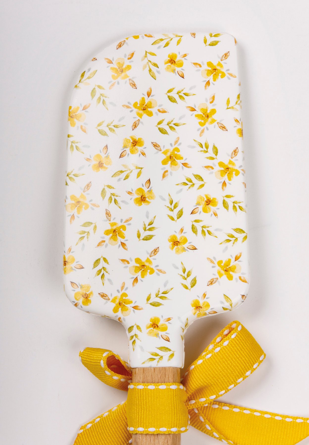 A silicone spatula with a wooden handle. Features "Happy" sentiment on front with bee design and floral designs on the back. Handles feature laser cut logos and drilled hole with ribbon loop for easy hanging. Hand-wash recommended. Not microwave safe.
