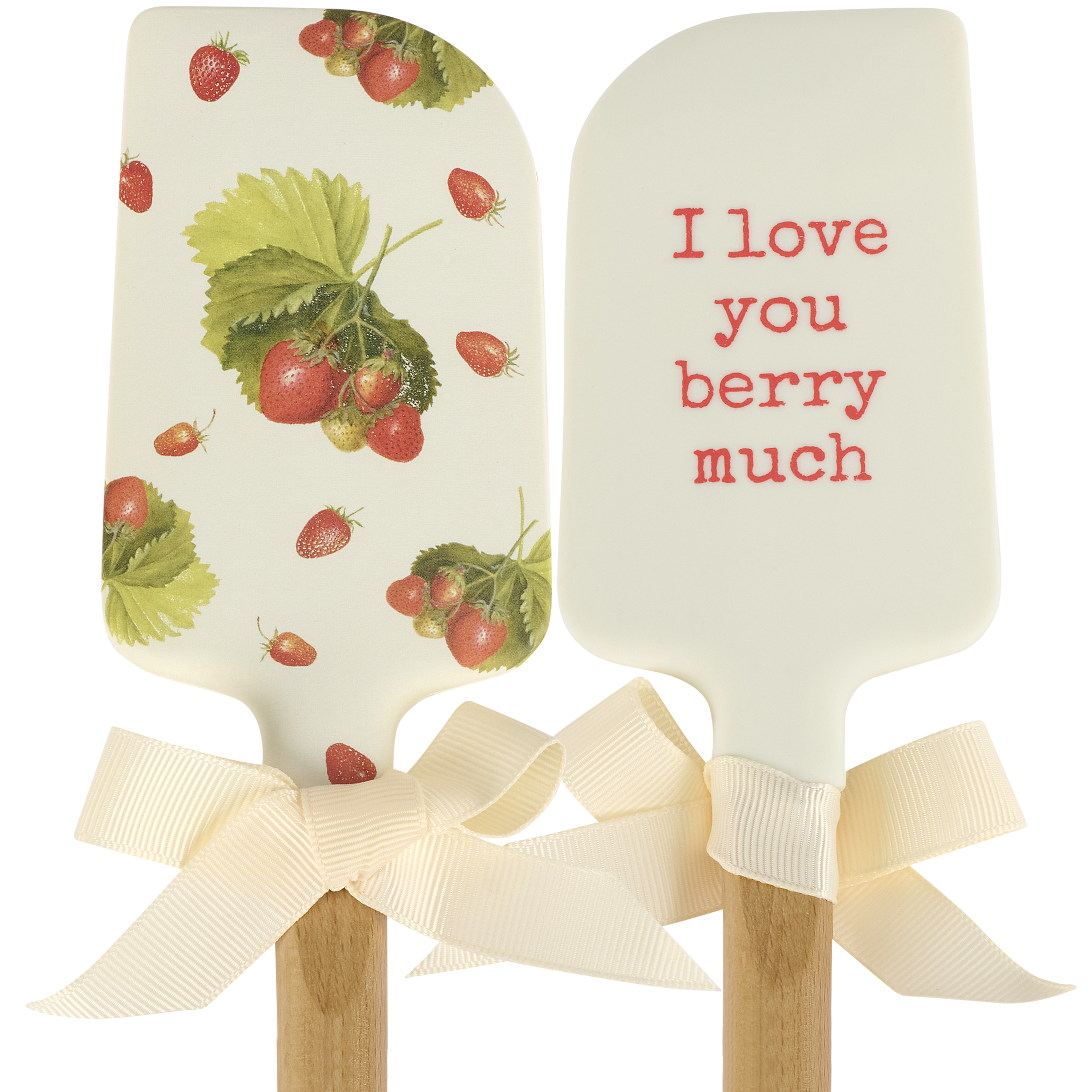 A double-sided silicone spatula from our Garden Collection displaying vintage art of wild strawberries on one side and punny sentiment on the other side that reads "I Love You Berry Much." Logo is engraved into wooden handle for added interest. Our Berry Much spatula includes a complementing decorative bow and hole at the bottom for hanging. Hand-wash recommended; not microwave safe. A fun strawberry-themed kitchen accessory perfect for everyday use.