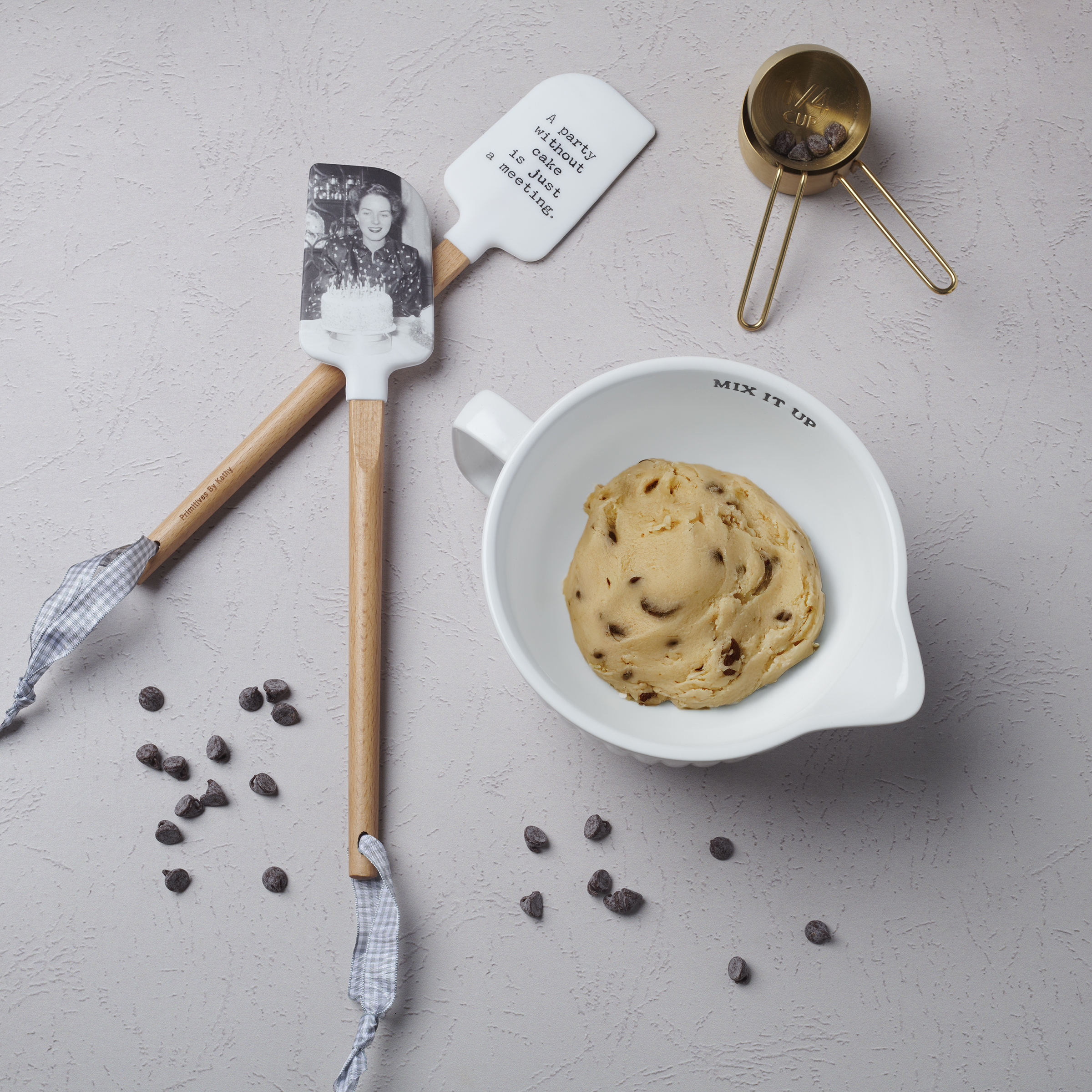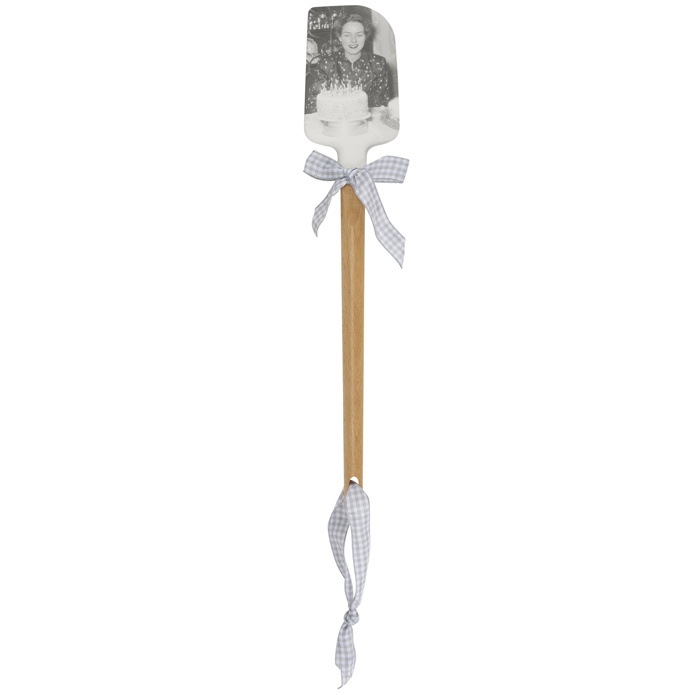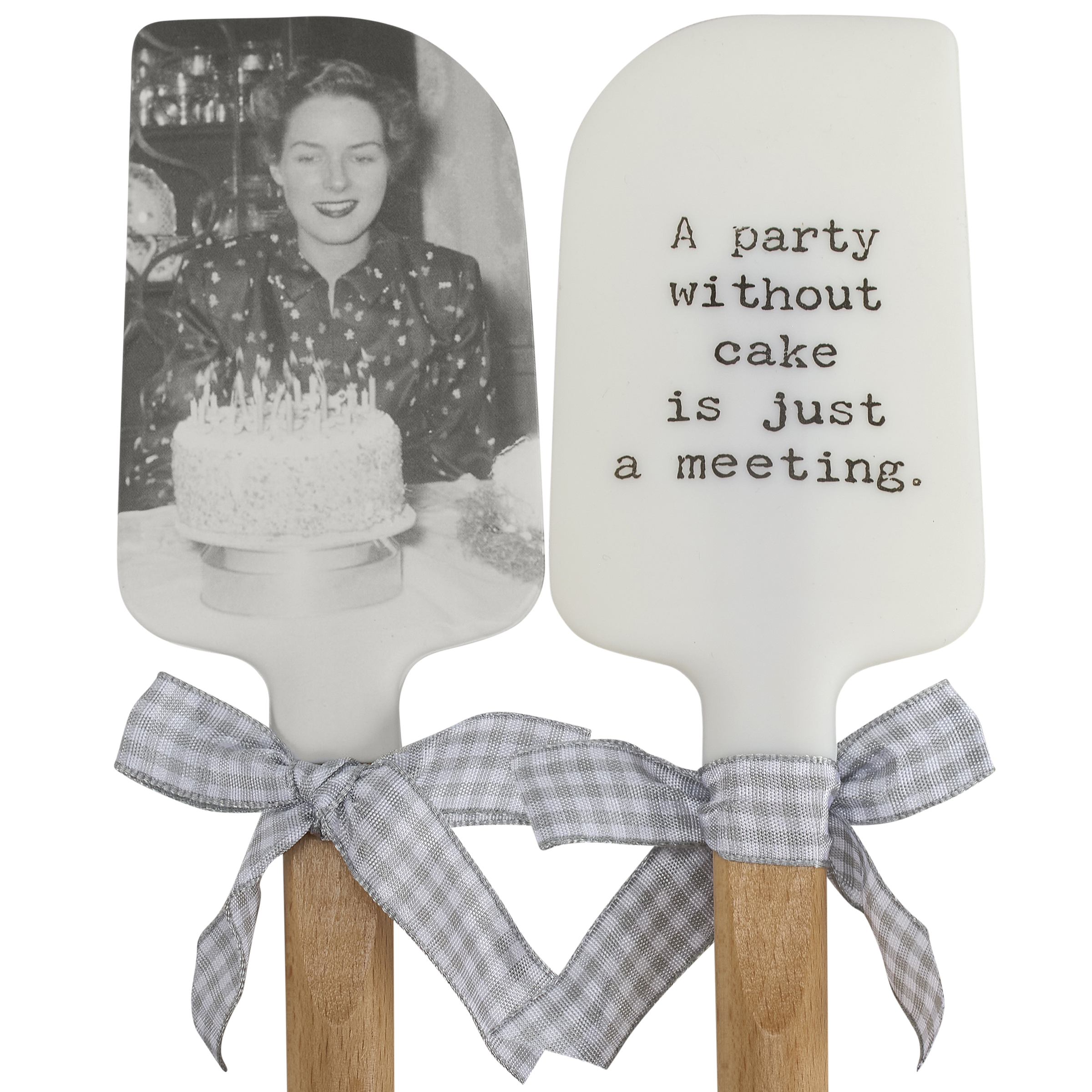 A double-sided silicone spatula from our Trash Talk By Annie Collection displaying a vintage black and white photograph of a person with a birthday cake on one side and a sassy sentiment on the other side that reads "A Party Without Cake Is Just A Meeting." Our Cake Meeting spatula includes a coordinating gingham bow and ribbon at the bottom for hanging. Hand-wash recommended; not microwave safe. A fun vintage inspired kitchen accessory perfect for everyday use.