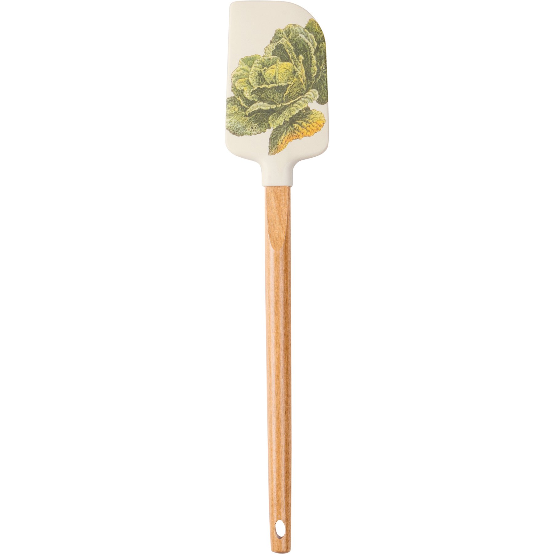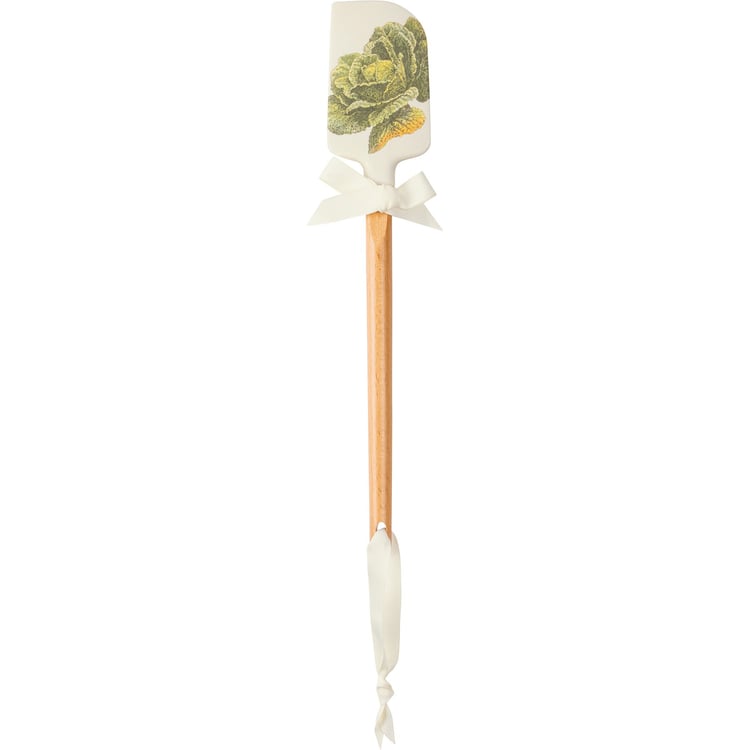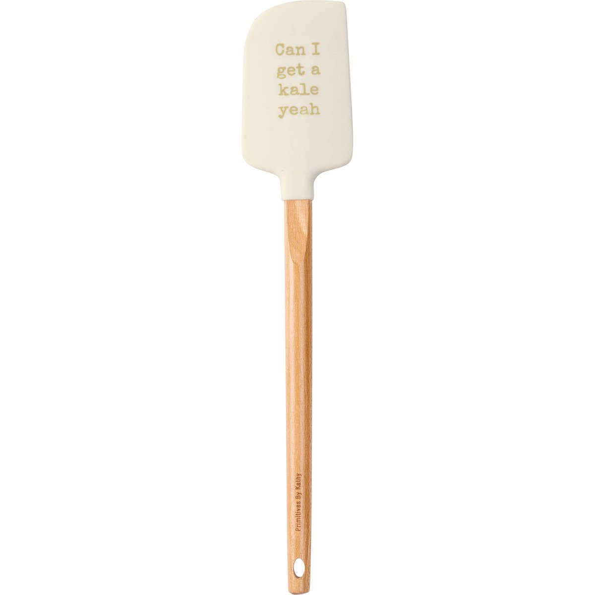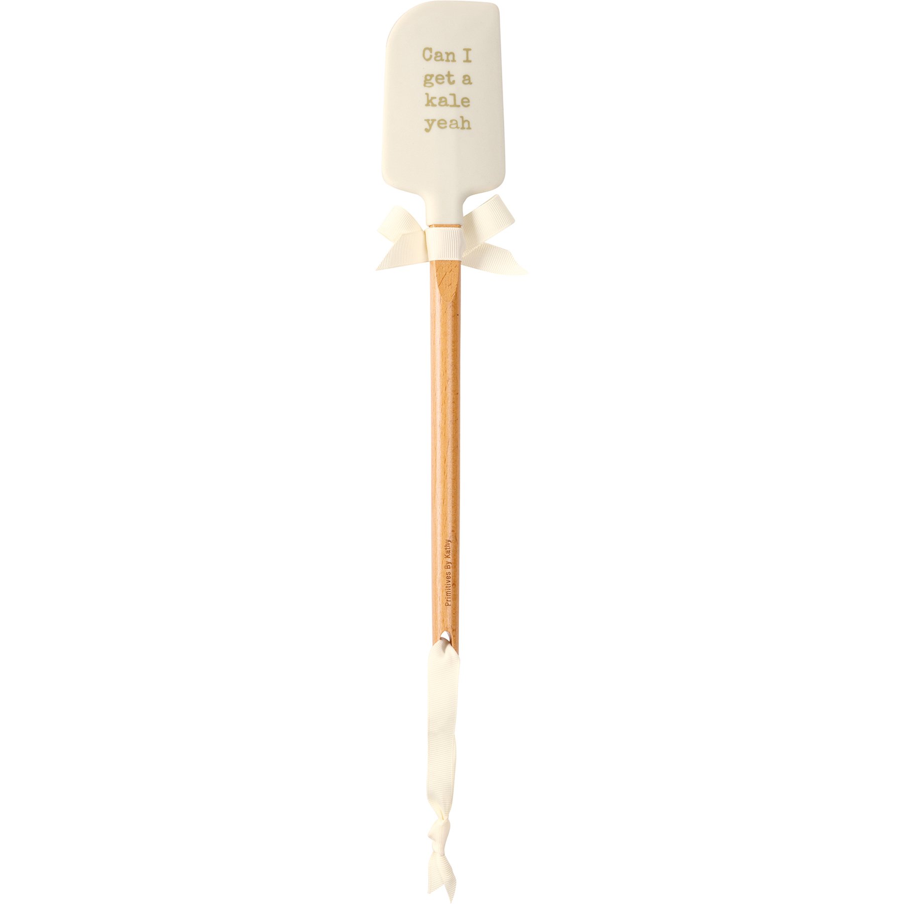 A double-sided silicone spatula from our Kitchen Tools Collection features kale design on one side, and "Can I Get A Kale Yeah" sentiment on the other side. Our Can I Get A Kale Yeah spatula features a logo engraved into wooden handle for added interest and a decorative bow and ribbon for hanging. Hand wash recommended; not microwave safe.