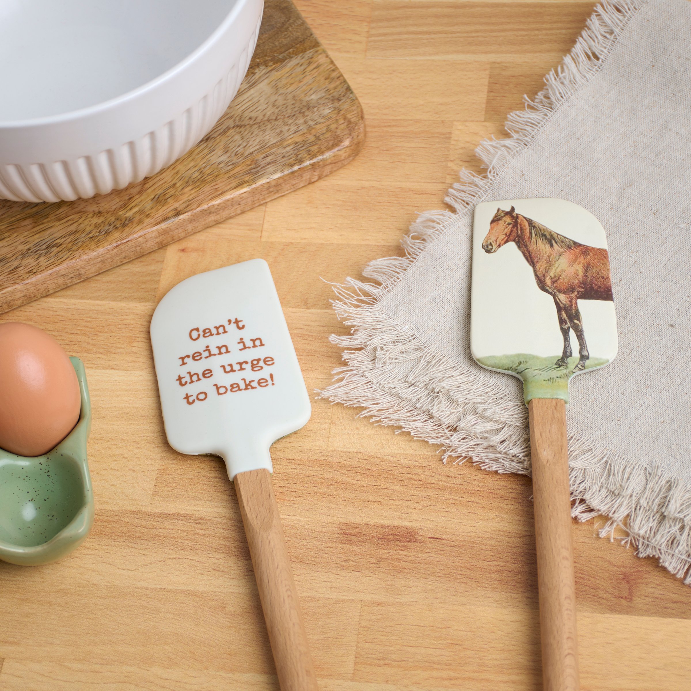 A double-sided silicone spatula from our Farmhouse Collection displaying vintage art of a horse on one side and a horse pun on the other side that reads "Can't Rein In The Urge To Bake!" Our Can't Rein In The Urge To Bake spatula includes a coordinating decorative bow and ribbon at the bottom for hanging. Hand-wash recommended; not microwave safe. A fun farm themed gift perfect for adding personality to any kitchen.