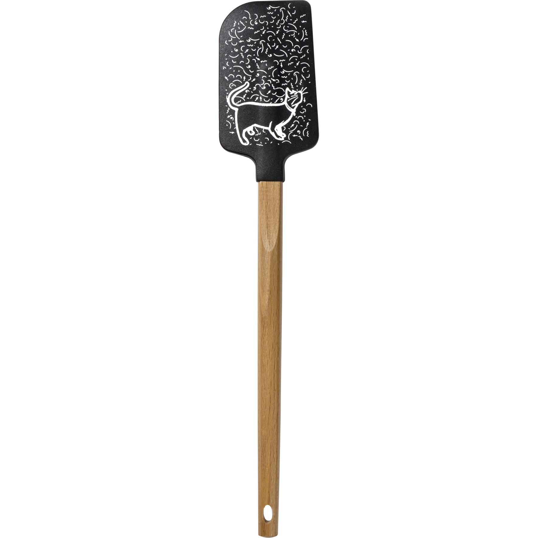 A double-sided silicone spatula displaying a hand illustrated black and white design featuring a cat and cat hair on one side and a fun cat inspired sentiment on the other side that reads "Cat Hair Is Part Of The Recipe." Our Cat Hair spatula includes a coordinating decorative bow and hole at the bottom for hanging. Hand-wash recommended; not microwave safe. A fun pet-themed kitchen accessory perfect for everyday use.