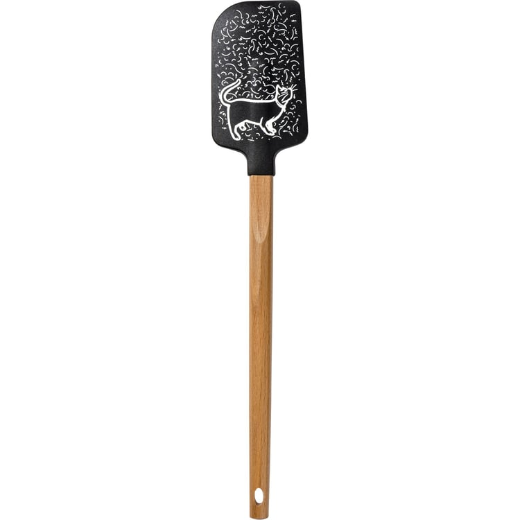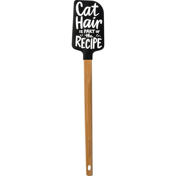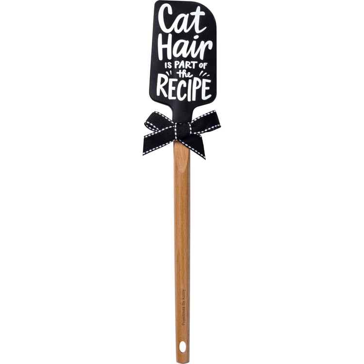 A double-sided silicone spatula displaying a hand illustrated black and white design featuring a cat and cat hair on one side and a fun cat inspired sentiment on the other side that reads "Cat Hair Is Part Of The Recipe." Our Cat Hair spatula includes a coordinating decorative bow and hole at the bottom for hanging. Hand-wash recommended; not microwave safe. A fun pet-themed kitchen accessory perfect for everyday use.