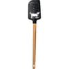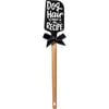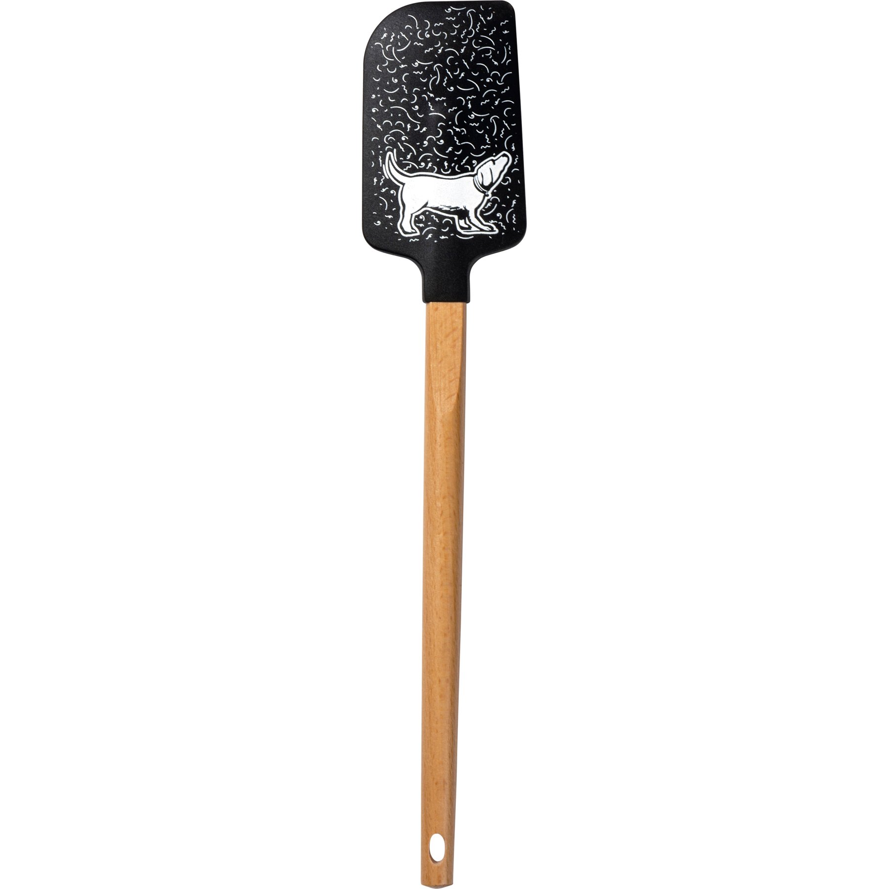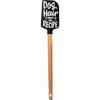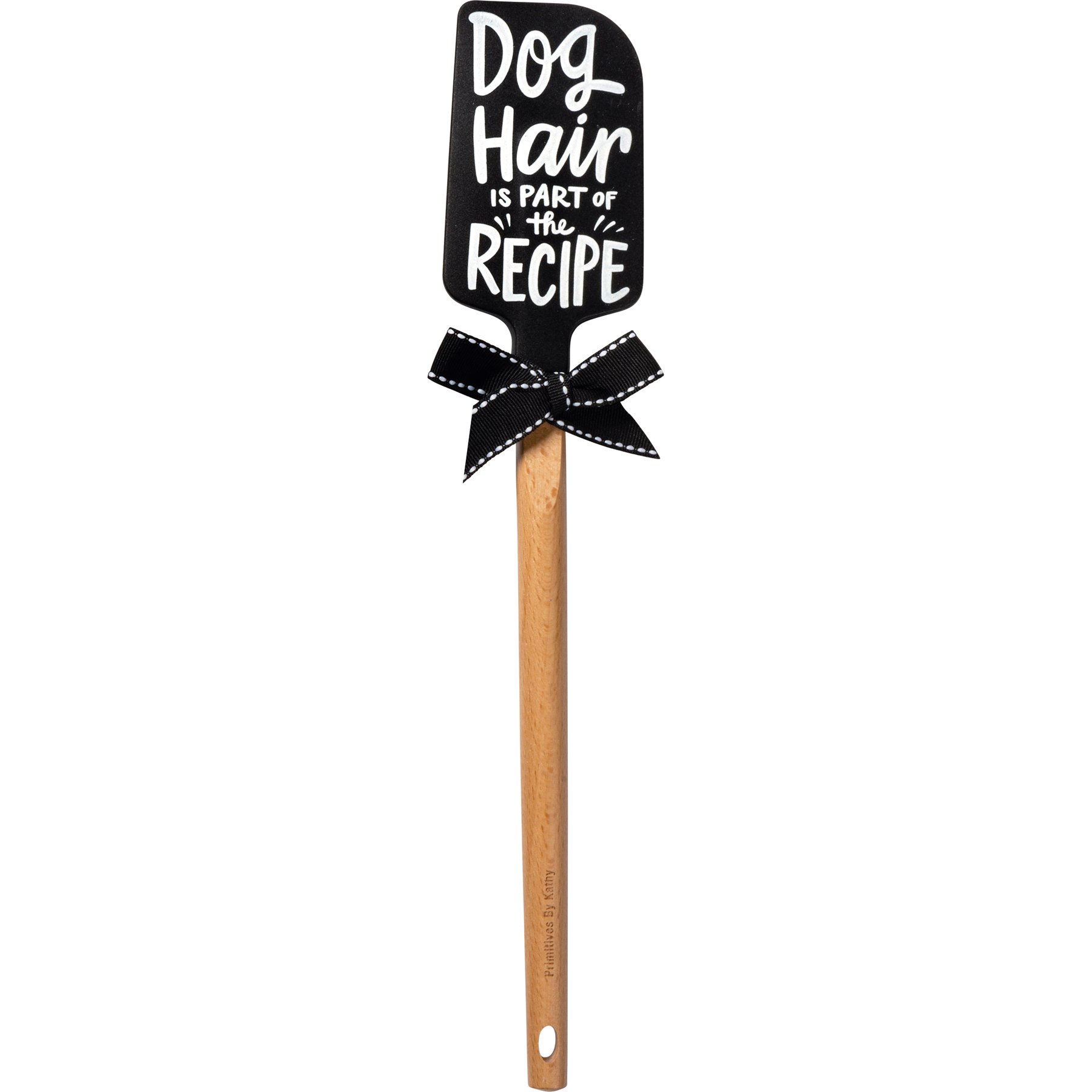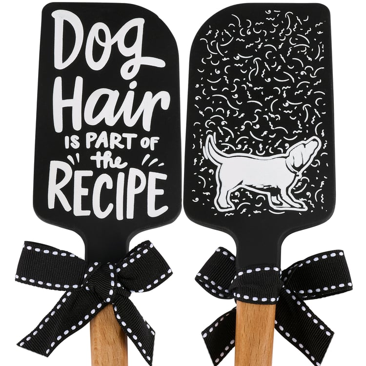 A double-sided silicone spatula displaying a hand illustrated black and white design featuring a dog shaking off fur on one side and a fun dog inspired sentiment on the other side that reads "Dog Hair Is Part Of The Recipe." Our Dog Hair spatula includes a coordinating decorative bow and hole at the bottom for hanging. Hand-wash recommended; not microwave safe. A fun pet-themed kitchen accessory perfect for everyday use.