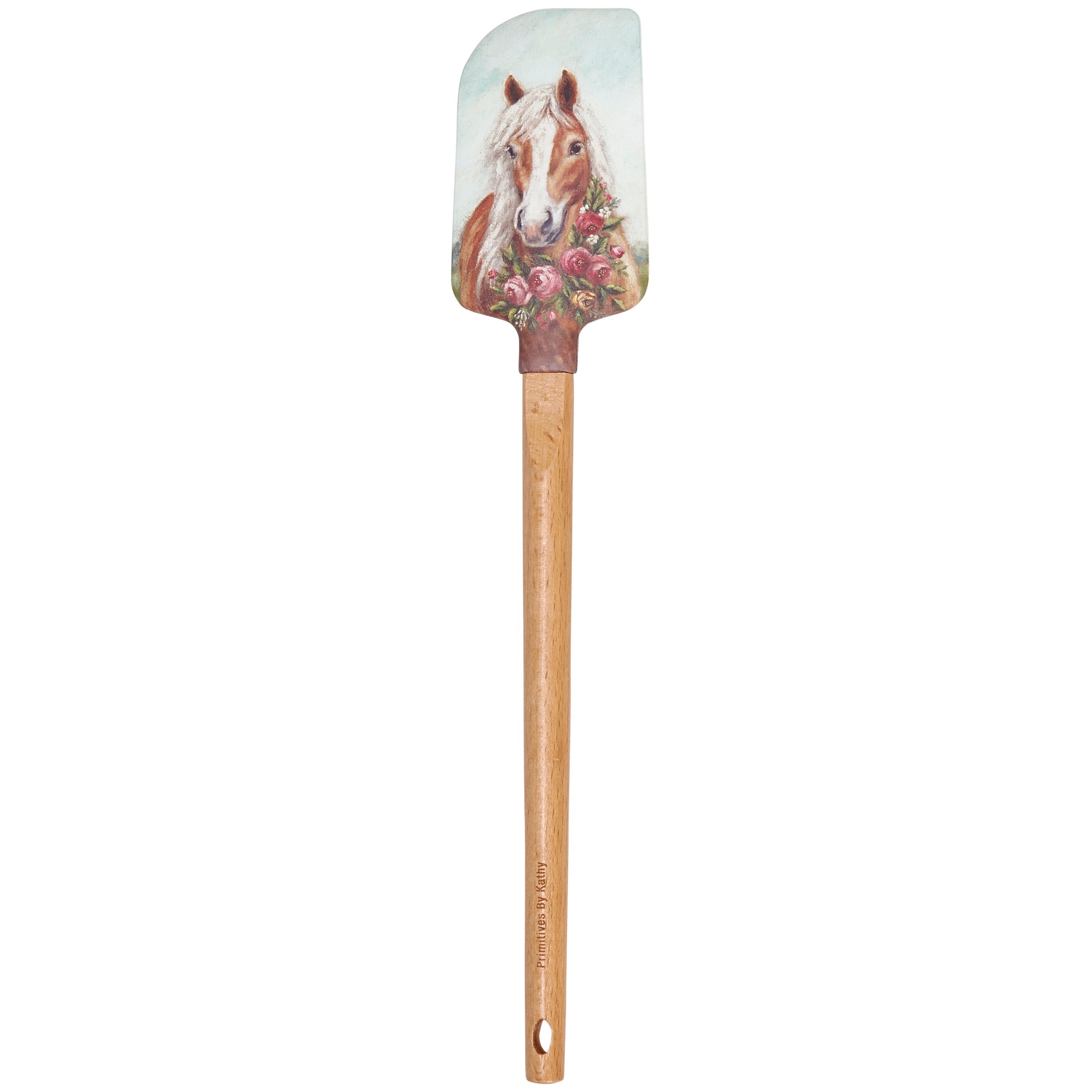 A double-sided silicone spatula from our Easter & Spring Collection displaying a charming design of a pony wearing a wreath of spring florals replicated from original artwork painted onto burlap canvas, giving the art a unique depth and texture. Logo is engraved into wooden handle for added interest. Our Floral Pony spatula includes a coordinating decorative bow and hole at the bottom for hanging. Hand-wash recommended; not microwave safe. A rustic kitchen accessory perfect for seasonal use.