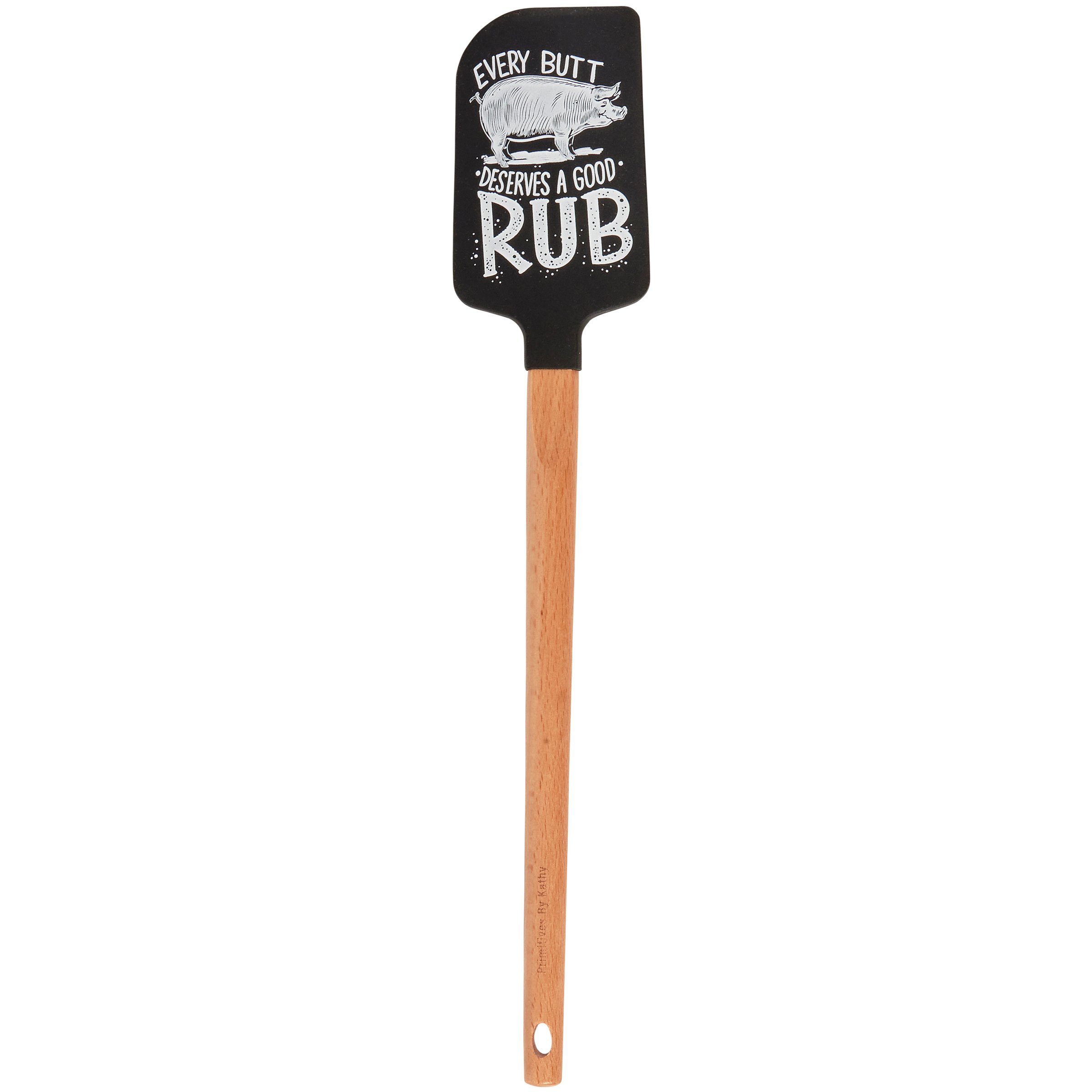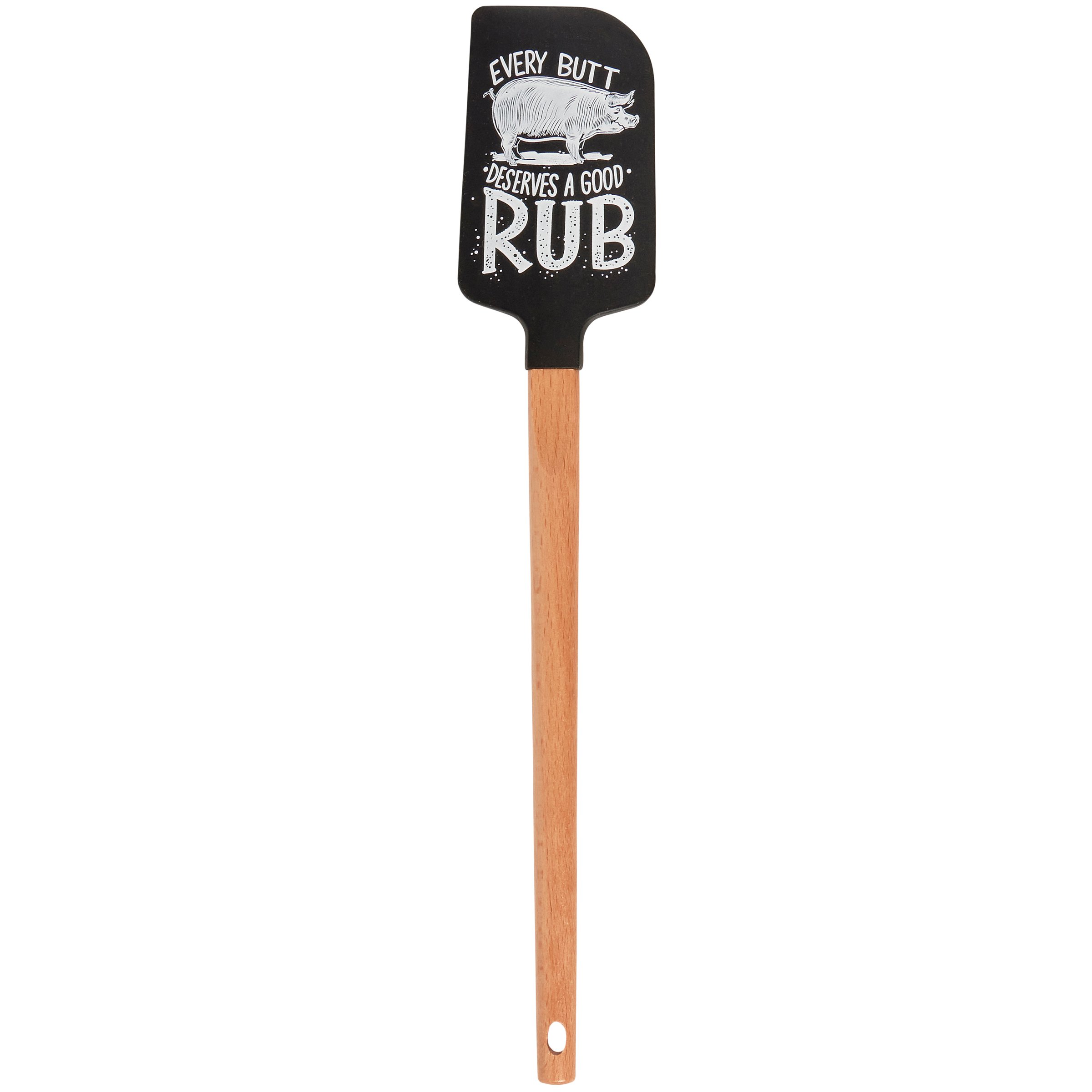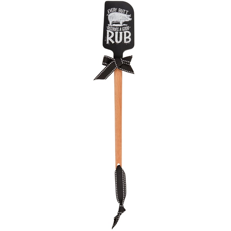 A double-sided silicone spatula from our LOL-Made You Smile Collection displaying a hand illustrated black and white design of a pig with a fun grilling-themed sentiment that reads "Every Butt Deserves A Good Rub." Logo is engraved into wooden handle for added interest. Our Good Rub spatula includes a complementing decorative bow and hole at the bottom for hanging. Hand-wash recommended; not microwave safe. A fun grilling-themed kitchen accessory perfect for everyday use.