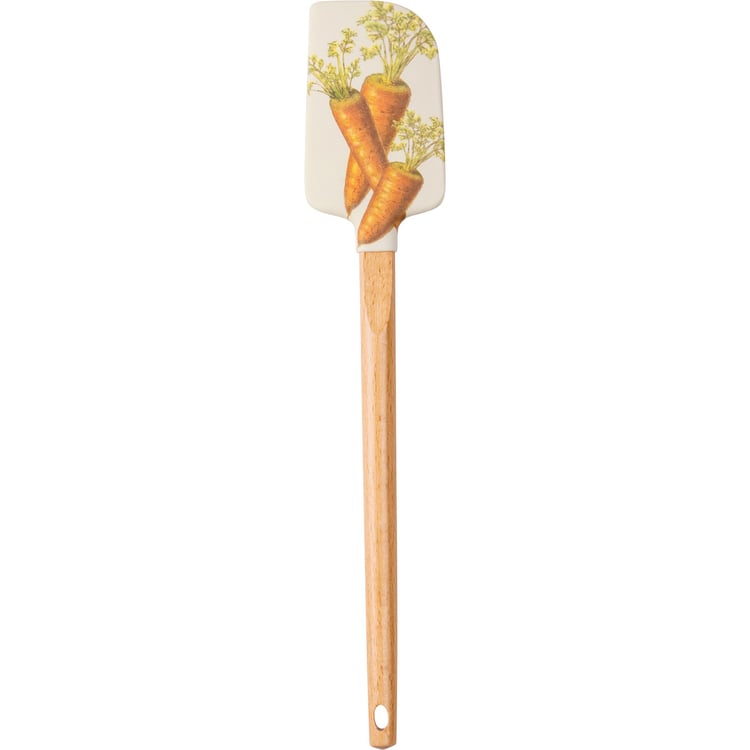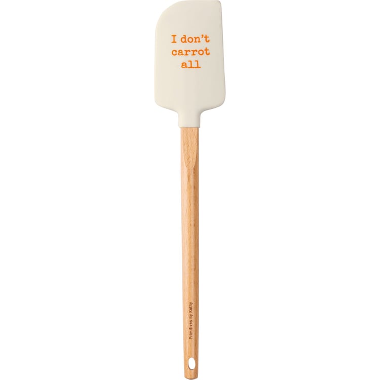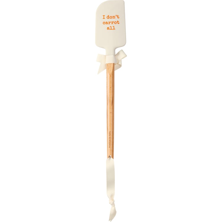 A double-sided silicone spatula from our Kitchen Tools Collection features carrot designs on one side, and "I Don't Carrot All" sentiment on the other side. Our I Don't Carrot All spatula features a logo engraved into wooden handle for added interest and includes a decorative bow and ribbon for hanging. Hand wash recommended; not microwave safe.