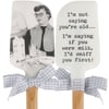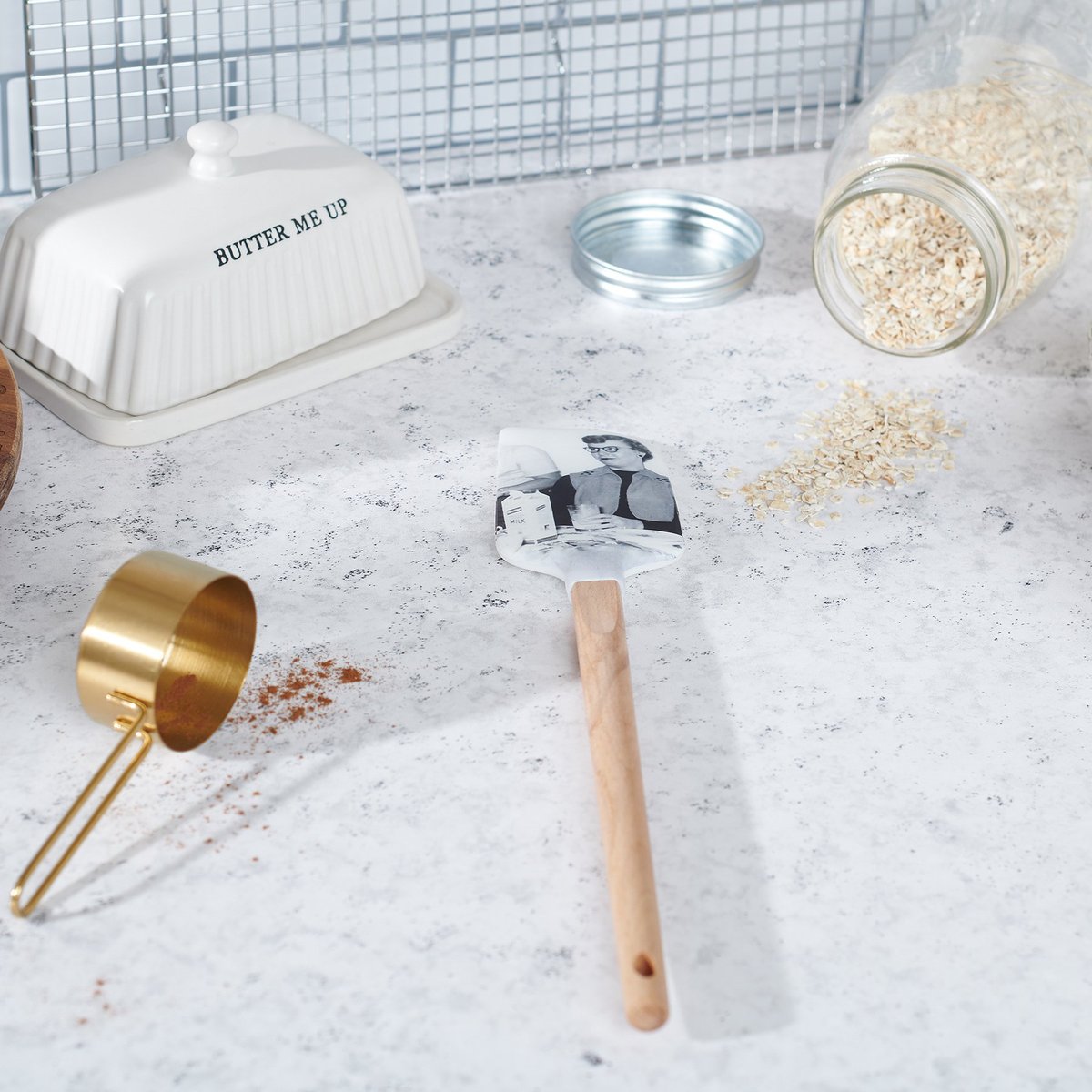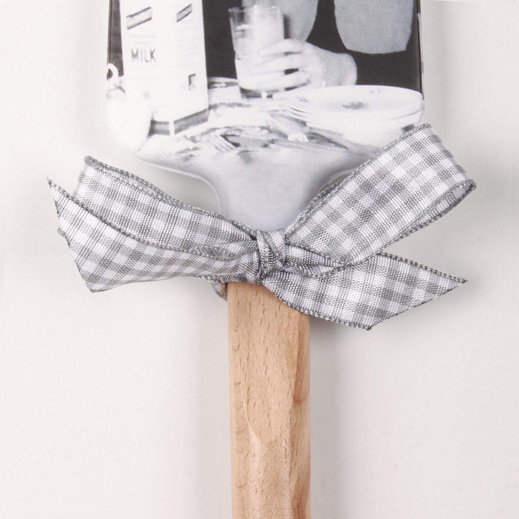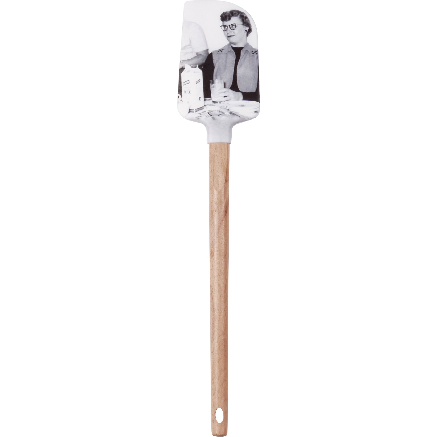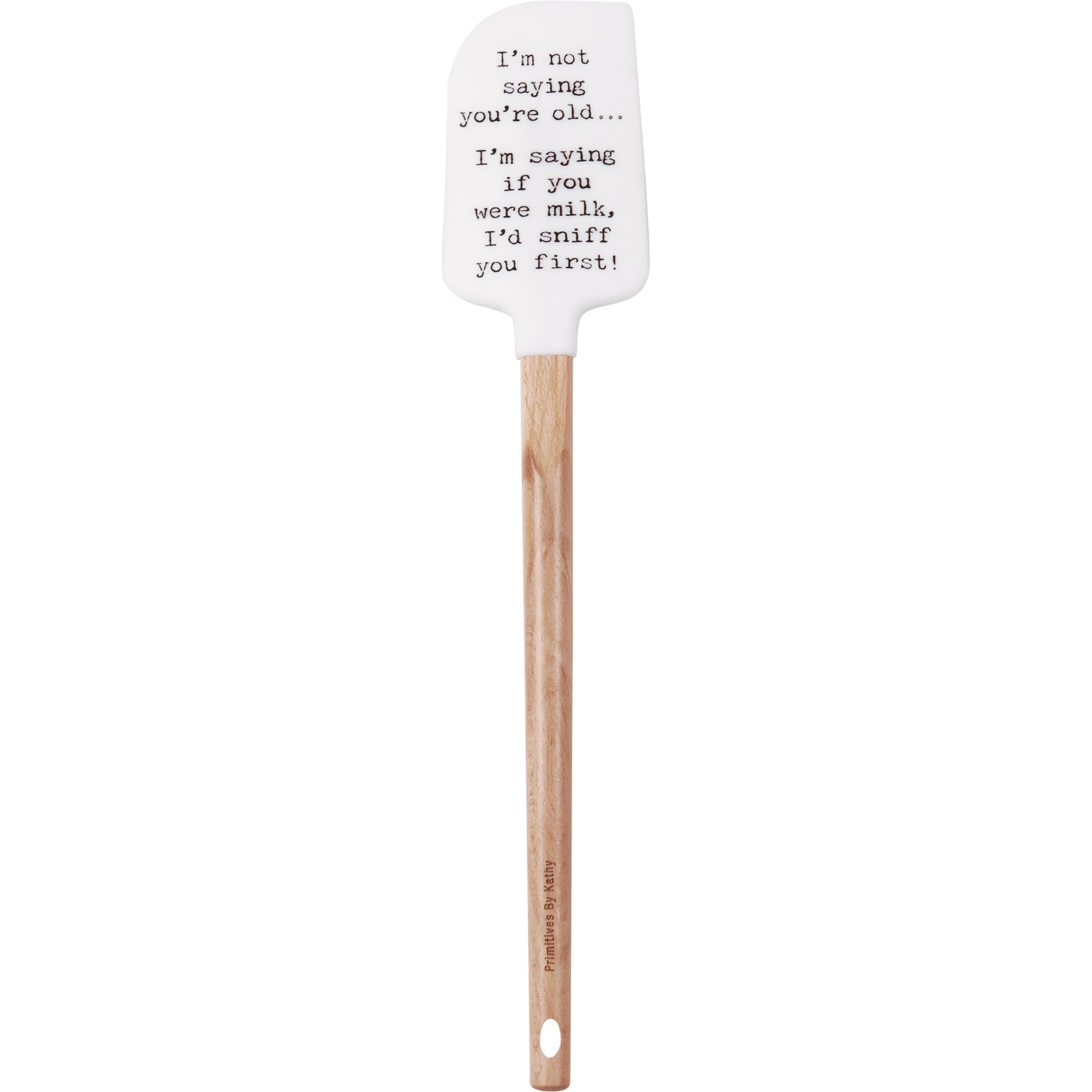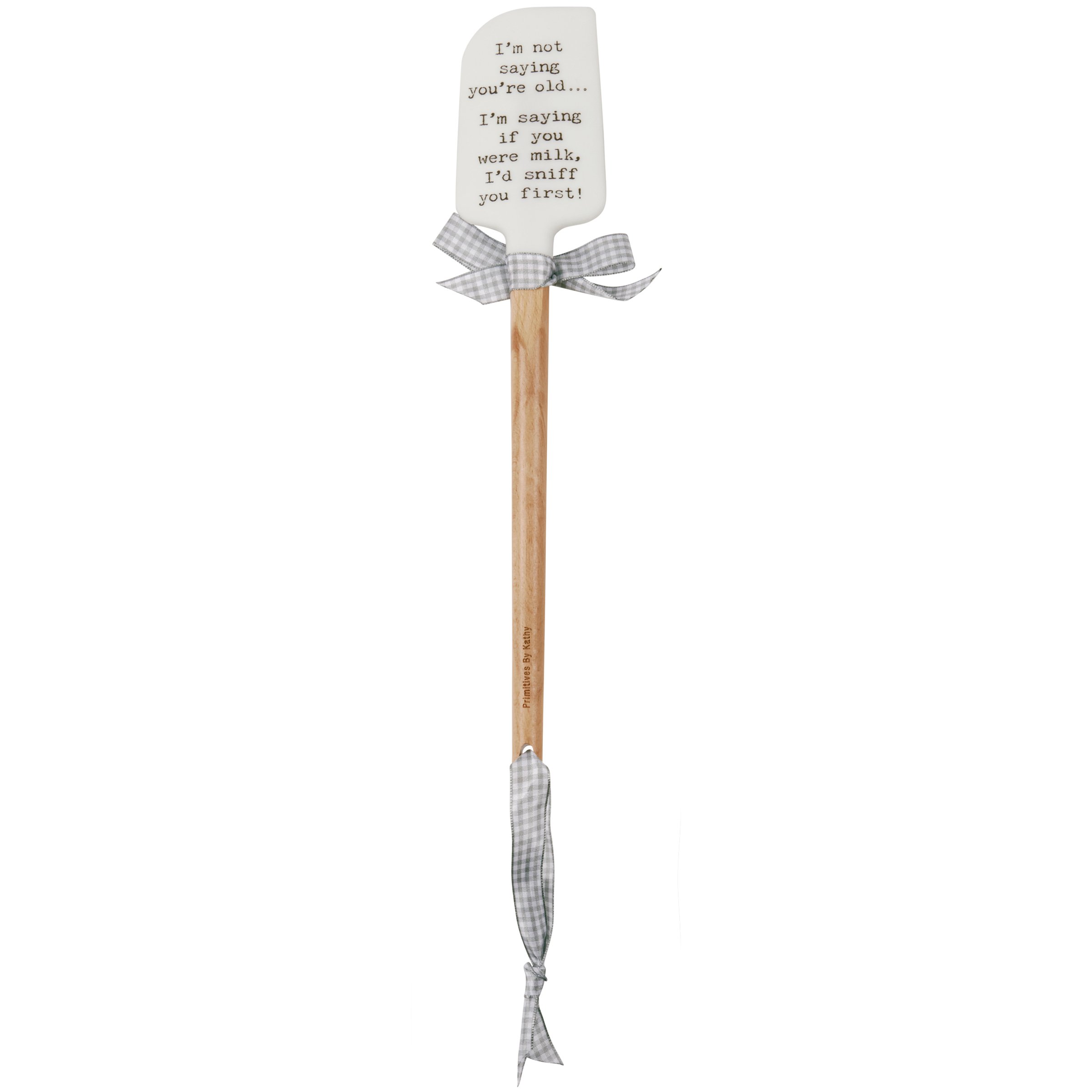 A double-sided silicone spatula from our Trash Talk by Annie Collection features a vintage photograph on one side, and "I'm Not Saying You're Old...I'm Saying If You Were Milk, I'd Sniff You First!" sentiment on the other side. Logo is engraved into wooden handle for added interest and includes a decorative gray and white gingham bow and ribbon for hanging. The If You Were Milk spatula is hand-wash recommended; not microwave safe.
