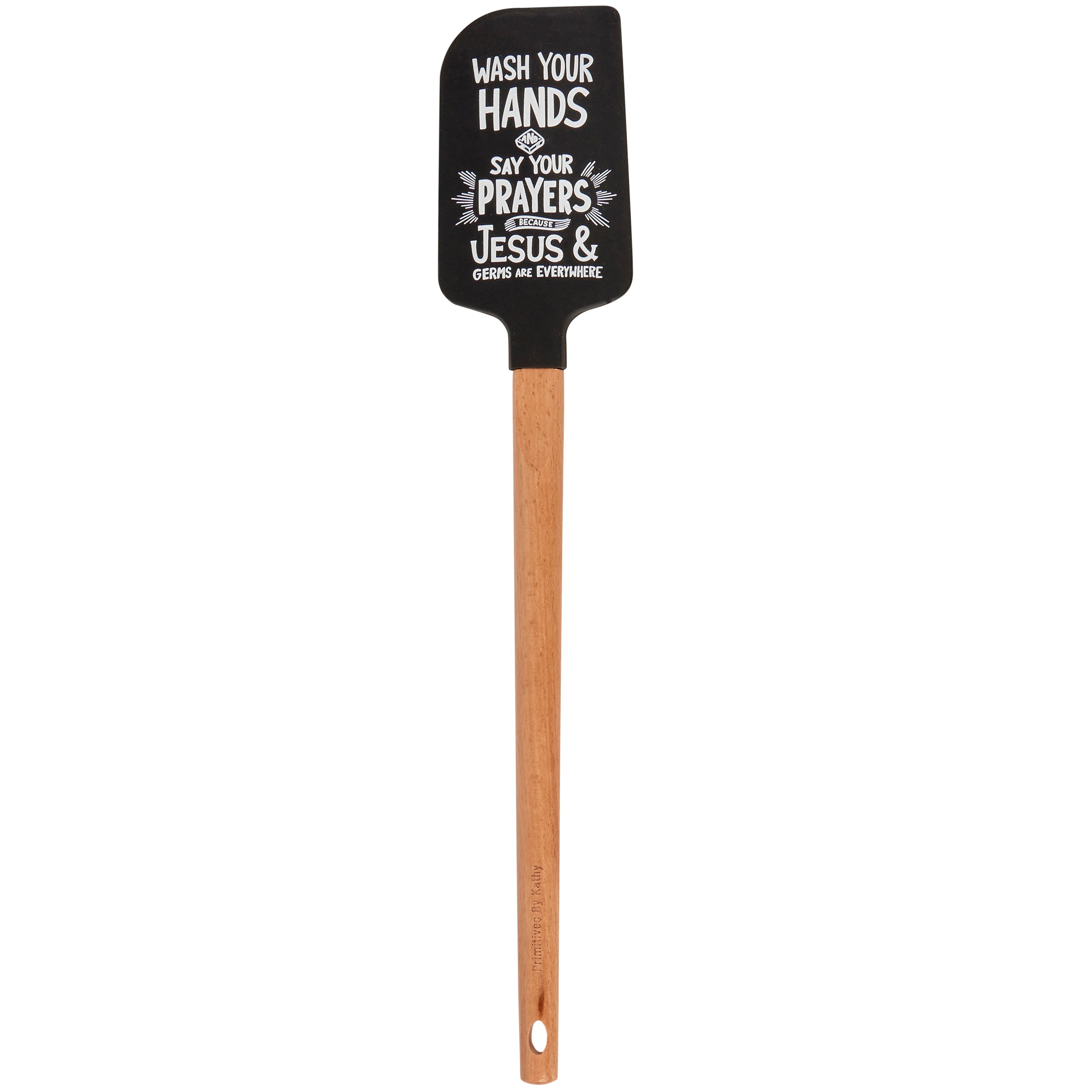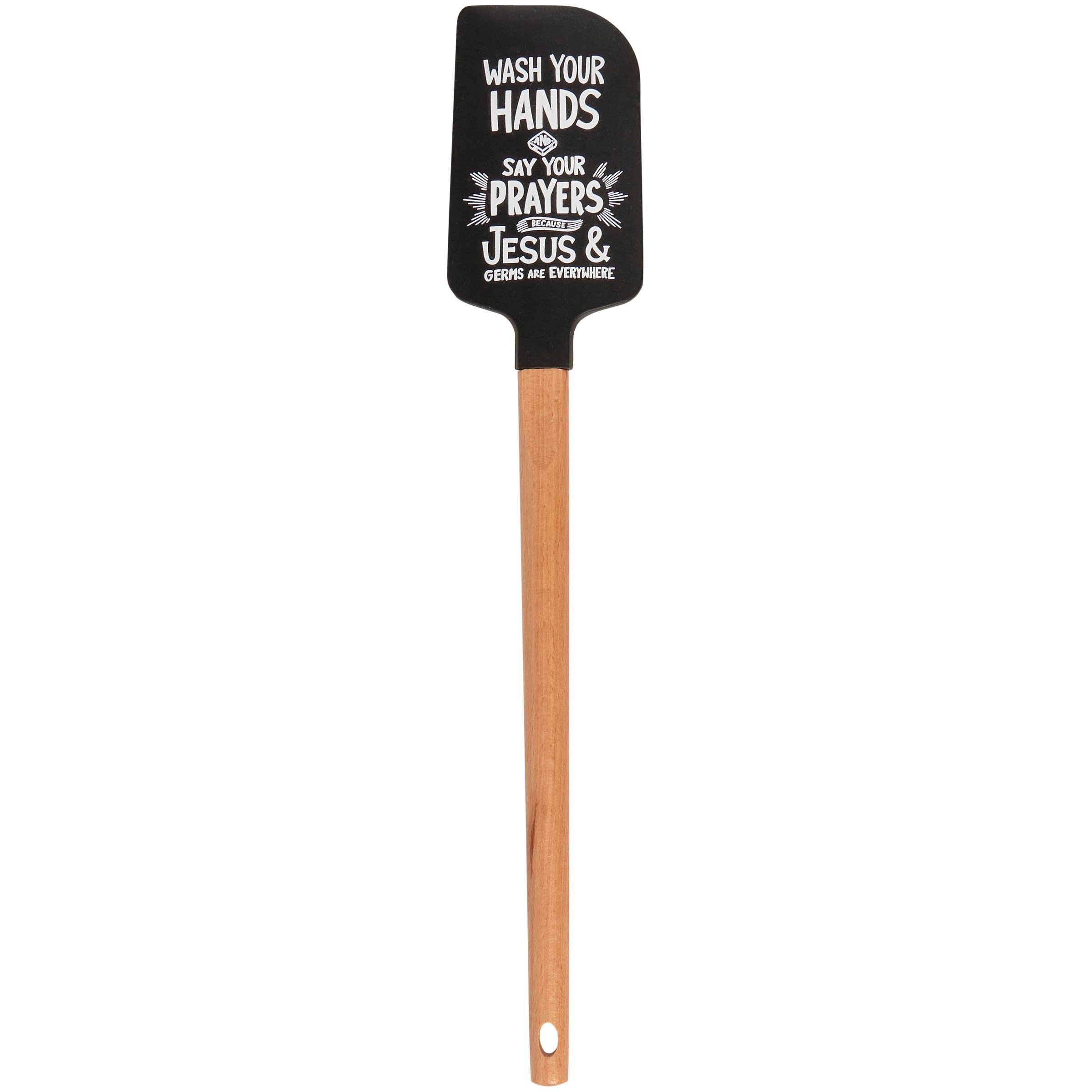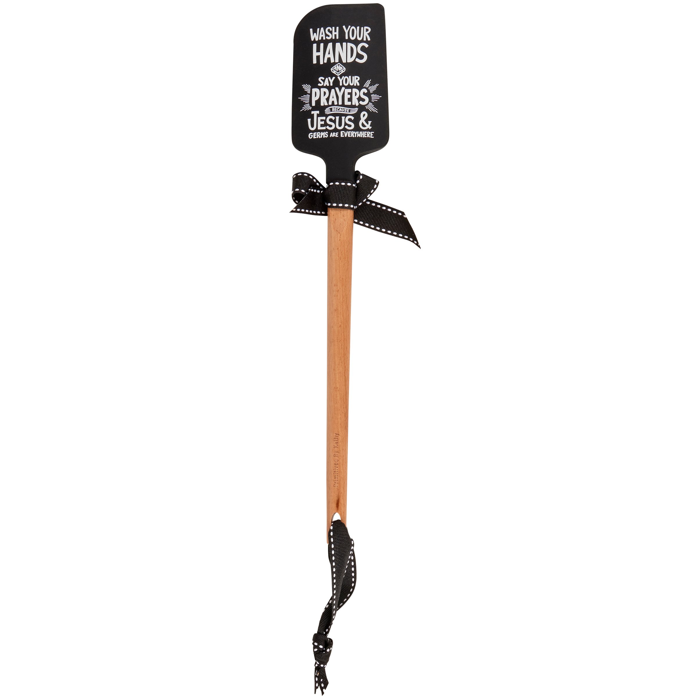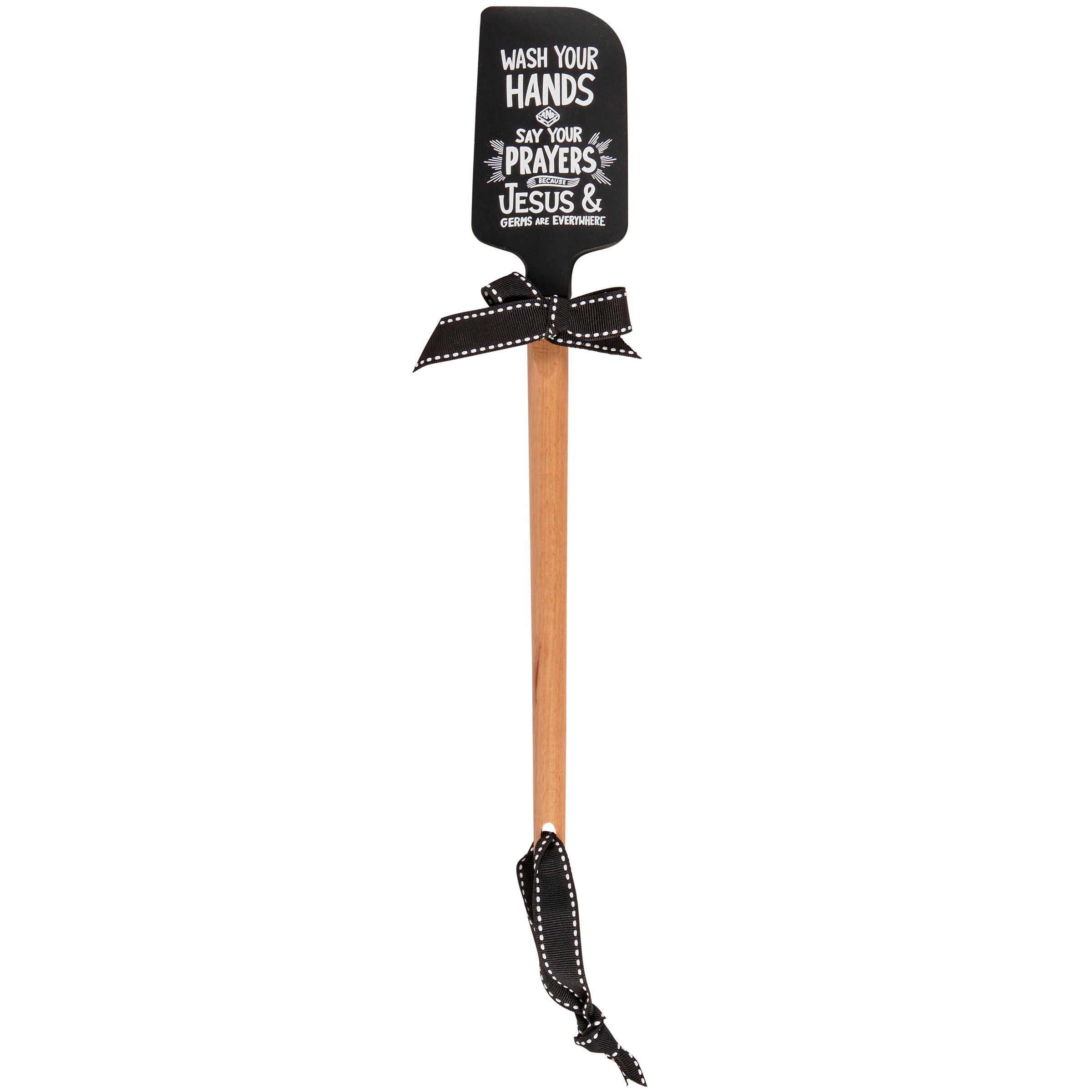 A double-sided silicone spatula from our LOL-Made You Smile Collection displaying a hand illustrated black and white sentiment that reads "Wash Your Hands And Say Your Prayers Because Jesus & Germs Are Everywhere." Logo is engraved into wooden handle for added interest. Our Jesus & Germs spatula includes a complementing decorative bow and hole at the bottom for hanging. Hand-wash recommended; not microwave safe. A fun kitchen accessory perfect for everyday use.
