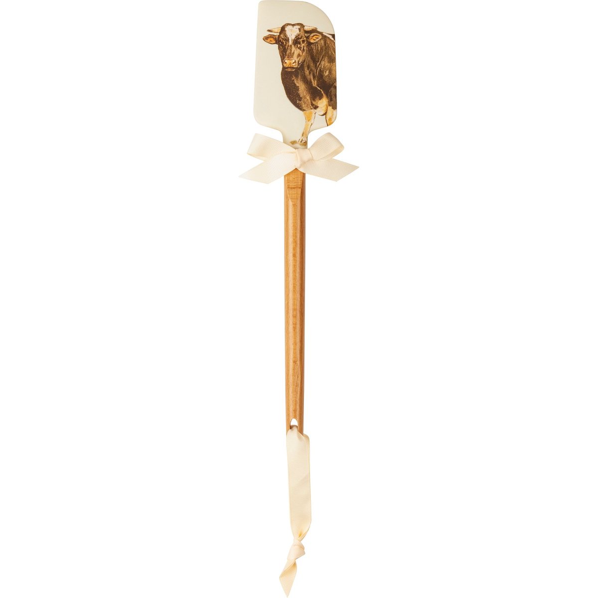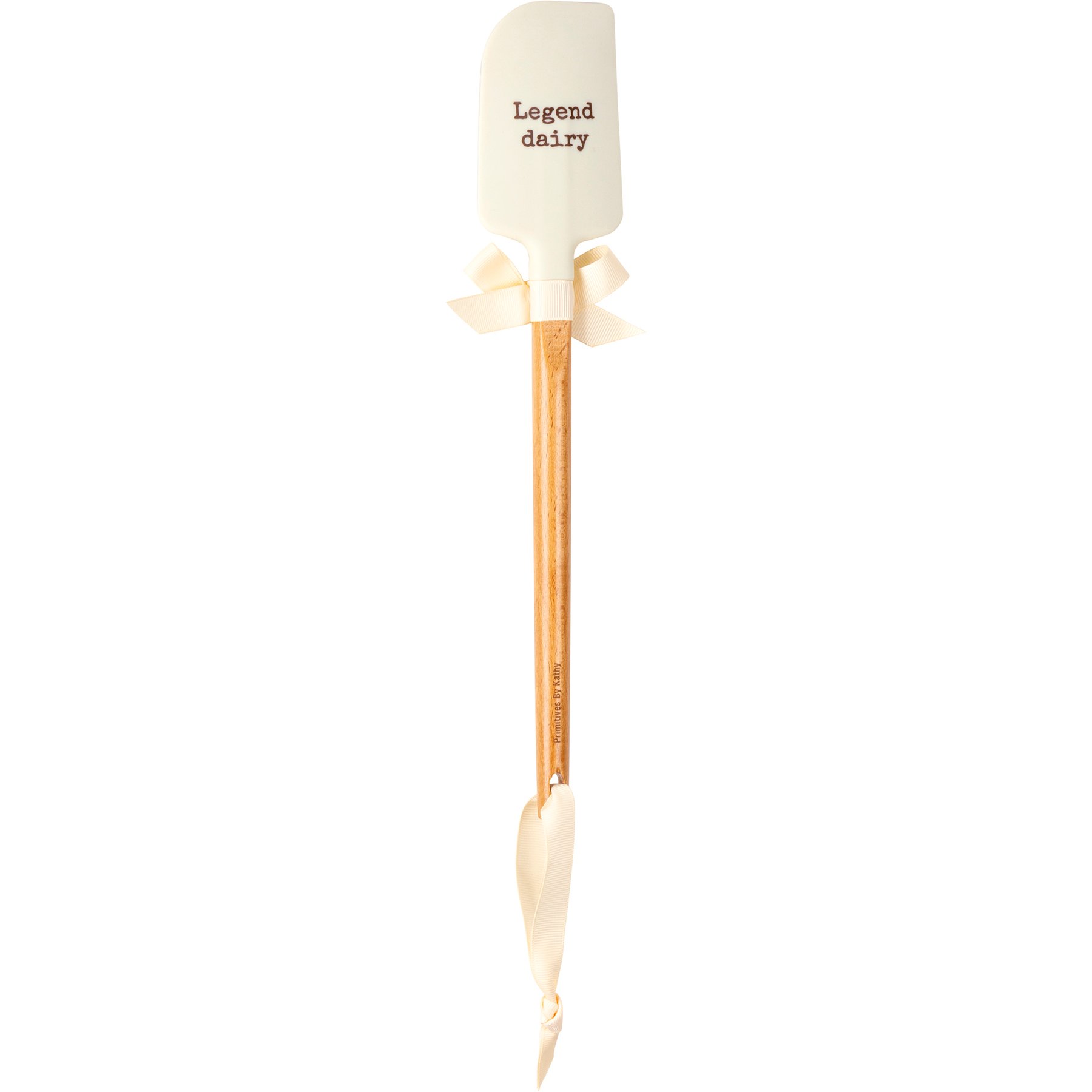 A double-sided silicone spatula featuring vintage-style cow design on one side, and punny "Legend Dairy" sentiment on the other side. Our Legend Dairy spatula features a logo engraved into wooden handle for added interest and includes a decorative bow and ribbon for hanging. Hand wash recommended; not microwave safe.
