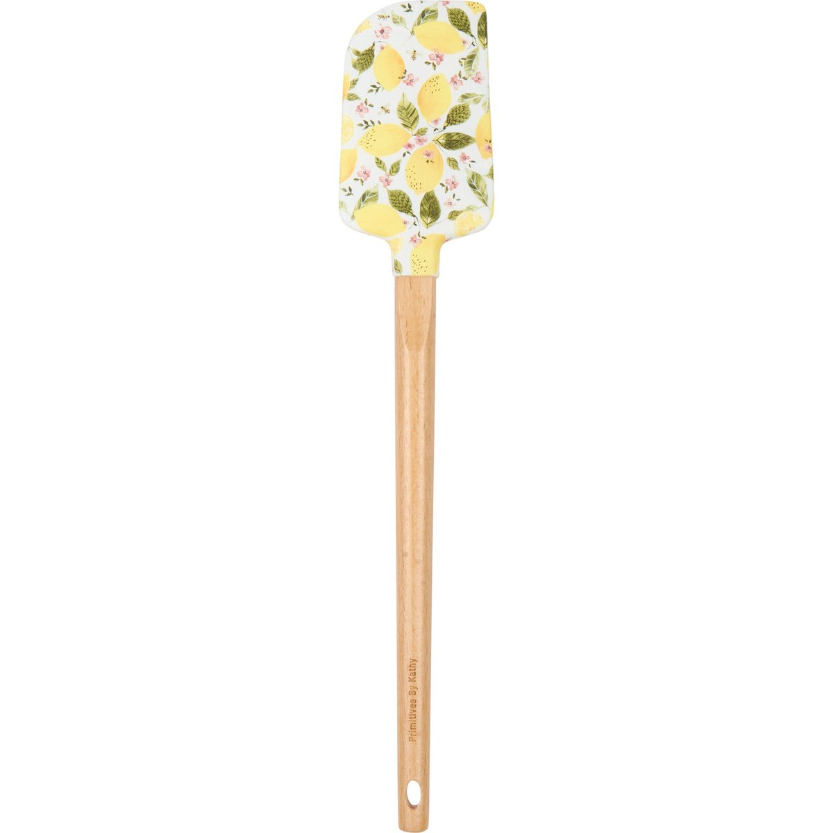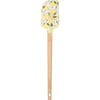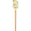 A double-sided silicone spatula from our Garden Collection displaying delightful watercolor art of lemons and flowers. Logo is engraved into wooden handle for added interest. Our Lemon spatula includes a complementing decorative bow and hole at the bottom for hanging. Hand-wash recommended; not microwave safe.