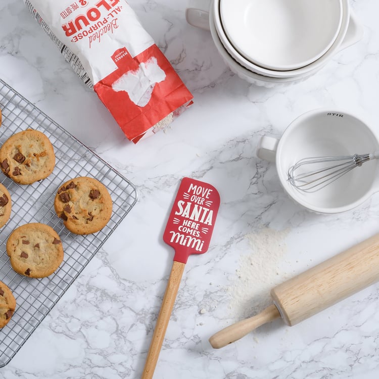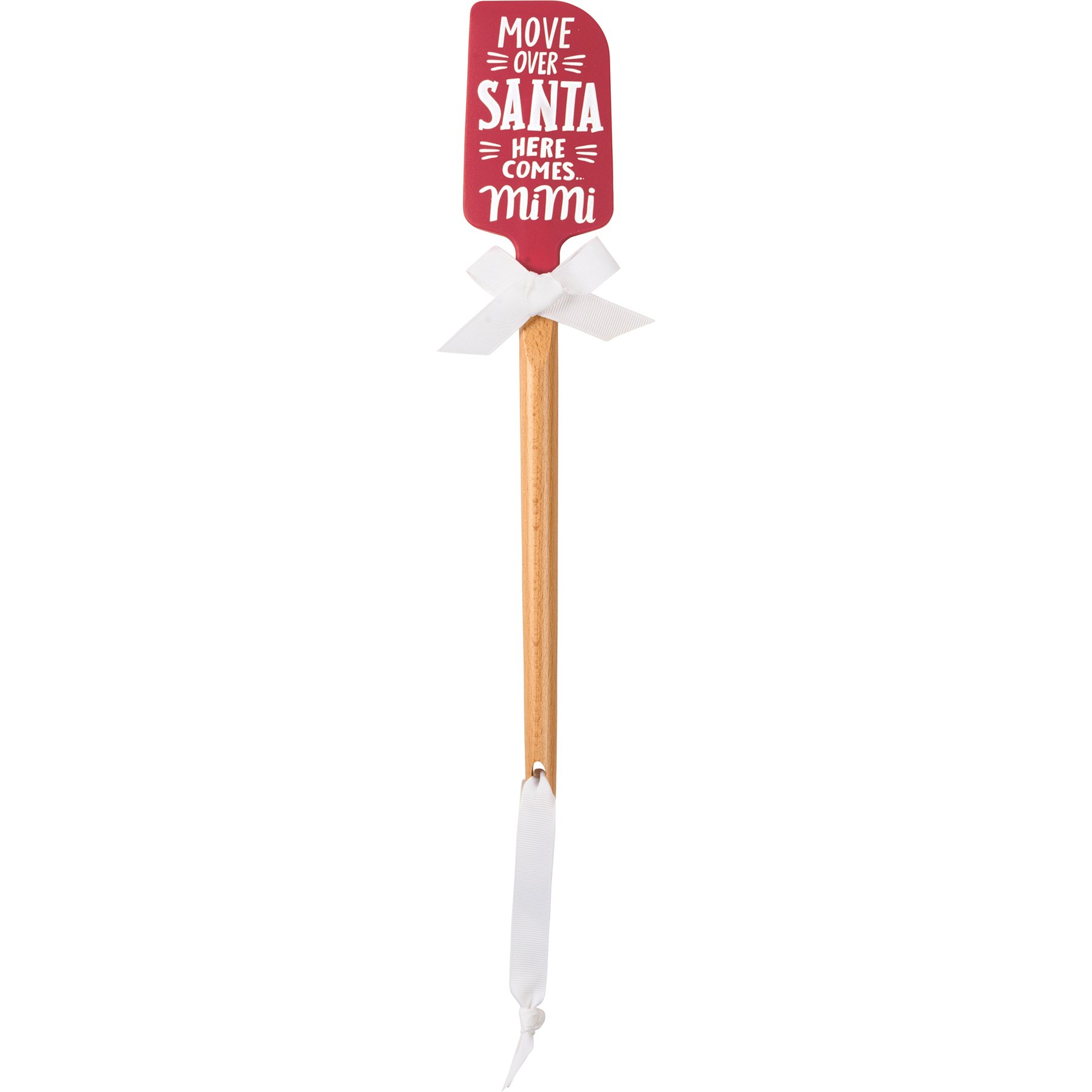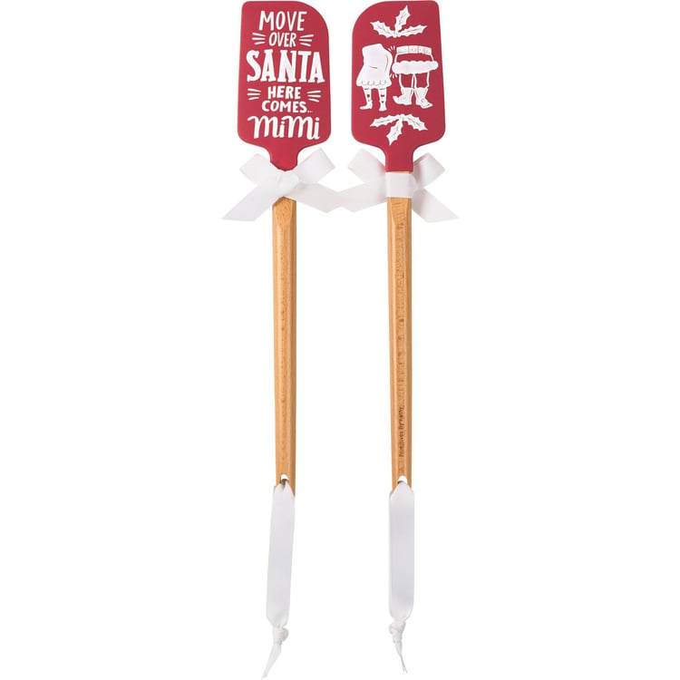 A double-sided silicone spatula from our Christmas Collection features "Move Over Santa Here Comes Mimi" sentiment on one side, and holly branch, grandma, and Santa designs on the other side. Our Move Over Santa Here Comes Mimi spatula features a logo engraved into wooden handle for added interest and a decorative bow and ribbon for hanging. Hand-wash recommended; not microwave safe.