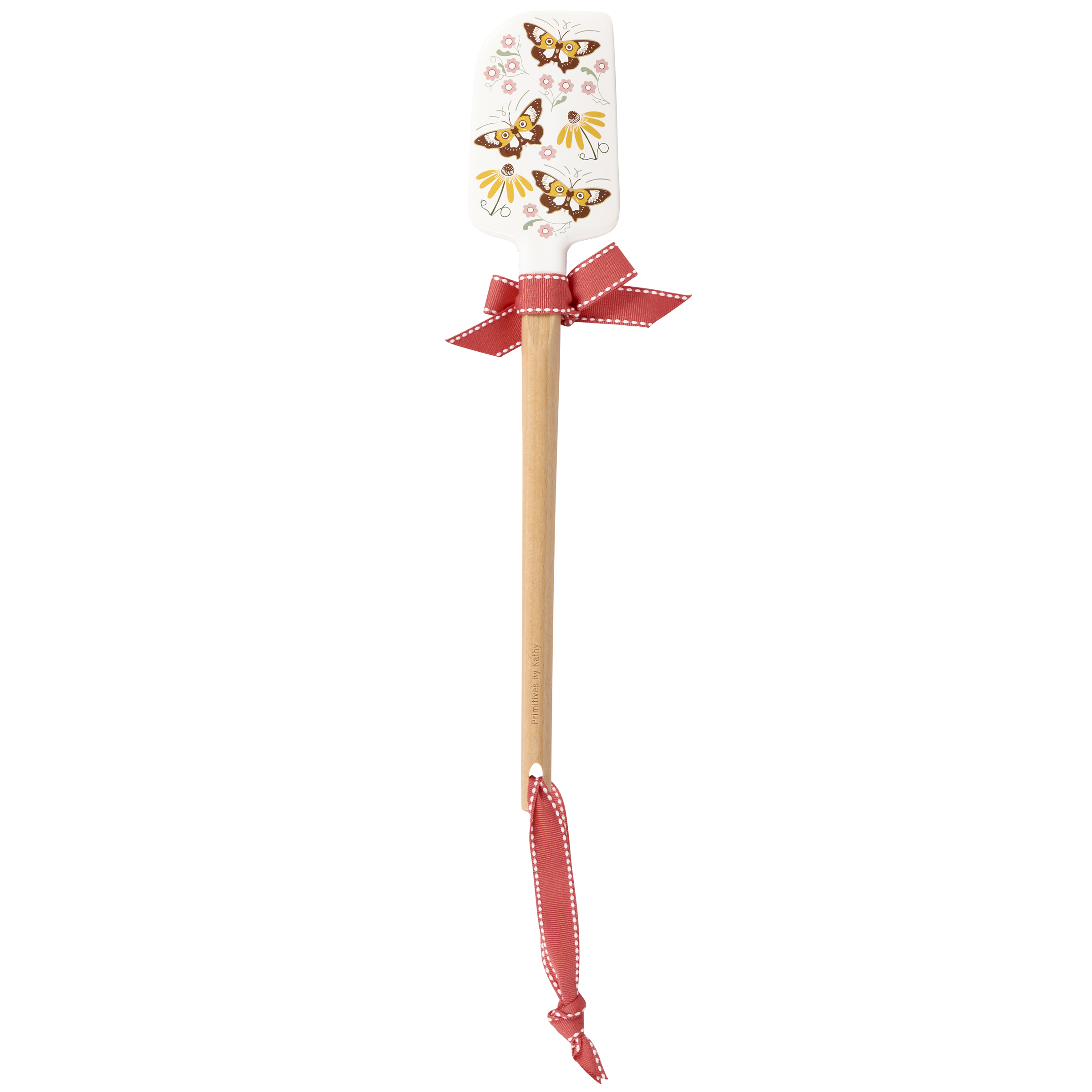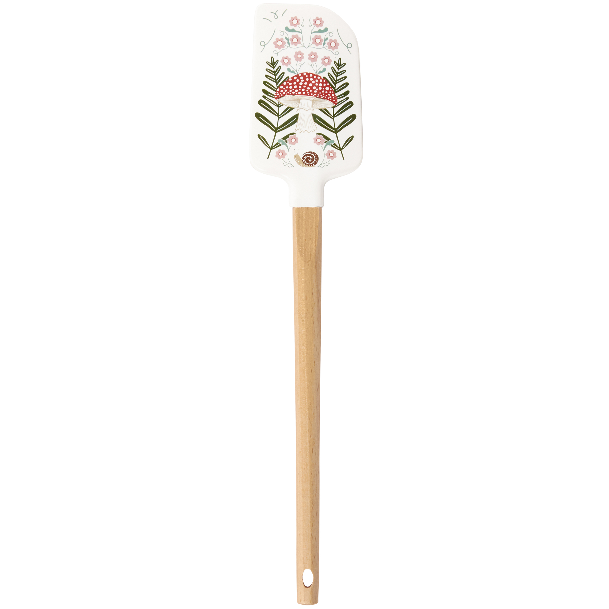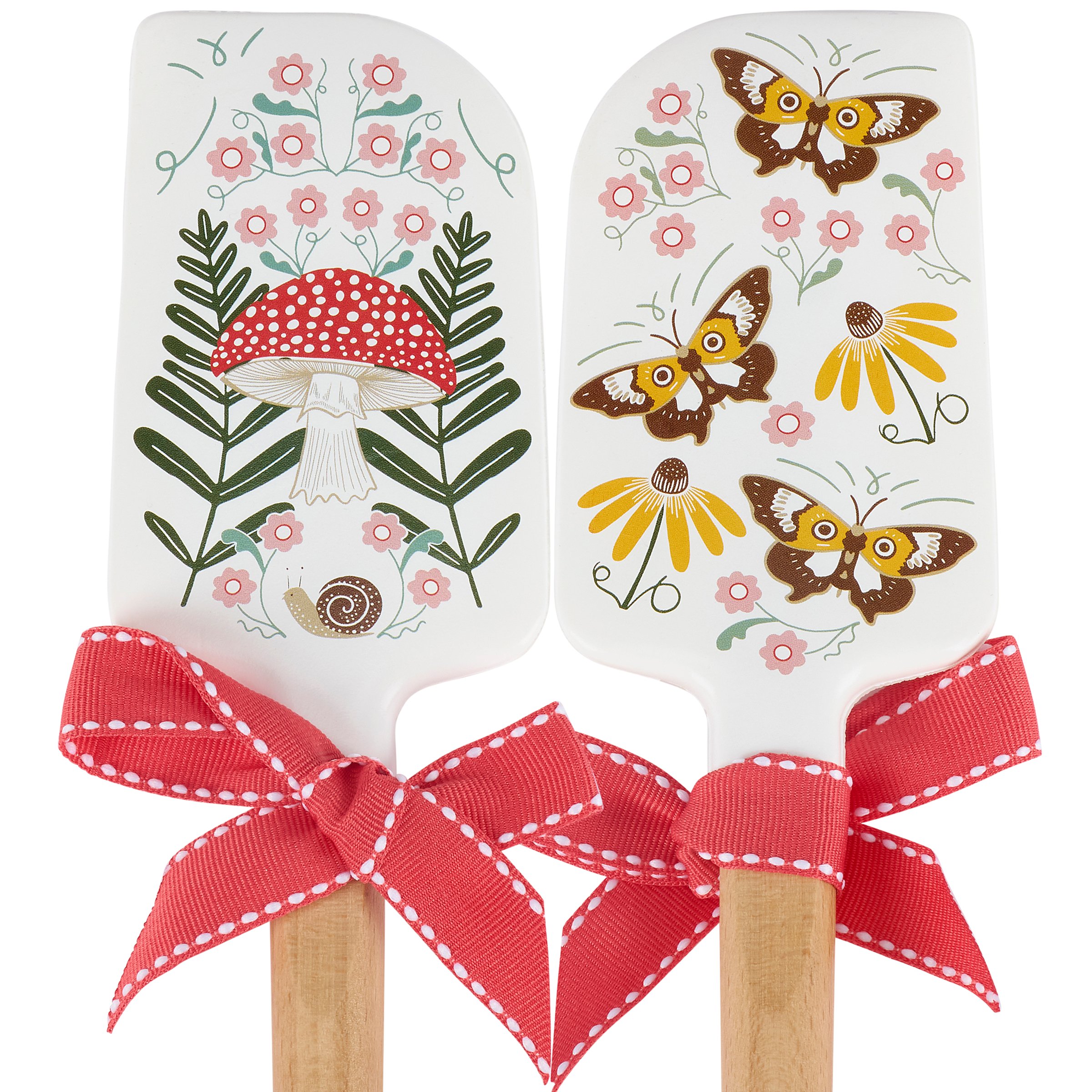 A double-sided silicone spatula from our Cottagecore Collection displaying folk art inspired patterns of a mushroom, flowers, and butterflies replicated from original hand illustrated art. Our Mushroom Art spatula includes a coordinating decorative bow and ribbon at the bottom for hanging. Hand-wash recommended; not microwave safe. A nature-themed kitchen accessory perfect for everyday use.