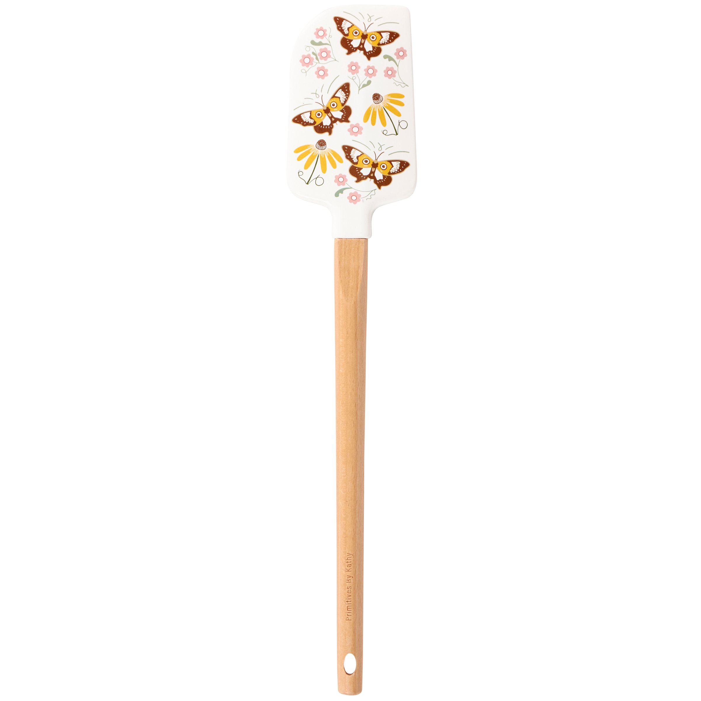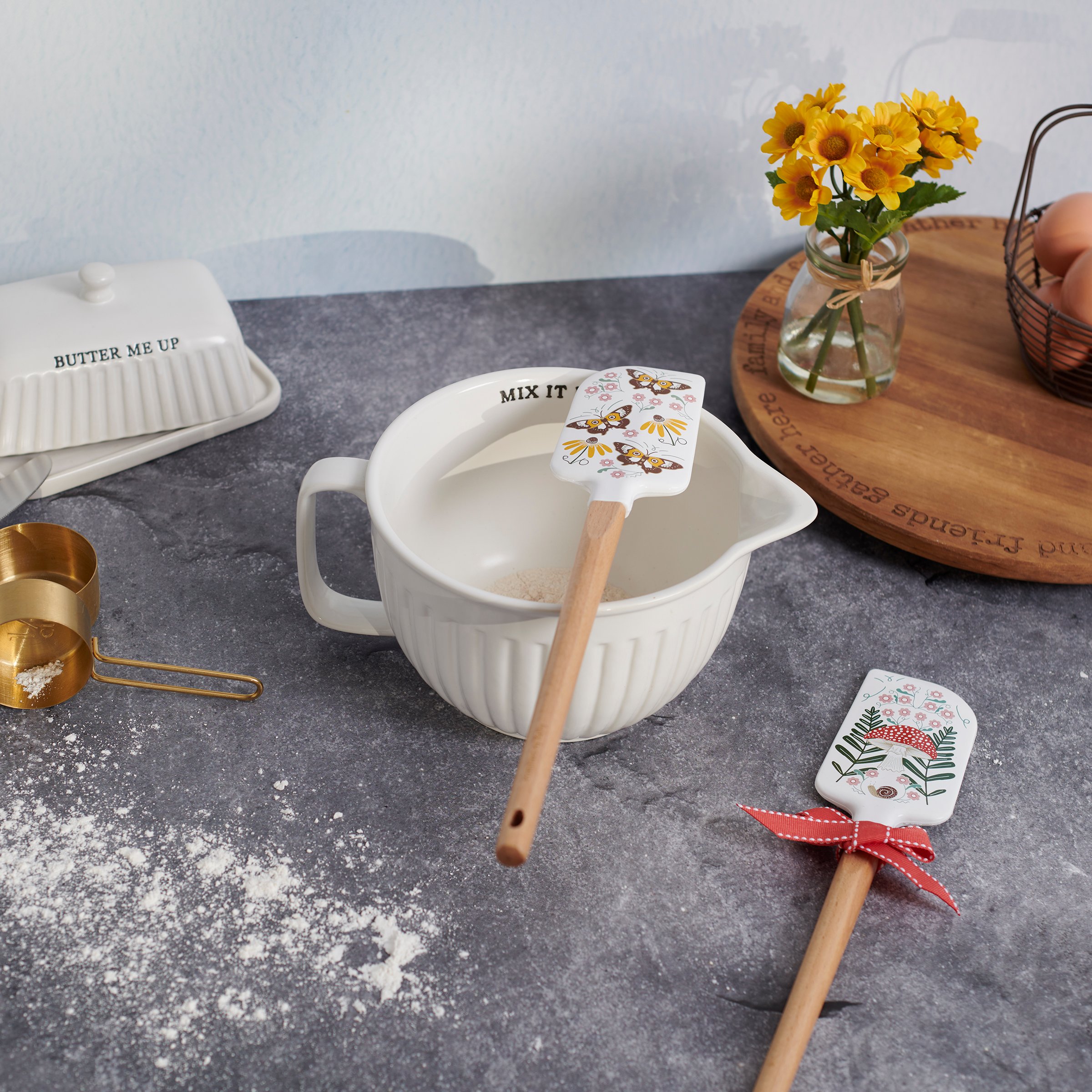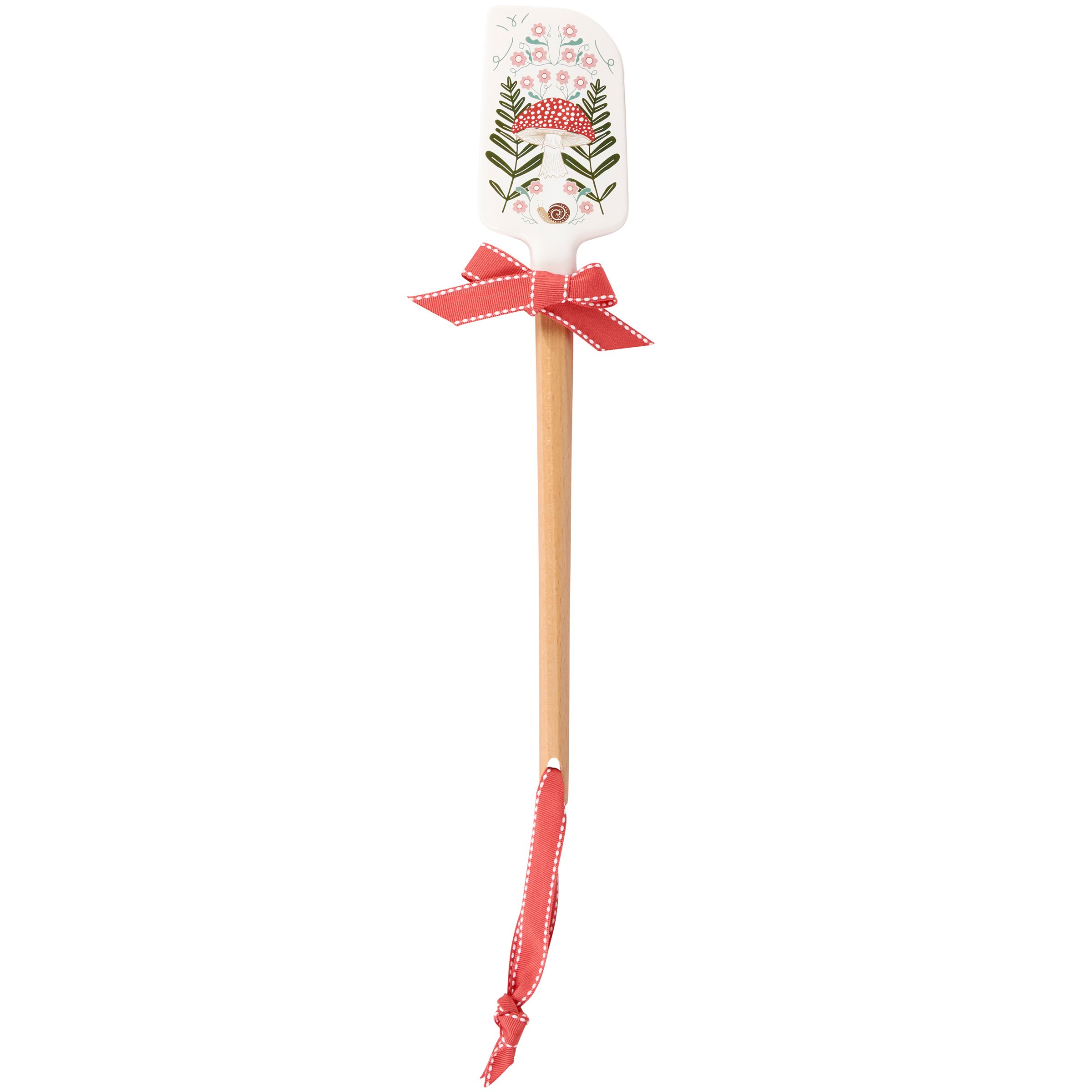 A double-sided silicone spatula from our Cottagecore Collection displaying folk art inspired patterns of a mushroom, flowers, and butterflies replicated from original hand illustrated art. Our Mushroom Art spatula includes a coordinating decorative bow and ribbon at the bottom for hanging. Hand-wash recommended; not microwave safe. A nature-themed kitchen accessory perfect for everyday use.