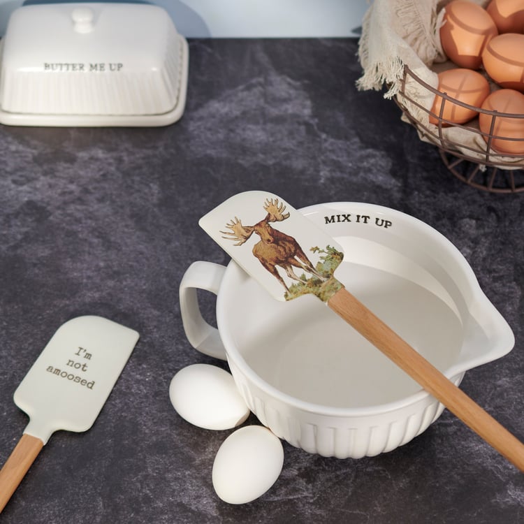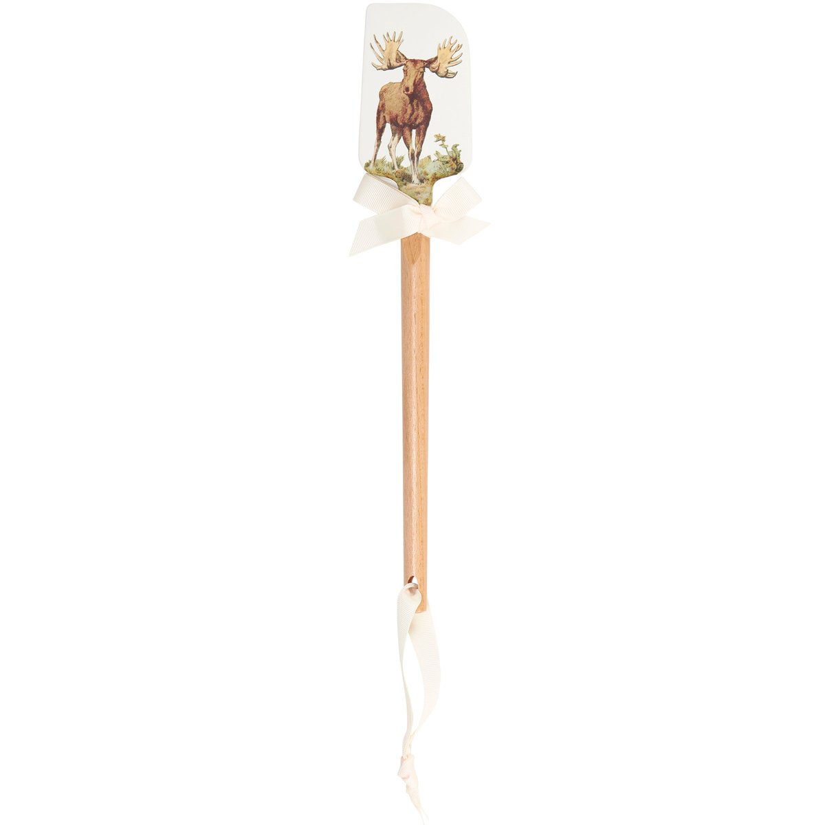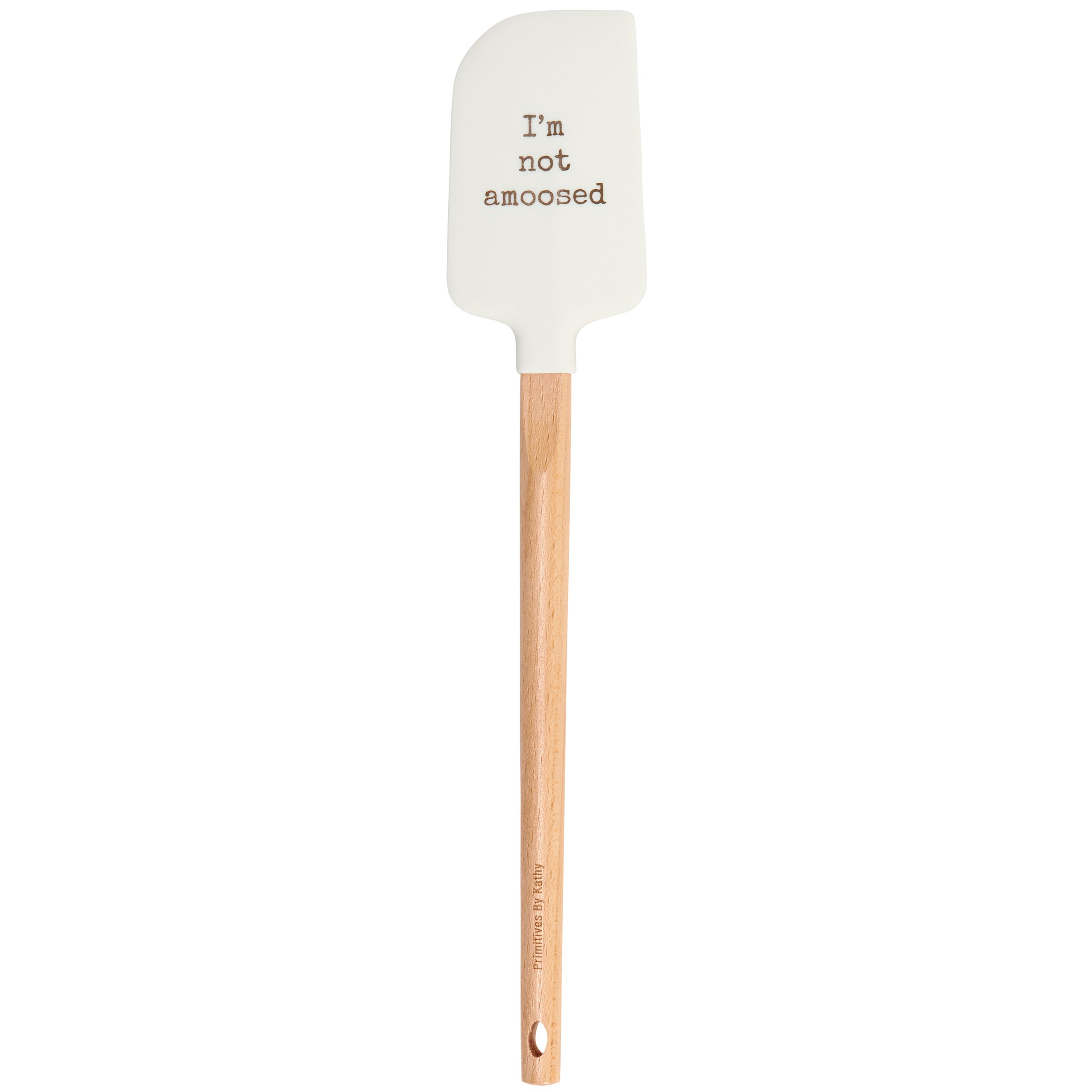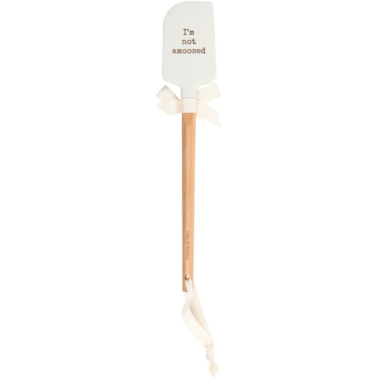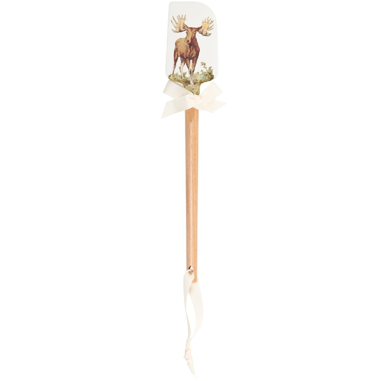 A double-sided silicone spatula from our Lake & Cabin Collection displaying vintage art of a moose on one side and punny sentiment on the other side that reads "I'm Not Amoosed." Logo is engraved into wooden handle for added interest. Our Not Amoosed spatula includes a complementing decorative bow and hole at the bottom for hanging. Hand-wash recommended; not microwave safe. A fun outdoor-themed kitchen accessory perfect for everyday use.
