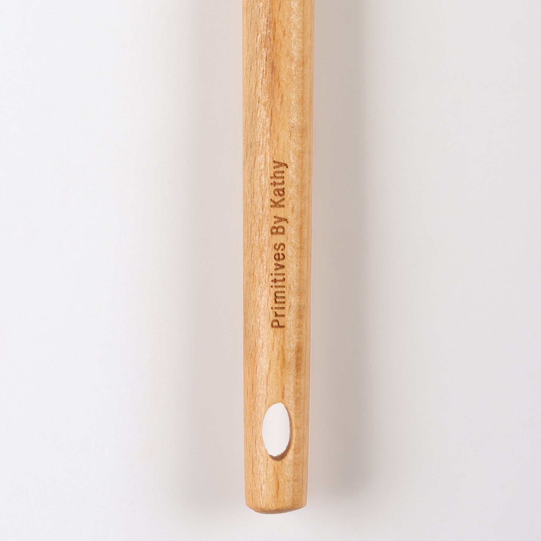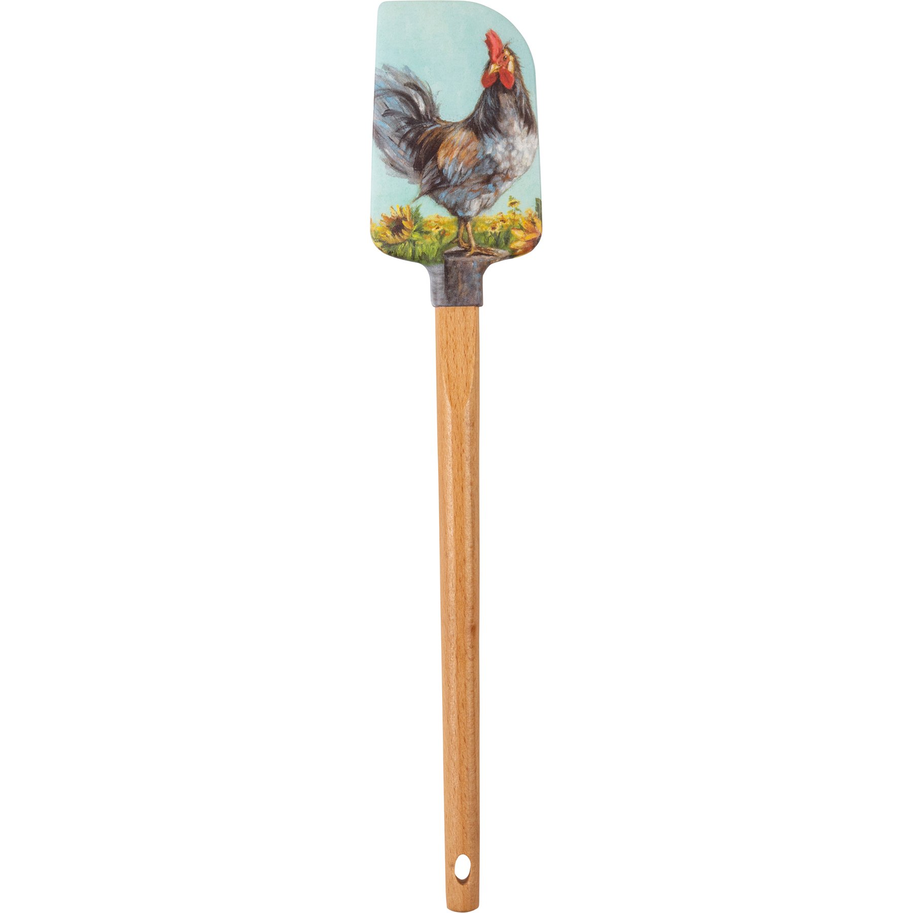 A double-sided silicone spatula featuring a depiction of a rooster. Design is replicated from original artwork painted onto burlap canvas, giving the art a unique depth and texture. Logo is engraved into wooden handle for added interest and includes a decorative bow and a ribbon for hanging. Hand-wash recommended; not microwave safe.