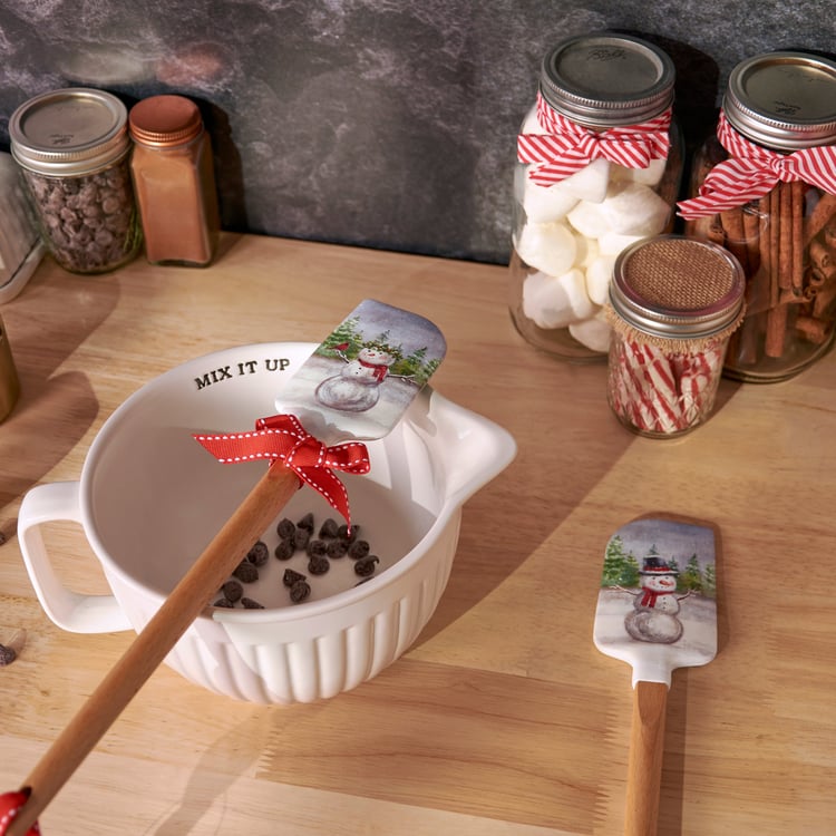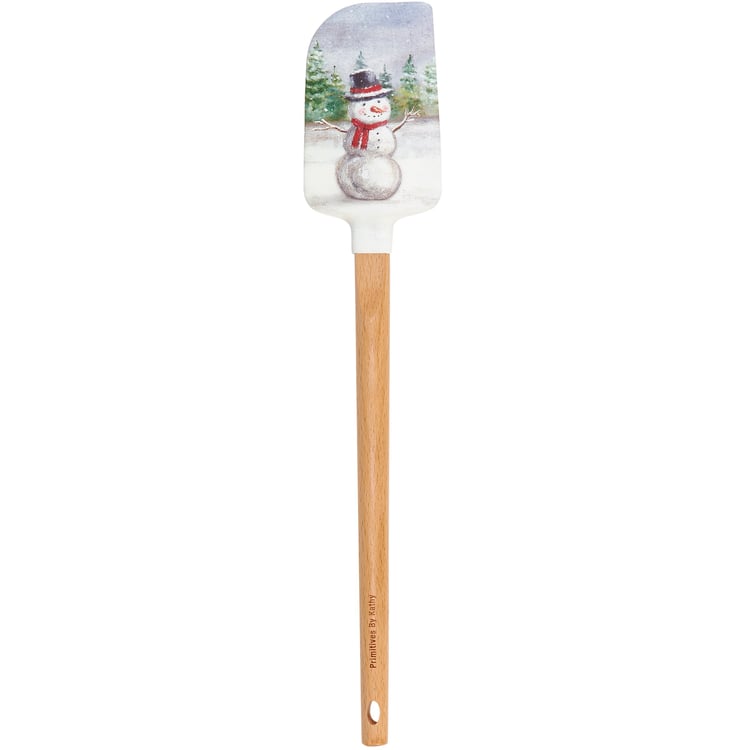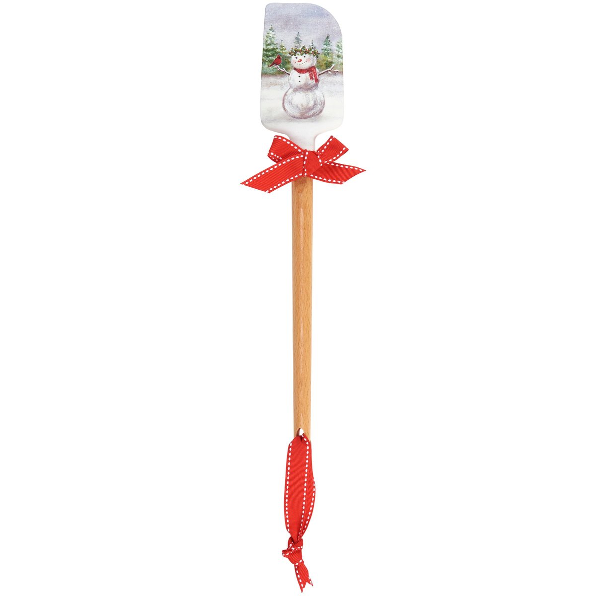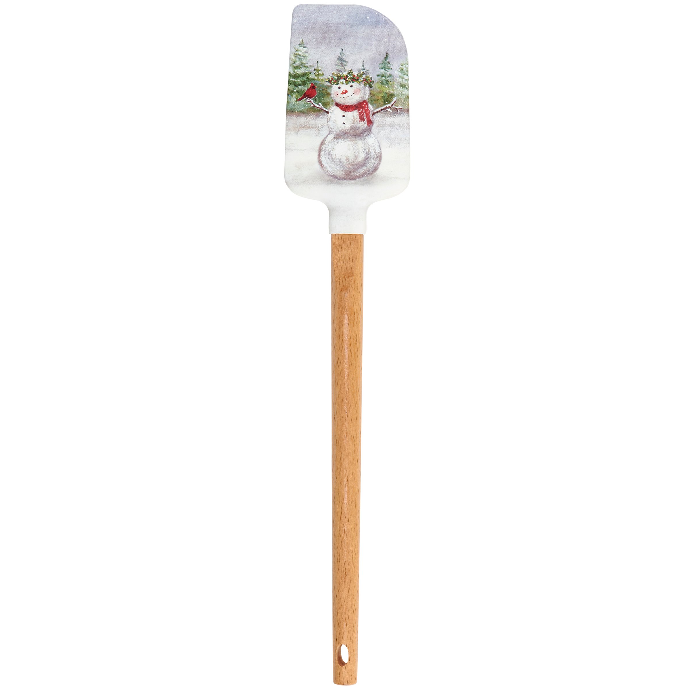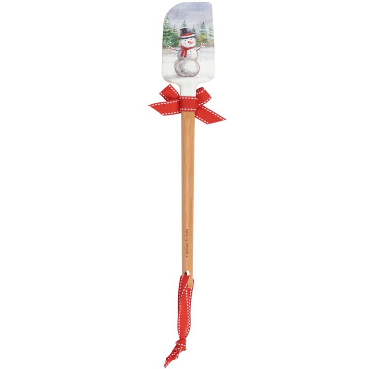 A double-sided silicone spatula from our Christmas Collection displaying charming designs of different snowmen on each side replicated from original artwork painted onto burlap canvas, giving the art a unique depth and texture. Our Snow Family spatula includes a coordinating decorative bow and ribbon at the bottom for hanging. Hand-wash recommended; not microwave safe. A rustic winter-themed kitchen accessory perfect for seasonal use.