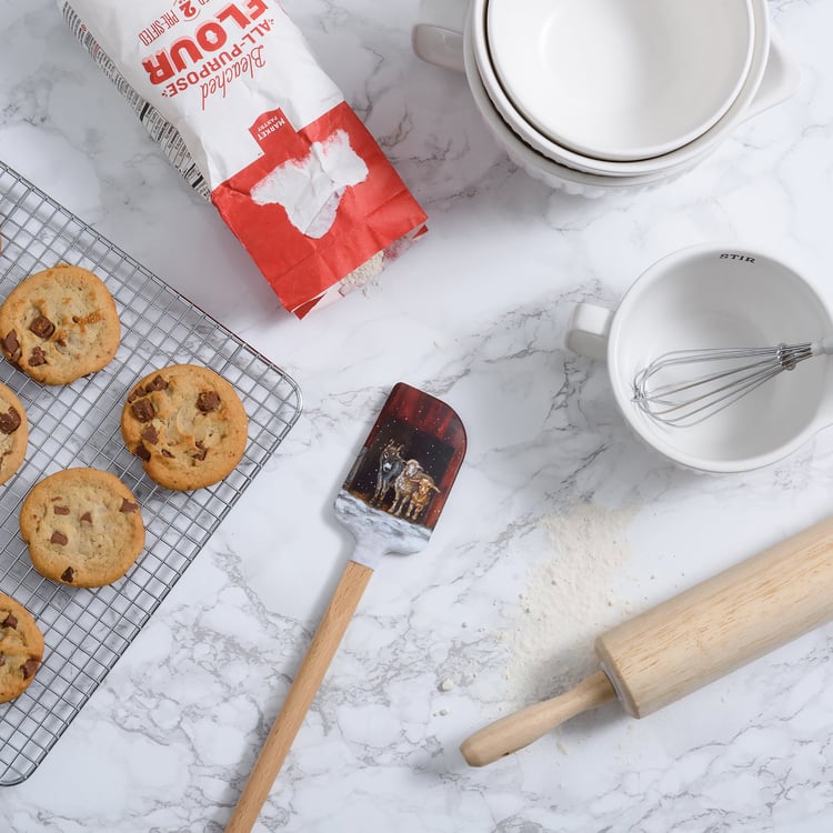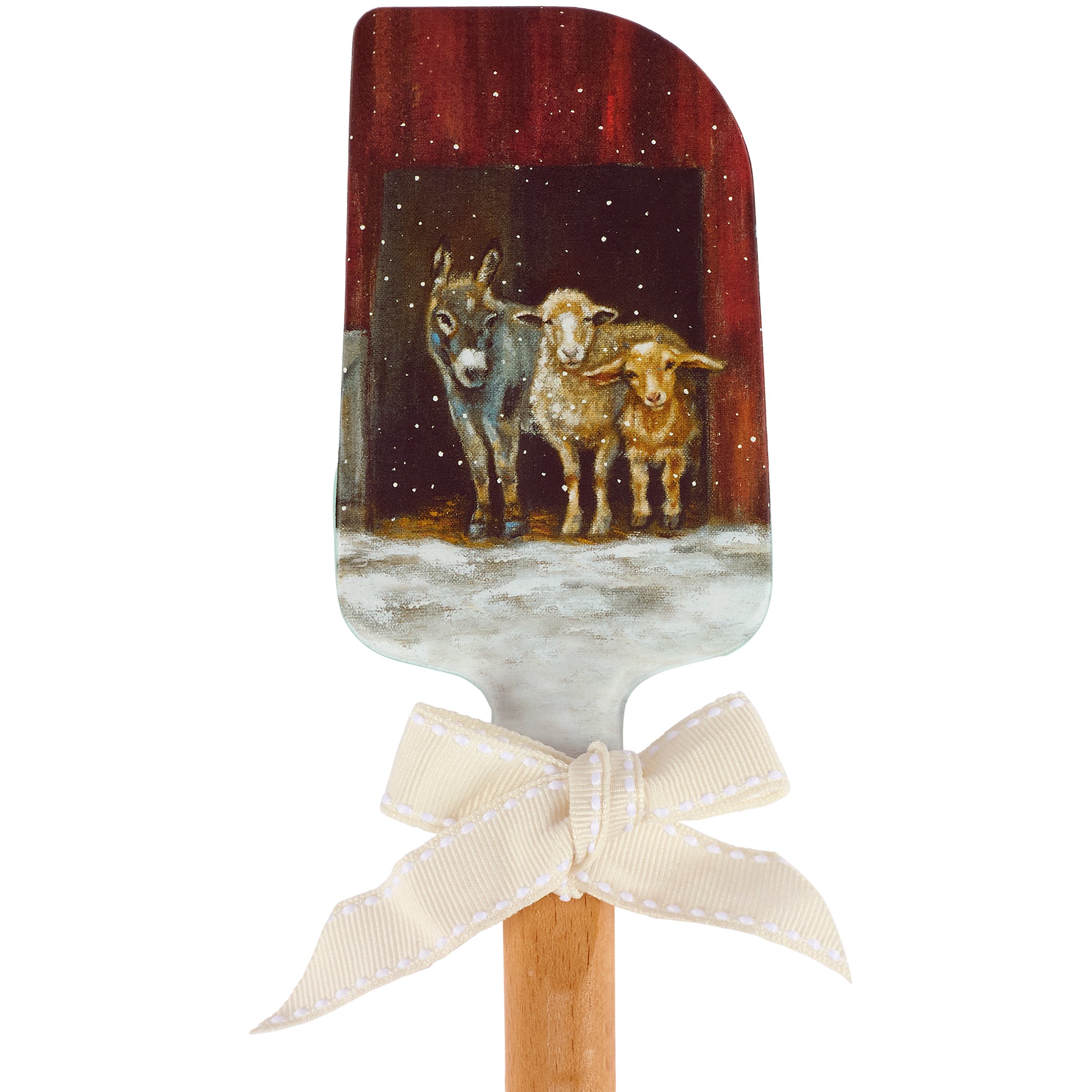 A double-sided silicone spatula from our Christmas Collection features farm animals inside a barn on a snowy day. Design is replicated from original artwork painted onto burlap canvas, giving the art a unique depth and texture. Our Farm Family spatula features a logo engraved into wooden handle for added interest and a decorative bow and ribbon for hanging. Hand-wash recommended; not microwave safe.