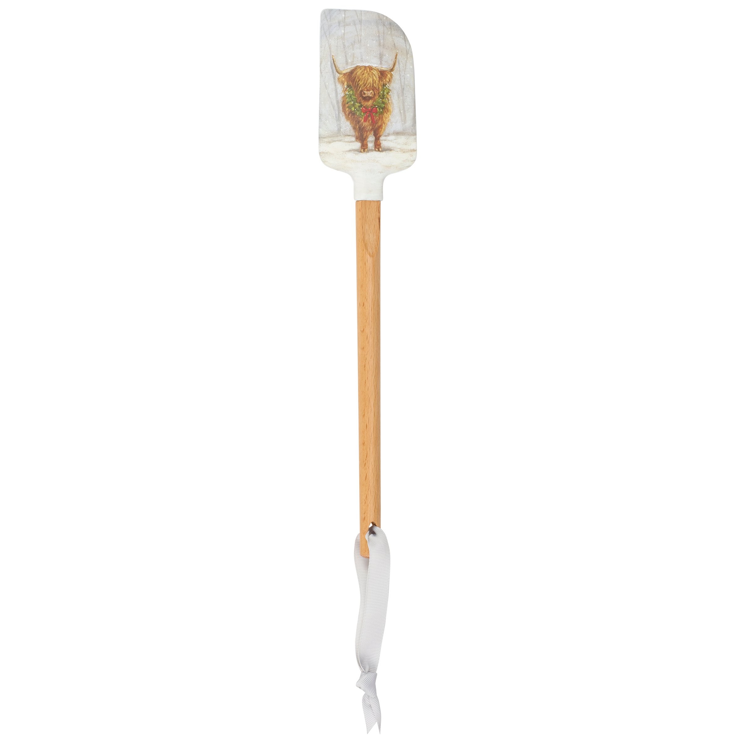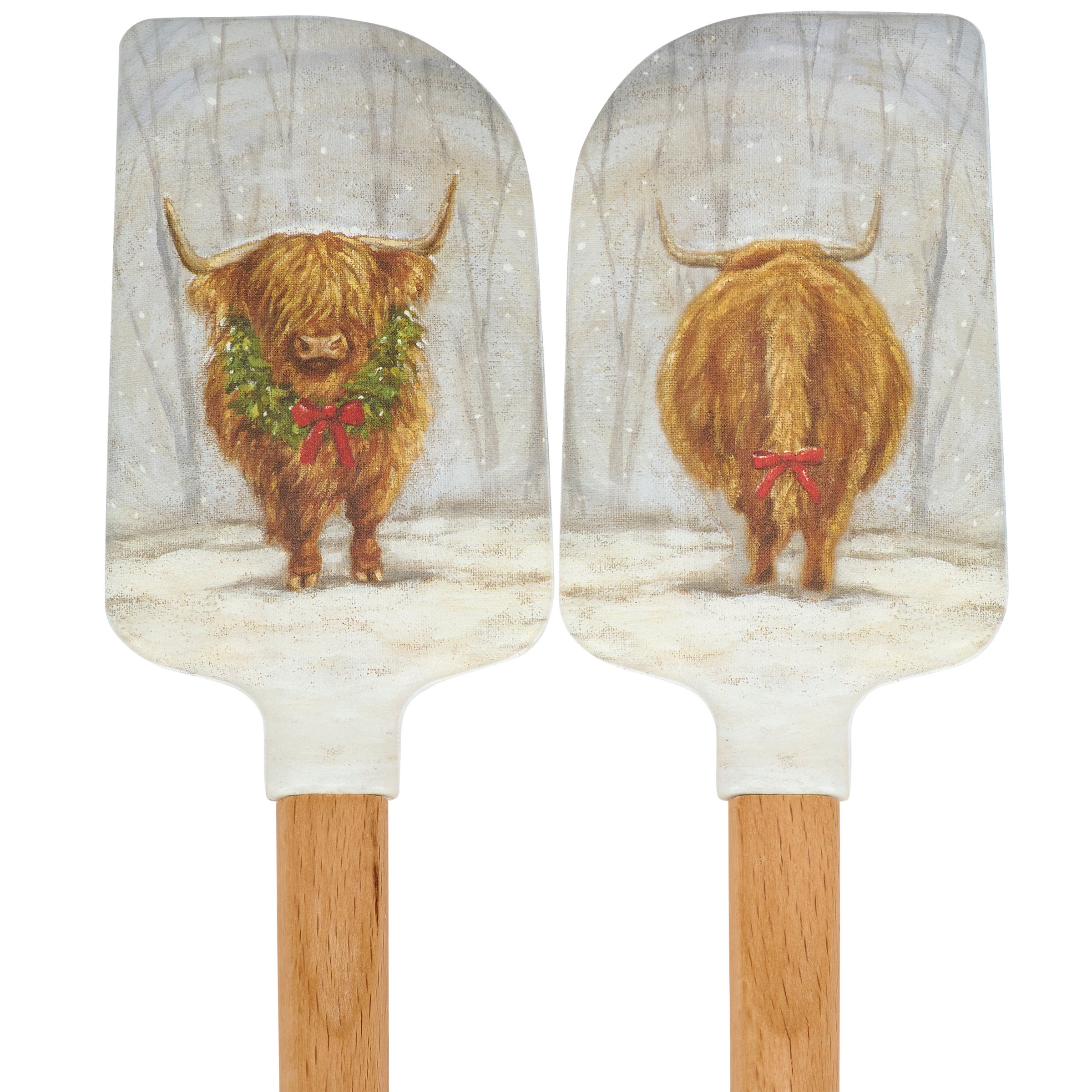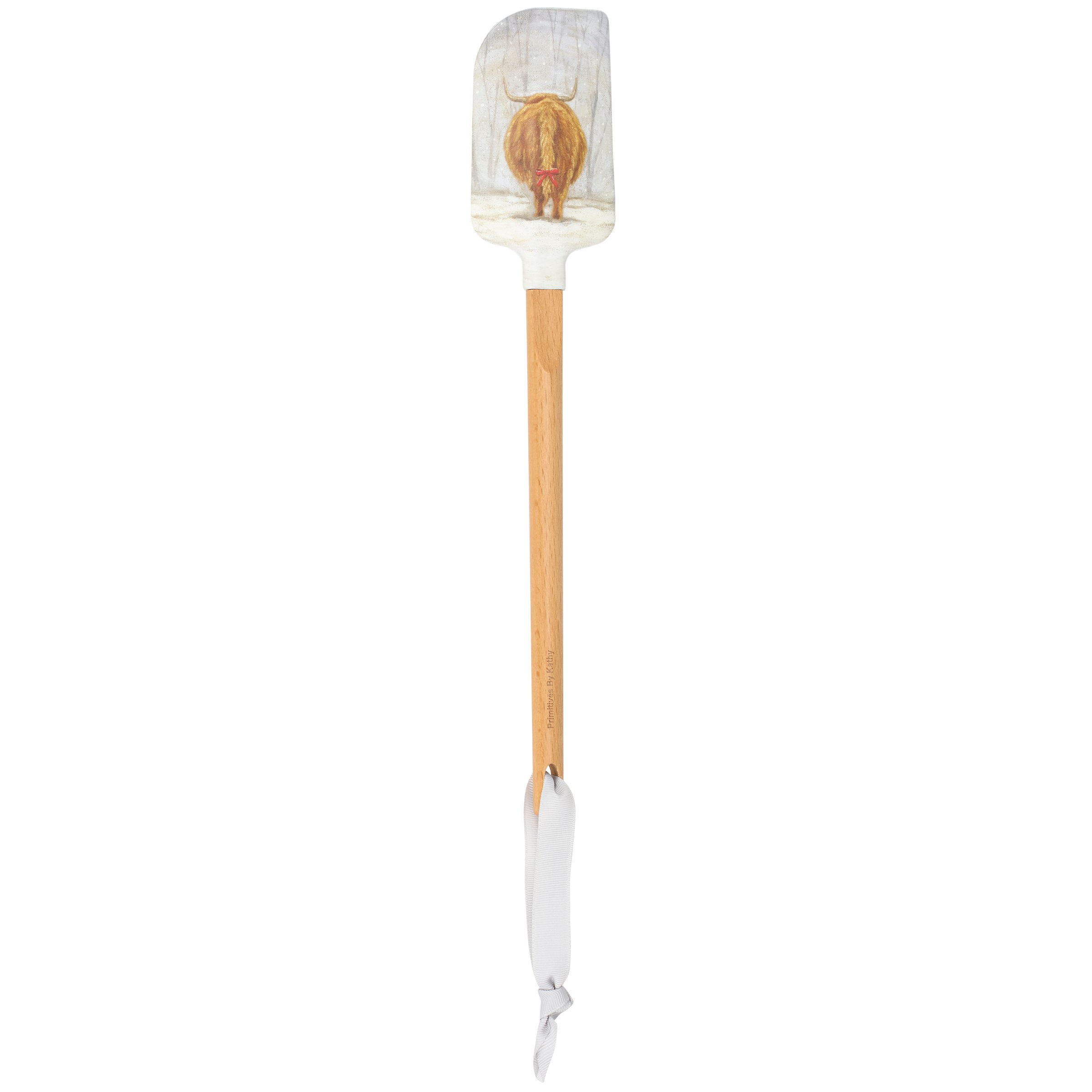 A silicone spatula from our Christmas Collection featuring a double-sided design displaying a charming winter scene of a highland cow wearing a holiday wreath with front and back perspectives on each side. Winter highland cow design is replicated from original artwork painted onto burlap canvas, giving the art a unique depth and texture. Our Snowy Highland spatula includes a hole and the end of the handle for hanging. Hand wash recommended; not microwave safe. A rustic farm themed gift perfect for adding seasonal style to any kitchen.