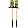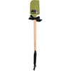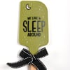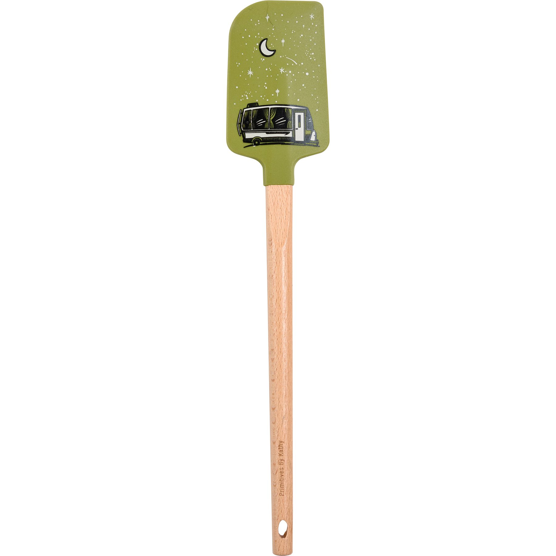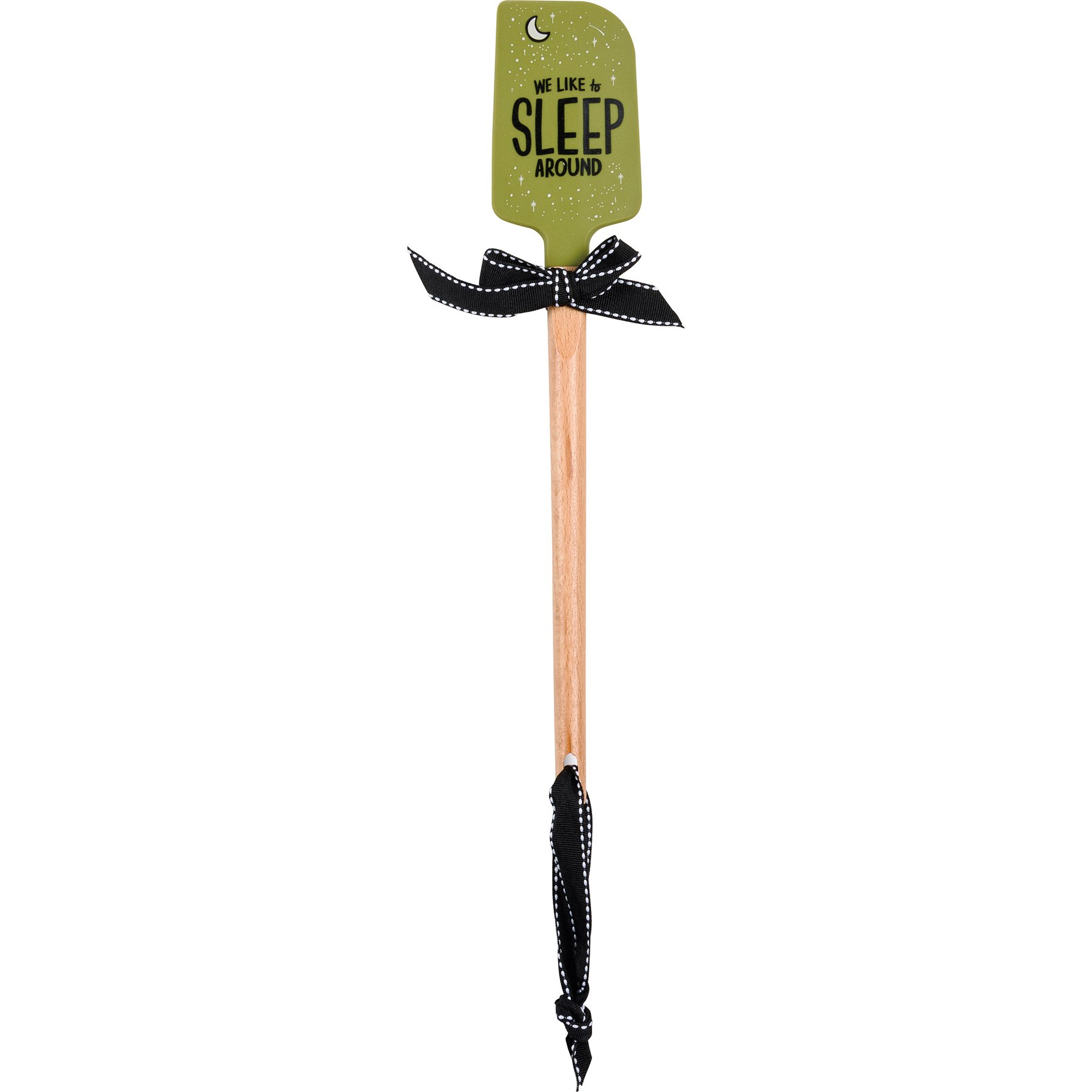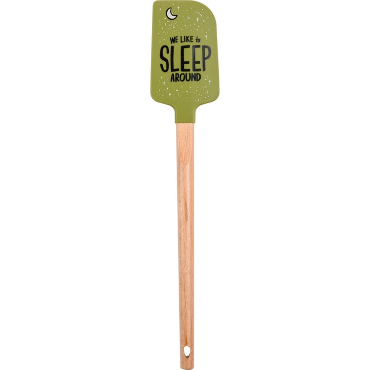 A double-sided silicone spatula featuring a green palette, moon design, and a hand lettered "We Like To Sleep Around" sentiment on one side, and green palette with camper and moon design on the other side. Logo is engraved into wooden handle for added interest and includes a decorative bow and a ribbon for hanging. Hand-wash recommended; not microwave safe.