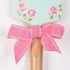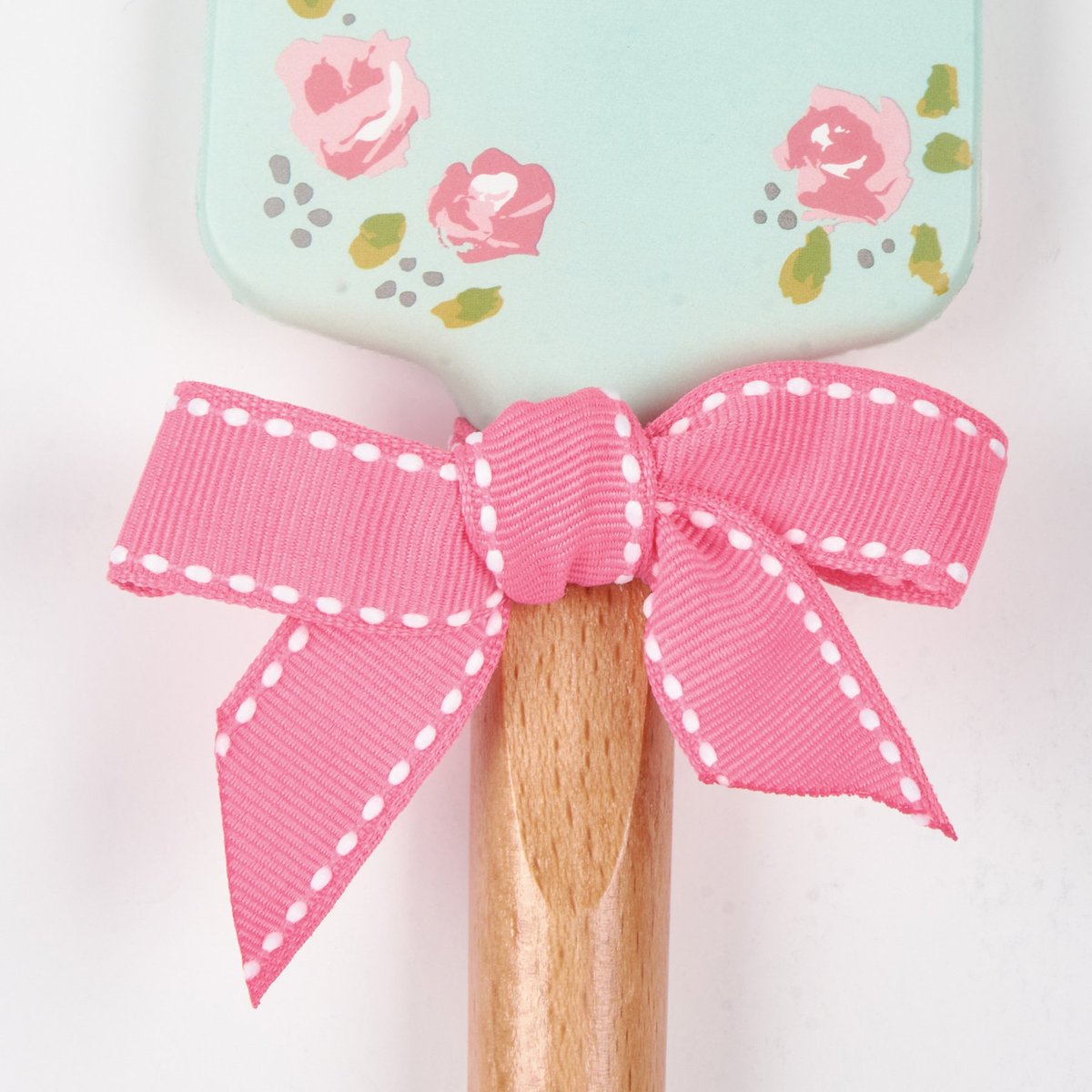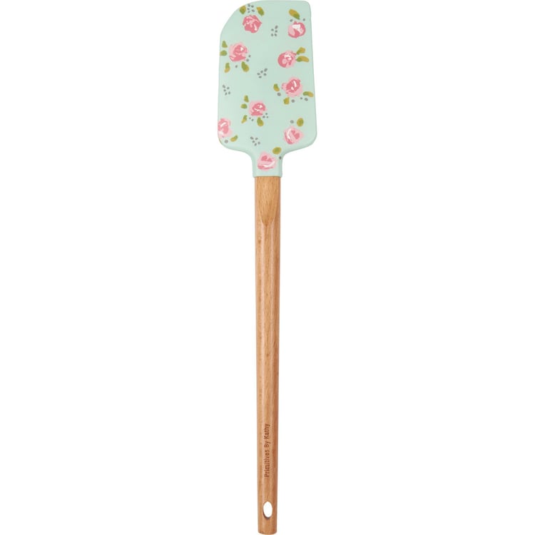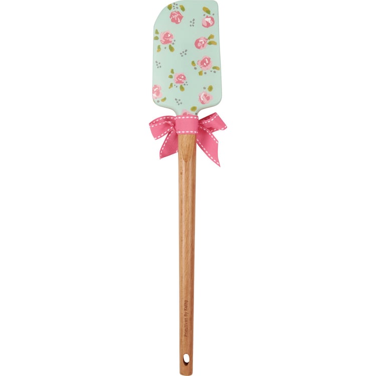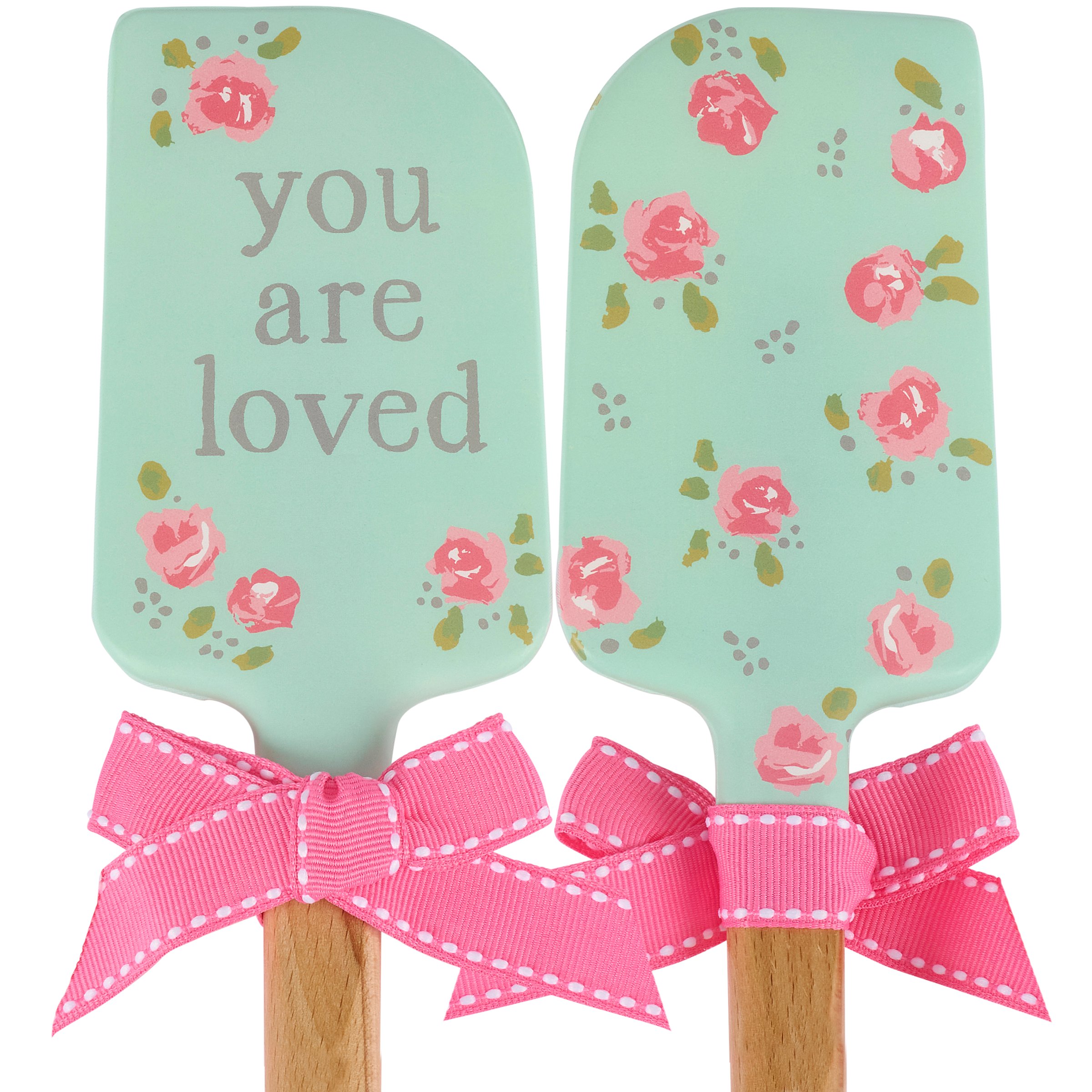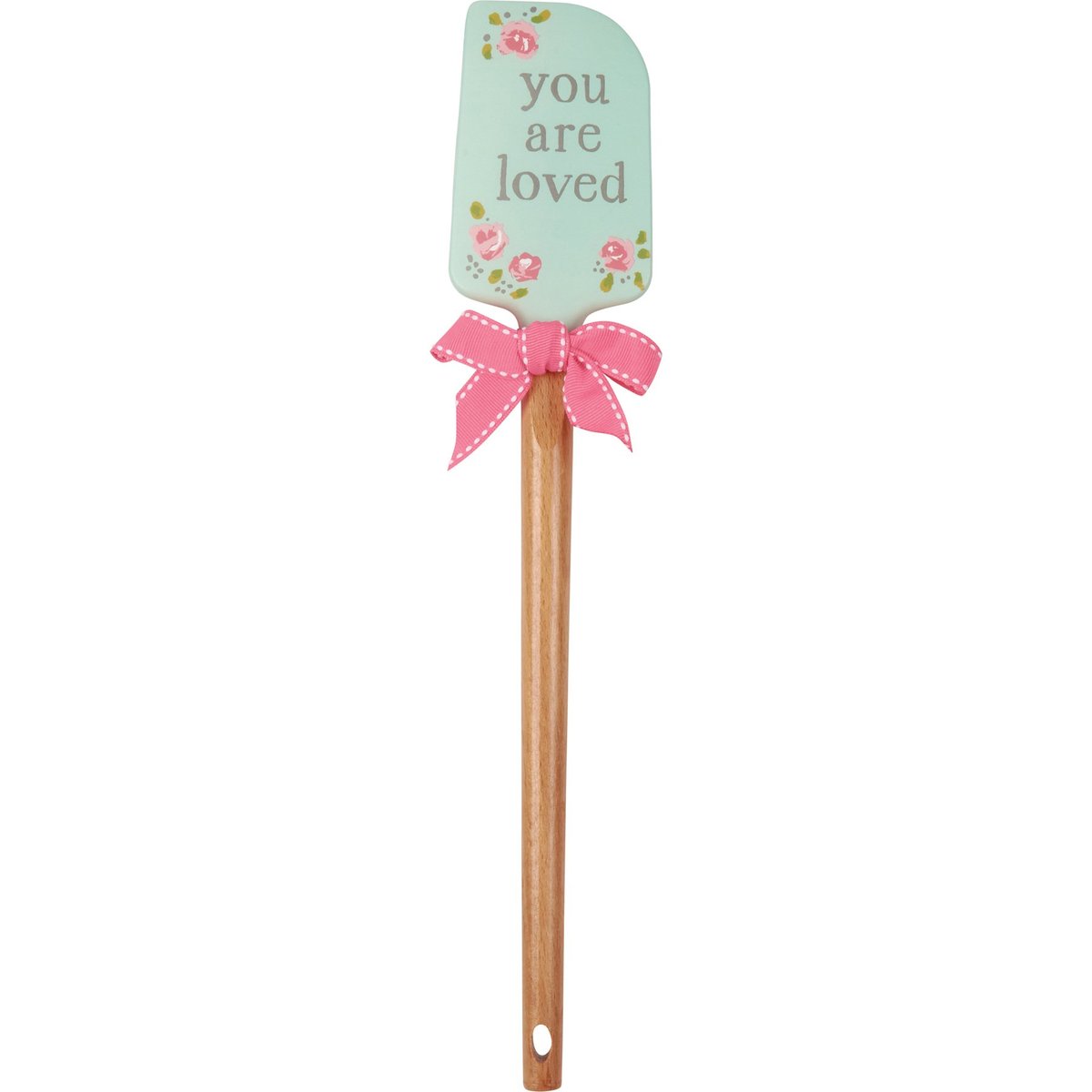 A double-sided silicone spatula from our Mother's Day Collection displaying charming watercolor art of pink flowers with hand illustrated "You Are Loved" sentiment. Logo is engraved into wooden handle for added interest. Our You Are Loved spatula includes a complementing decorative bow and hole at the bottom for hanging. Hand-wash recommended; not microwave safe.