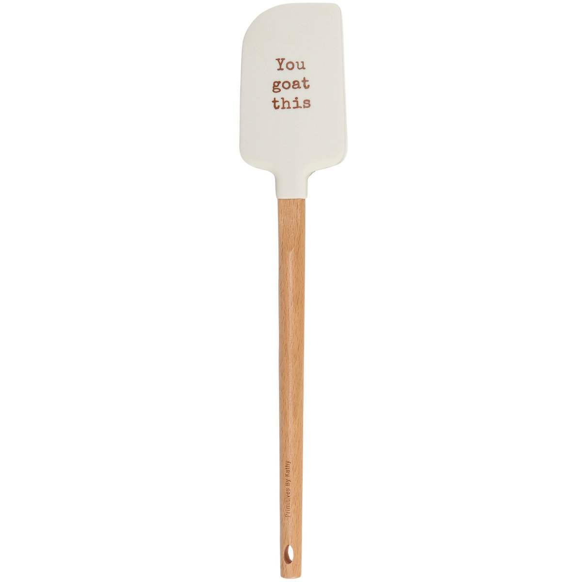 A double-sided silicone spatula from our Farmhouse Collection displaying vintage art of goats on one side and farm inspired pun that reads "You Goat This" on the other. Logo is engraved into wooden handle for added interest. Our You Goat This spatula includes a complementing decorative bow and hole at the bottom for hanging. Hand-wash recommended; not microwave safe. A fun farm-themed kitchen accessory perfect for everyday use.
