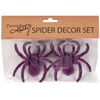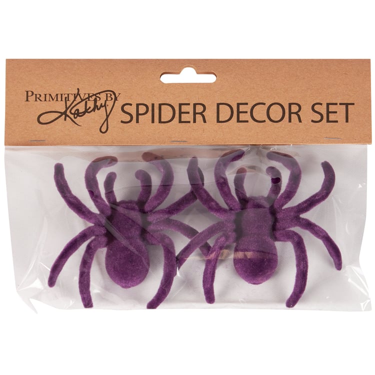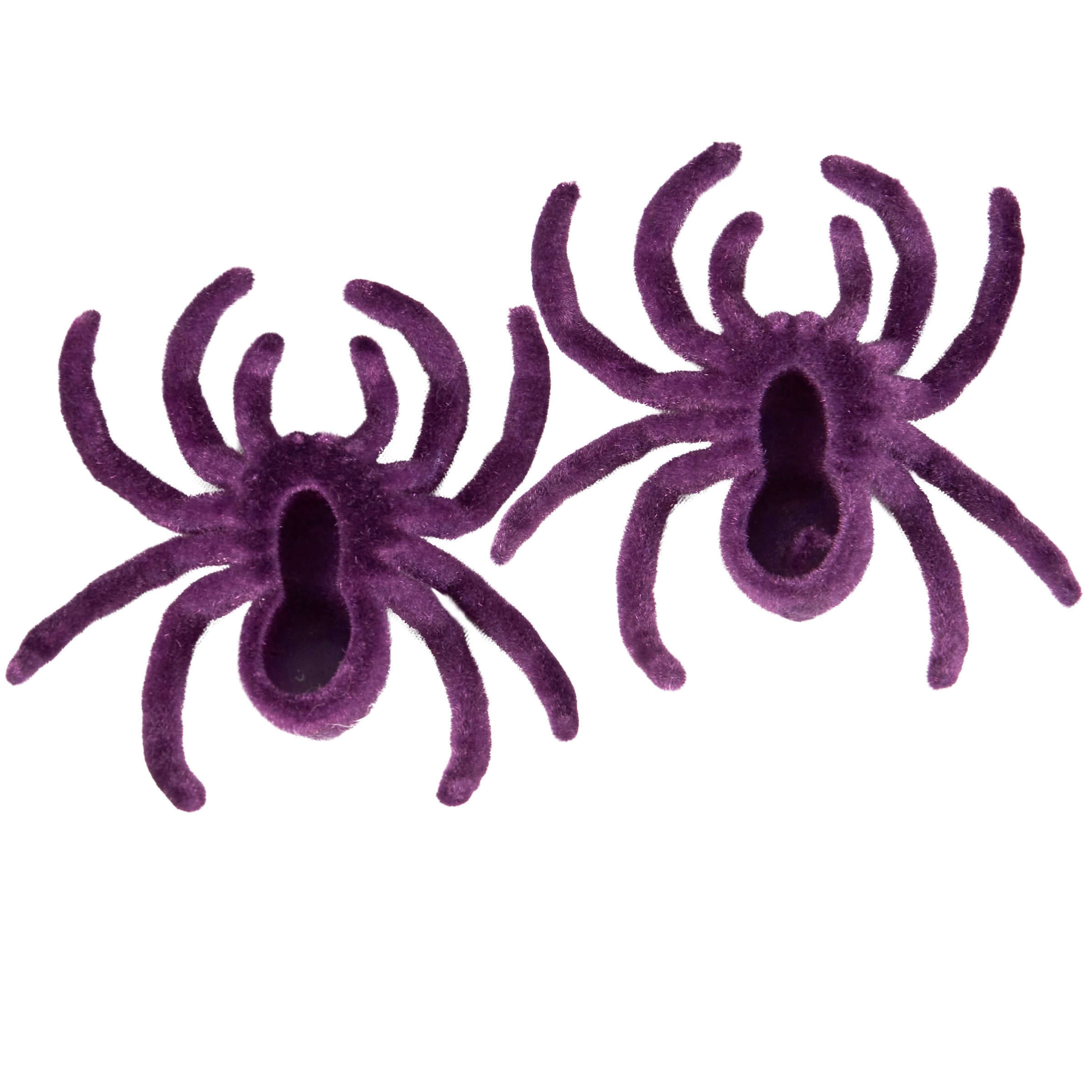 A set of 2 medium size decorative spiders from our Halloween Collection featuring identical designs with purple flocked finish for added interest. Our medium flocked spiders are designed to free-stand on any flat surface. Place in a display to add a fun touch of Halloween that looks great in blacklight. Seasonal spider set comes packaged in a polybag and header card with hole for easy rack display. A set of fun Halloween home accents with a variety of seasonal display options.