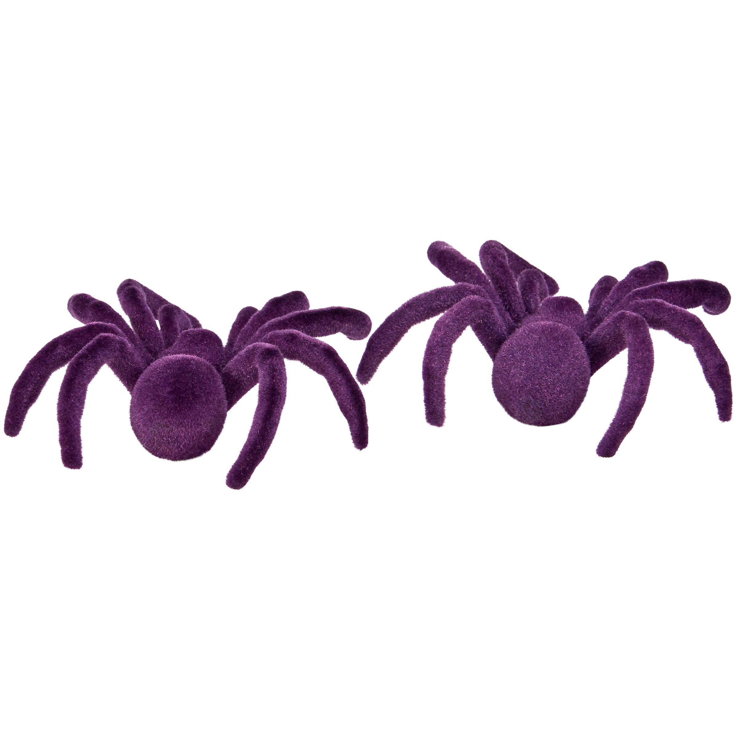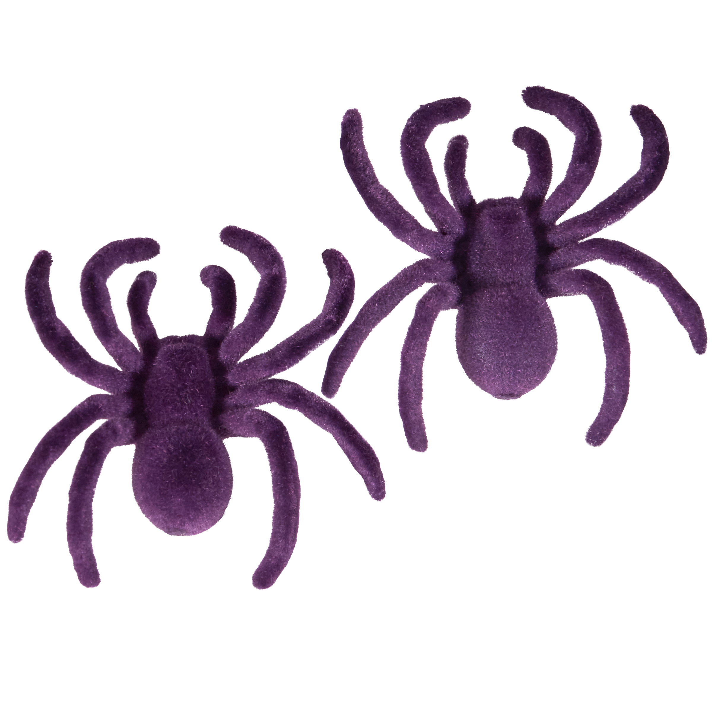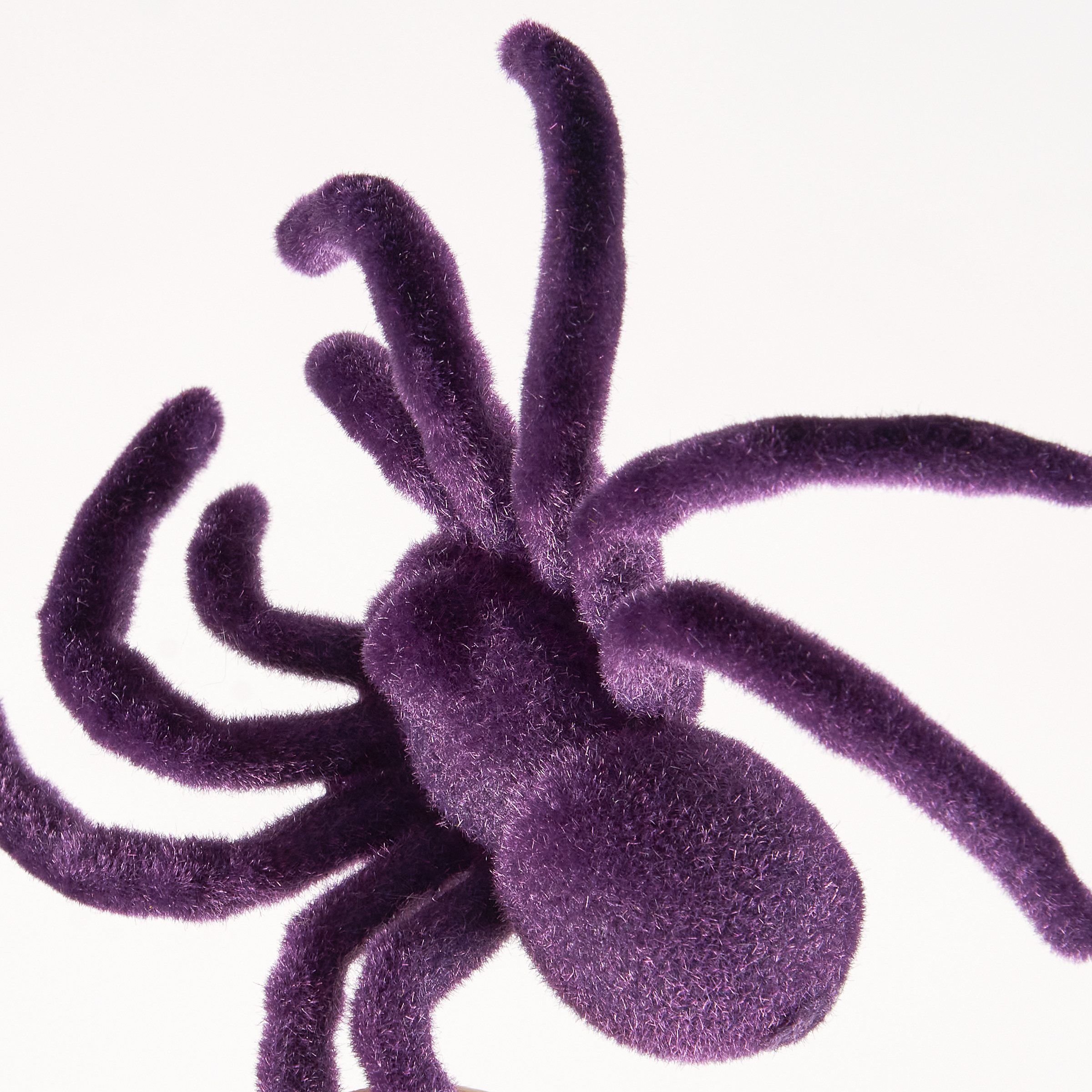 A set of 2 medium size decorative spiders from our Halloween Collection featuring identical designs with purple flocked finish for added interest. Our medium flocked spiders are designed to free-stand on any flat surface. Place in a display to add a fun touch of Halloween that looks great in blacklight. Seasonal spider set comes packaged in a polybag and header card with hole for easy rack display. A set of fun Halloween home accents with a variety of seasonal display options.