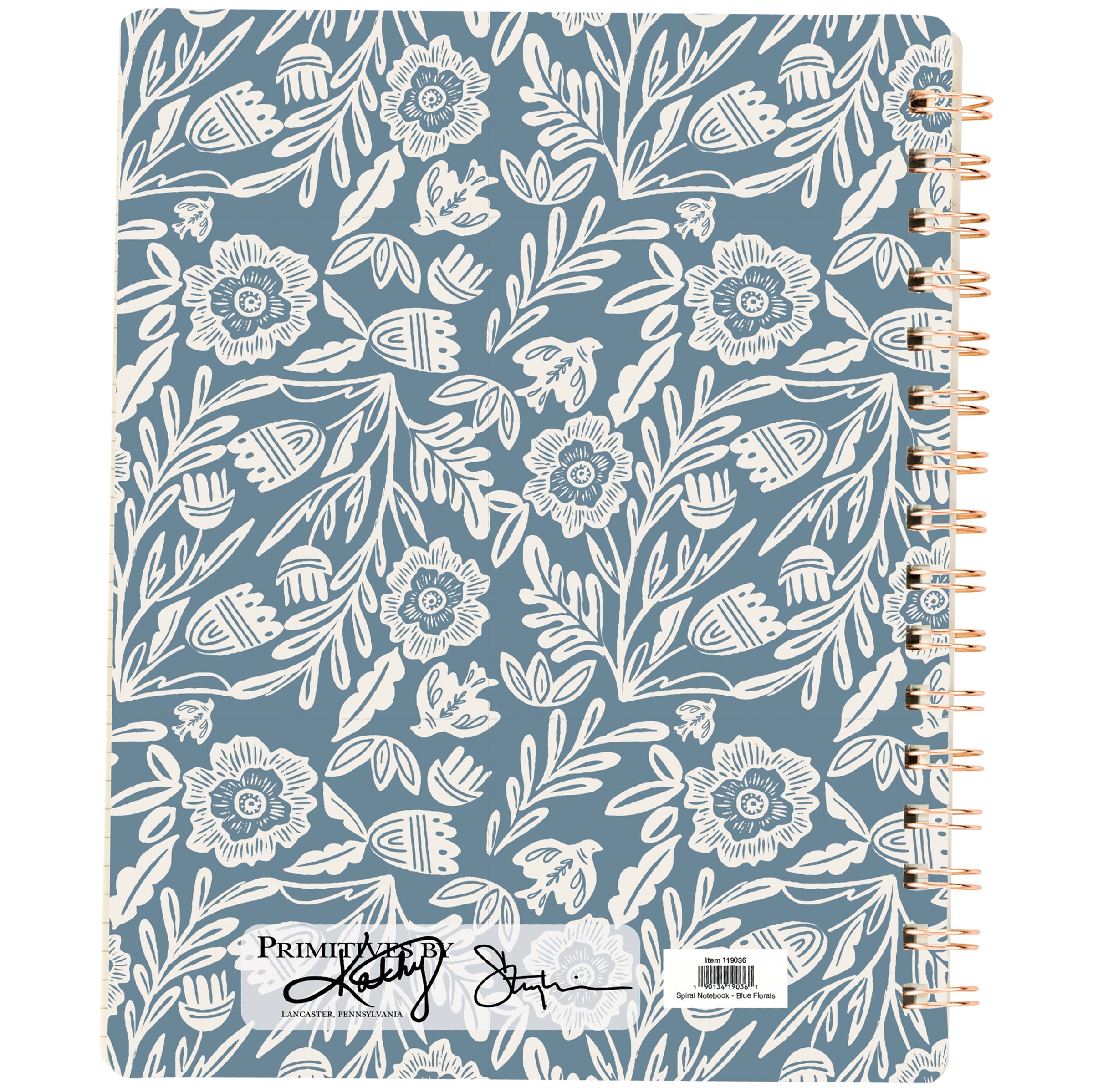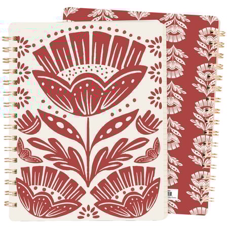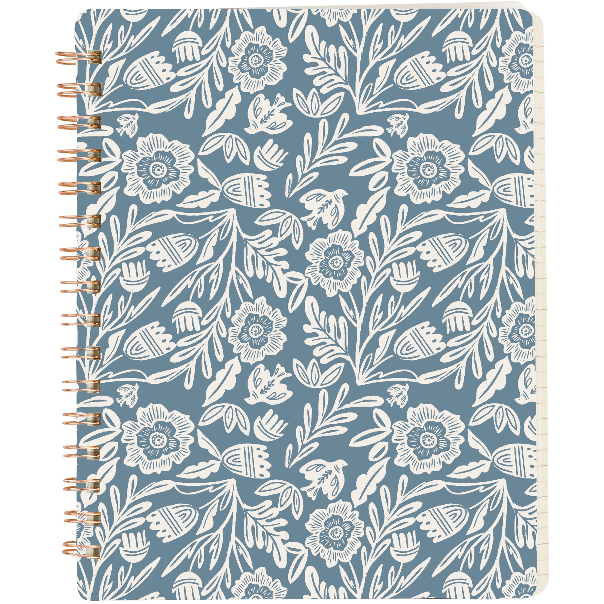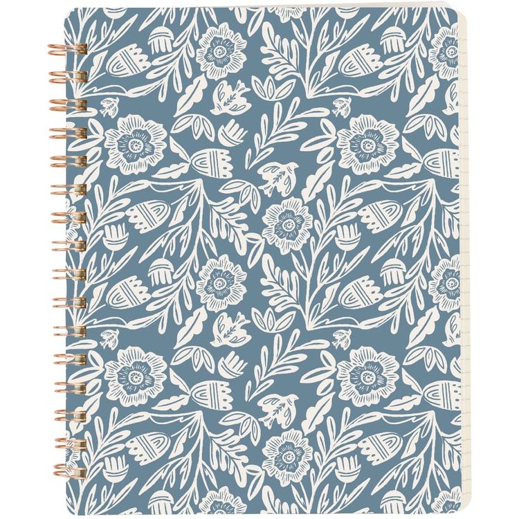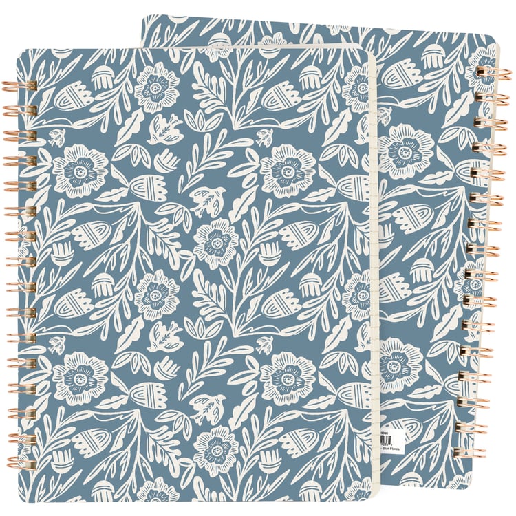 A double-sided spiral notebook from our Folk Art Collection displaying a calming hand illustrated pattern of blue florals inspired by Scandinavian folk art. Back cover features coordinating blue floral pattern. Our Blue Folk Floral spiral notebook includes 120 lined pages. An inspirational everyday accessory that is also great for gifting.