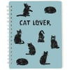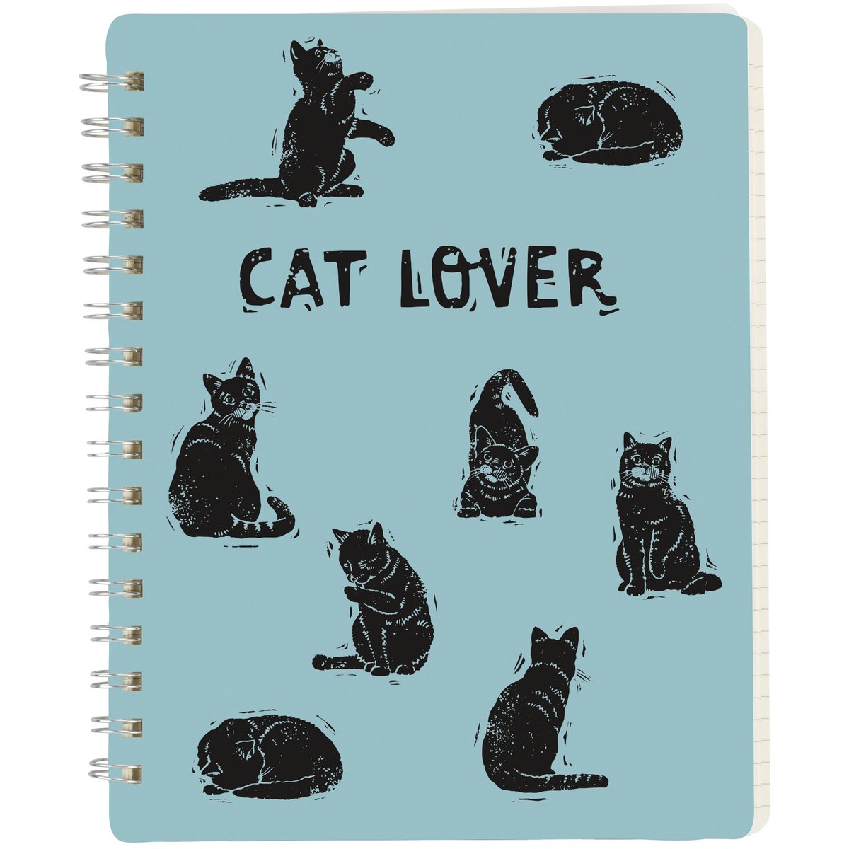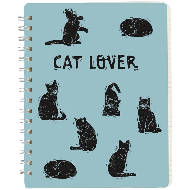 A double-sided spiral notebook from our Pet Collection displaying fun cat designs in a block print art style with a pet inspired sentiment that reads "Cat Lover." Back cover features coordinating cat designs. Our spiral Cat Lover notebook includes 120 lined pages. A fun pet-themed gift perfect for an everyday accessory.