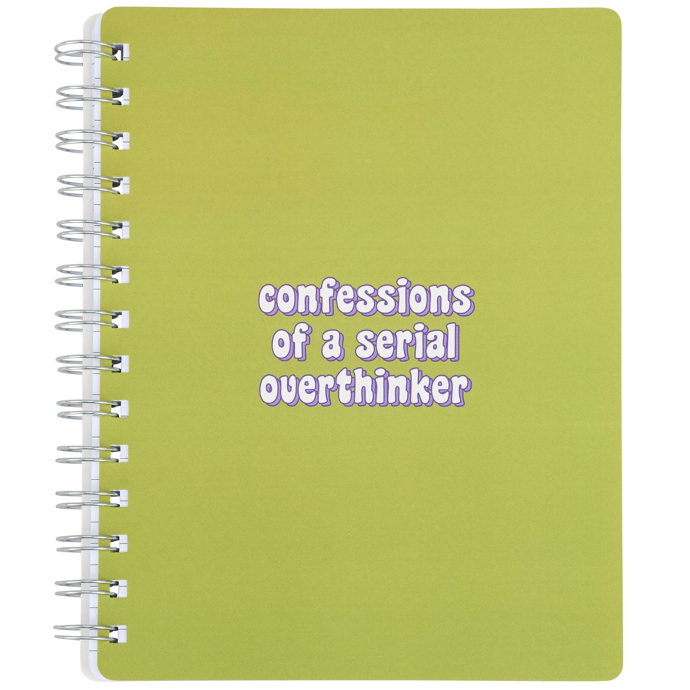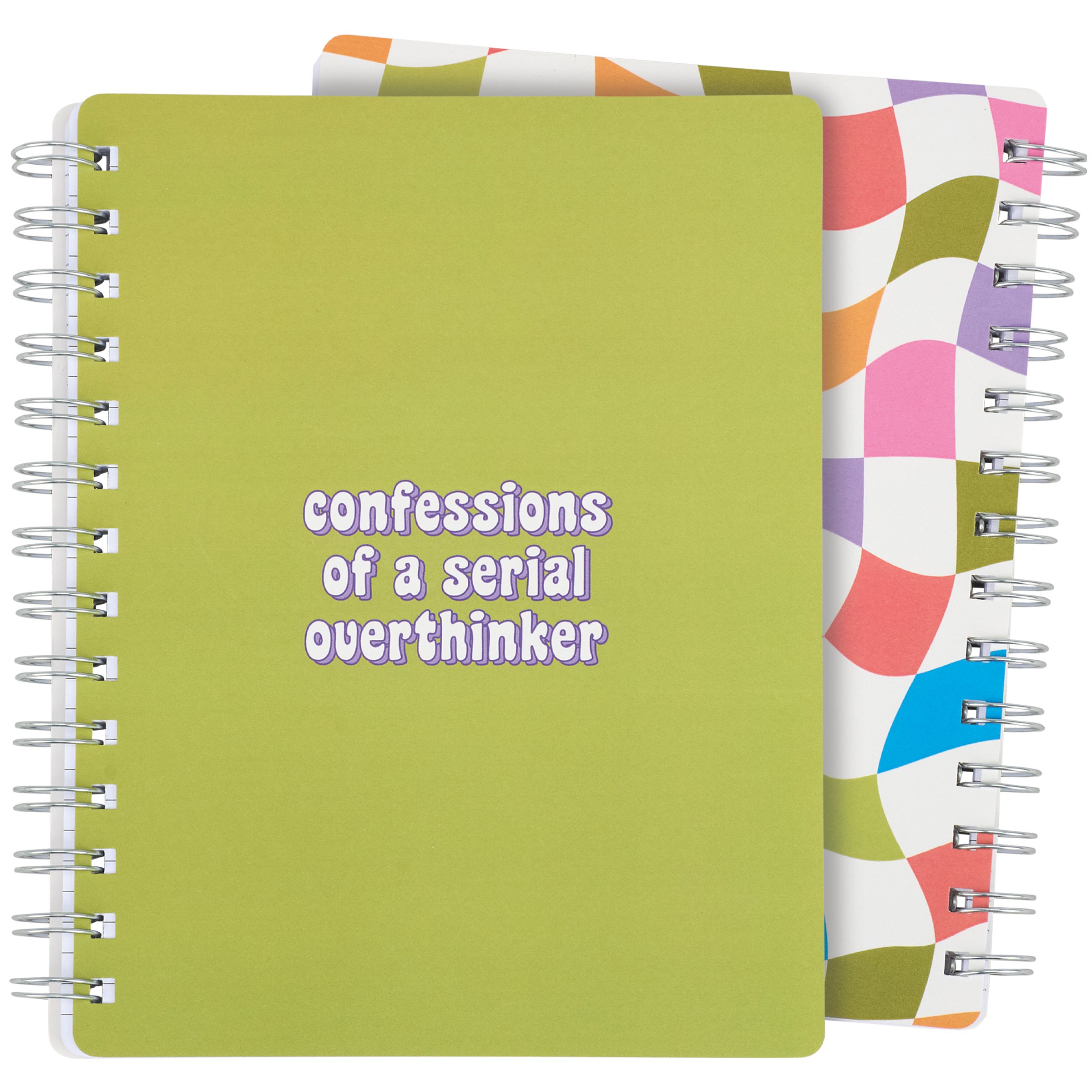 This double-sided spiral notebook displays a relatable sentiment in a fun retro style that reads "Confessions Of A Serial Overthinker." The back cover of the notebook features a coordinating retro pattern to complete the look. Questionables spiral notebooks include 120 lined pages to write or doodle anything desired. Our Confessions spiral notebook is a fun gift that calls back to a retro style but with modern mentality, perfect for making a statement while getting a giggle out of others.