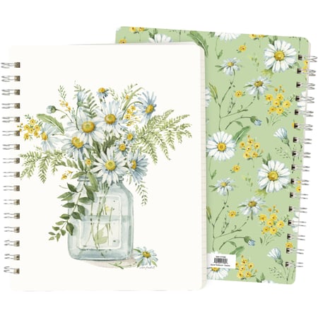 A double-sided spiral notebook from our Garden Collection displaying a charming hand painted design of daisies in a glass jar. Design is replicated from original art hand painted in a delicate watercolor style. Back cover features coordinating daisy and wild flower pattern. Our spiral Daisies notebook includes 120 lined pages. A functional daisy-themed accessory that is also great for gifting.