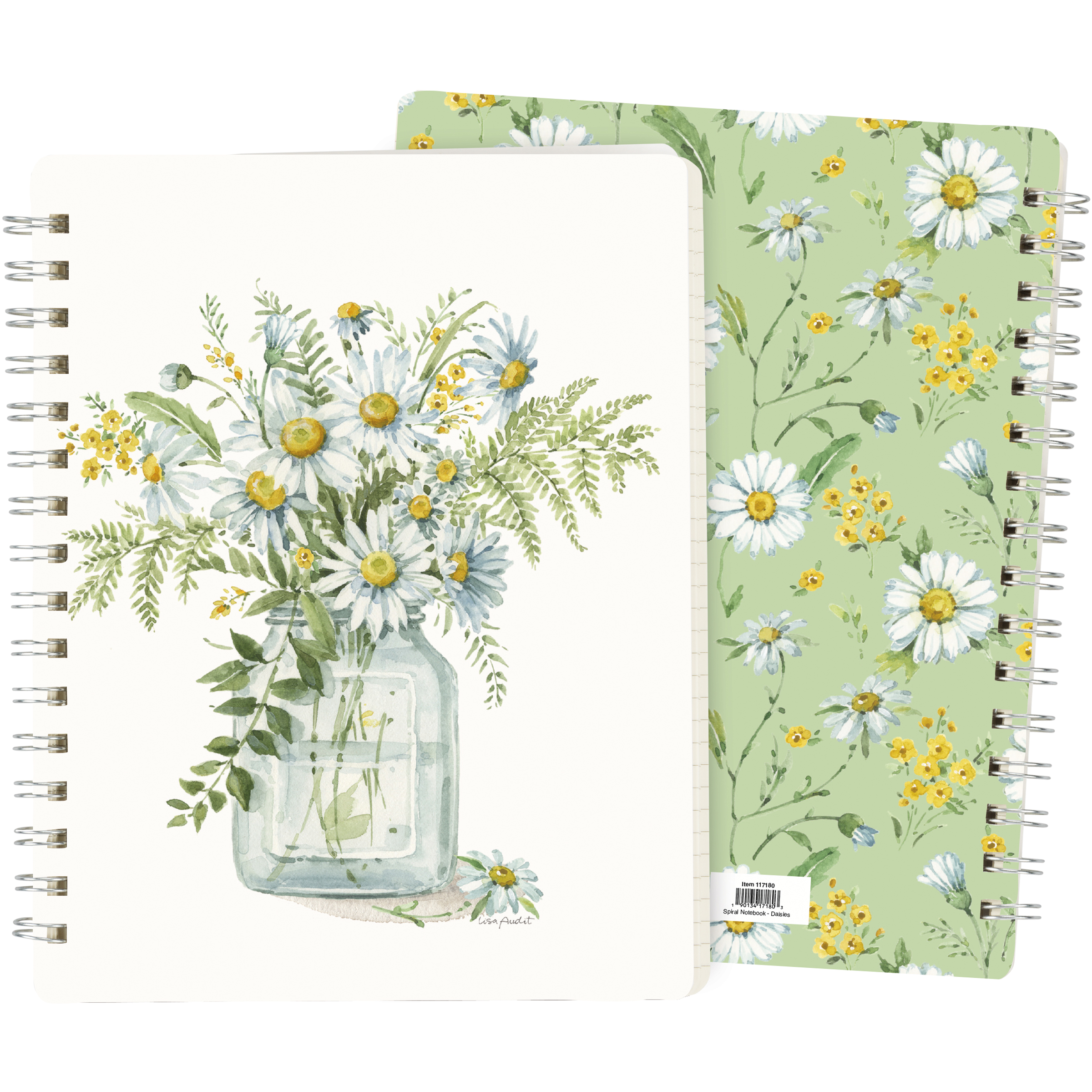 A double-sided spiral notebook from our Garden Collection displaying a charming hand painted design of daisies in a glass jar. Design is replicated from original art hand painted in a delicate watercolor style. Back cover features coordinating daisy and wild flower pattern. Our spiral Daisies notebook includes 120 lined pages. A functional daisy-themed accessory that is also great for gifting.