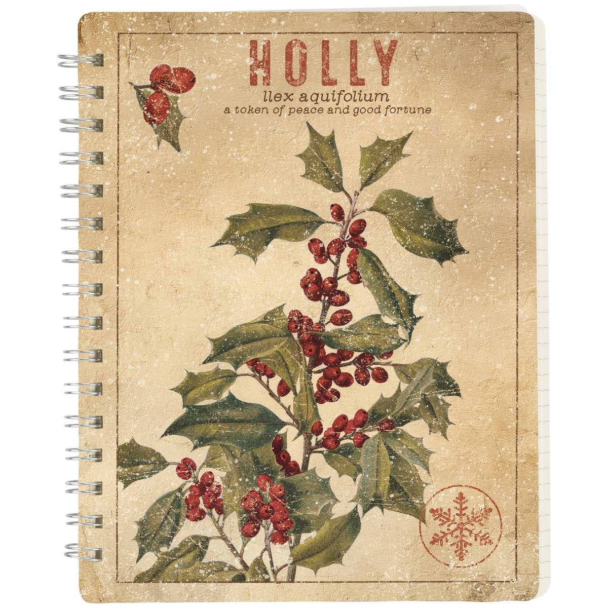 A double-sided spiral notebook from our Christmas Collection displaying vintage plant study inspired art of holly with distressed details for an aged appearance on both covers. Our Holly spiral notebook includes 120 lined pages. A winter plant-themed Christmas gift perfect for a seasonal accessory.