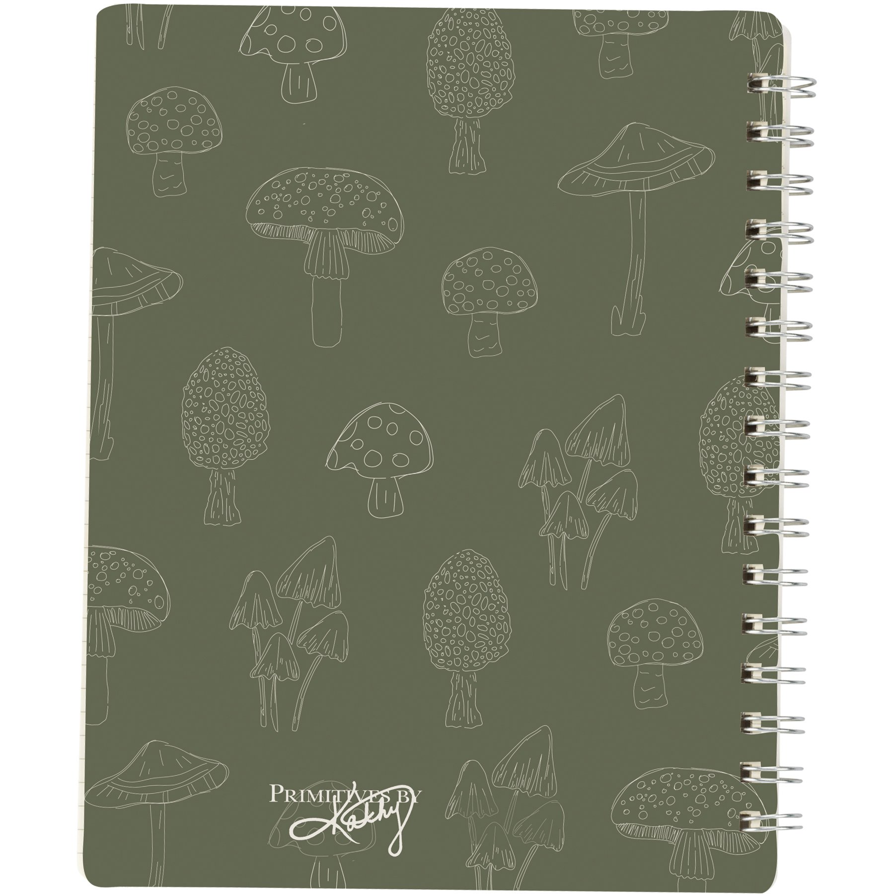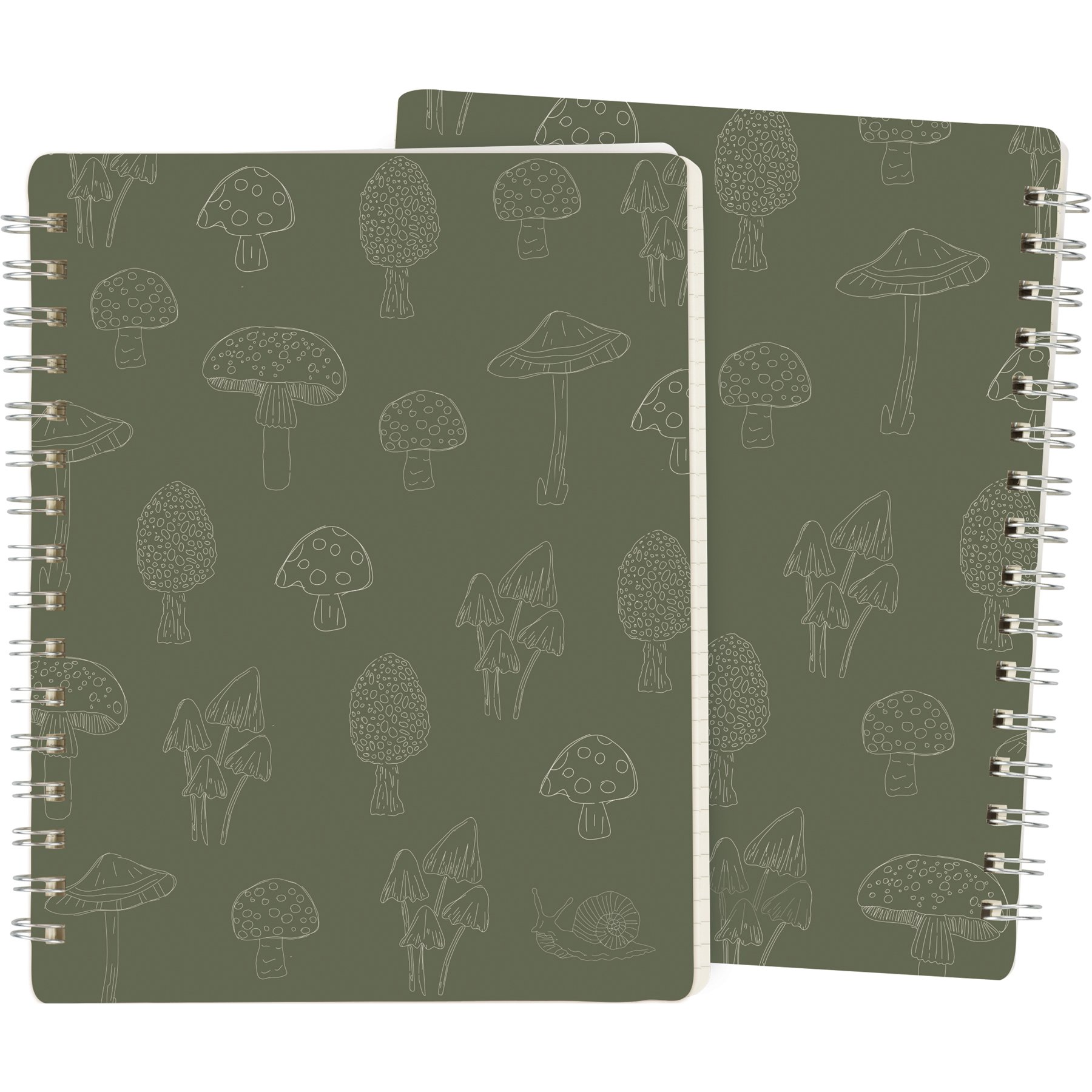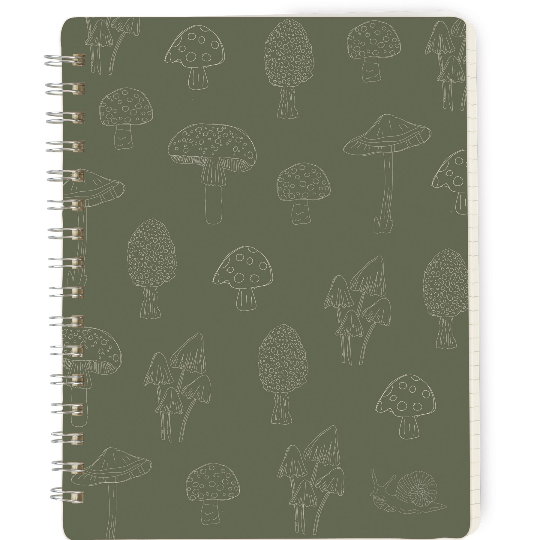 A double-sided spiral notebook from our Cottagecore Collection displaying a charming hand illustrated design of a snail among a variety of mushrooms. The spiral Mushroom notebook covers feature an earthy color palette with 120 cream pages on the inside.