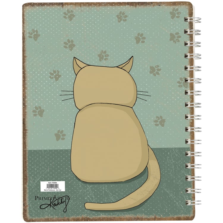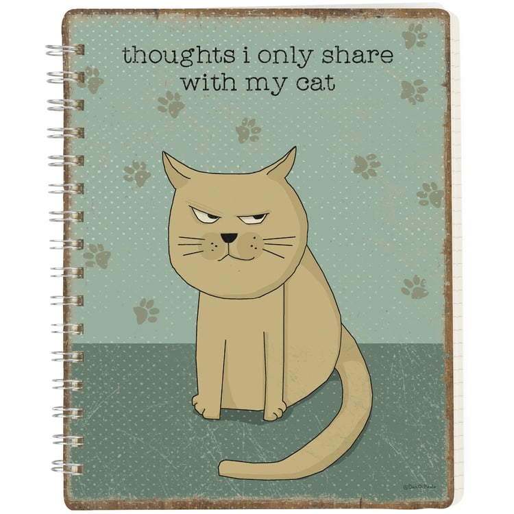 A double-sided spiral notebook from our Pet Collection displaying a rustic inspired design of a sassy cat with a humorous pet-themed sentiment that reads "Thought I Only Share With My Cat." Our spiral Cat notebook includes 120 lined pages. A fun pet-themed accessory that is also great for gifting.