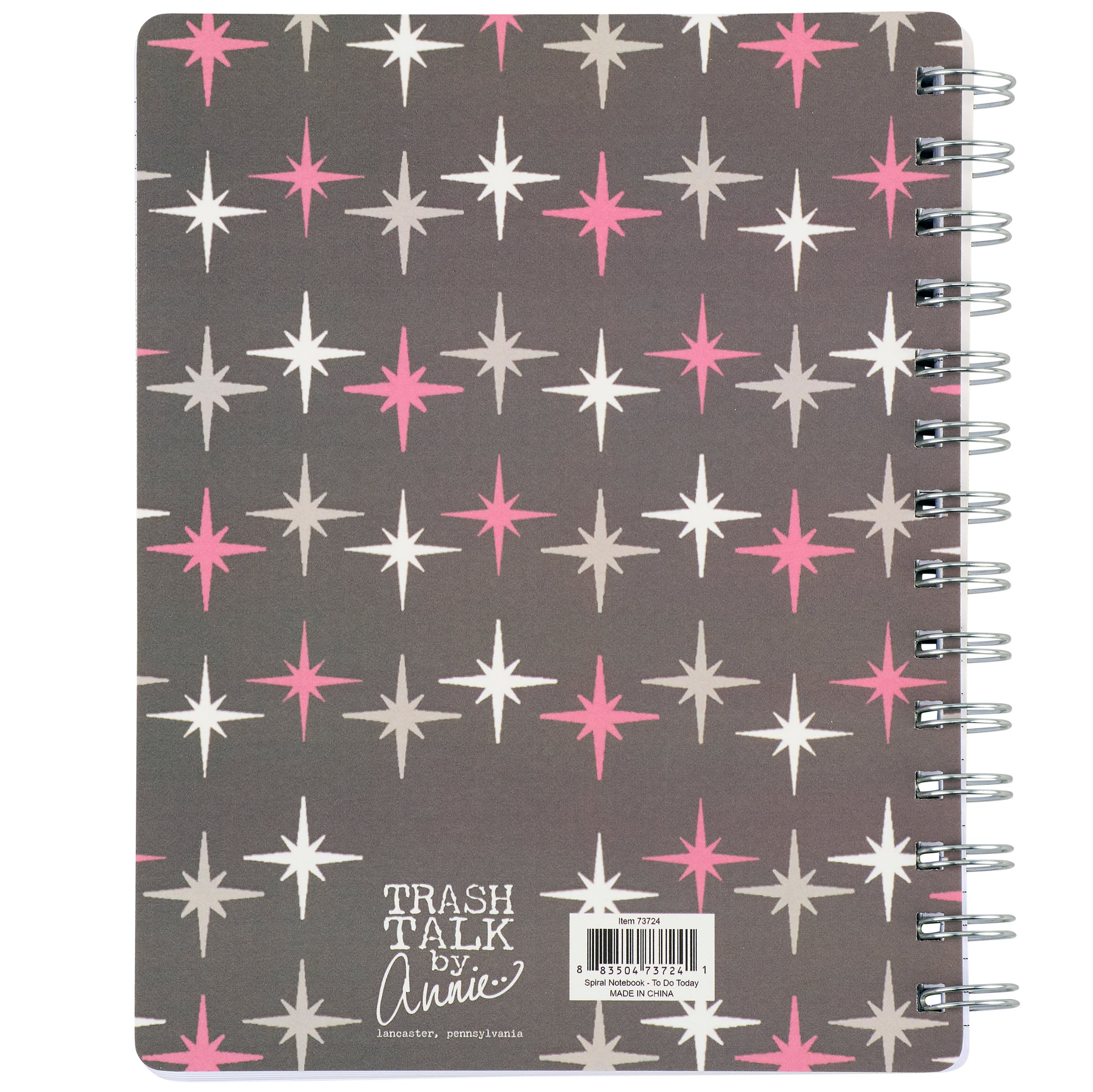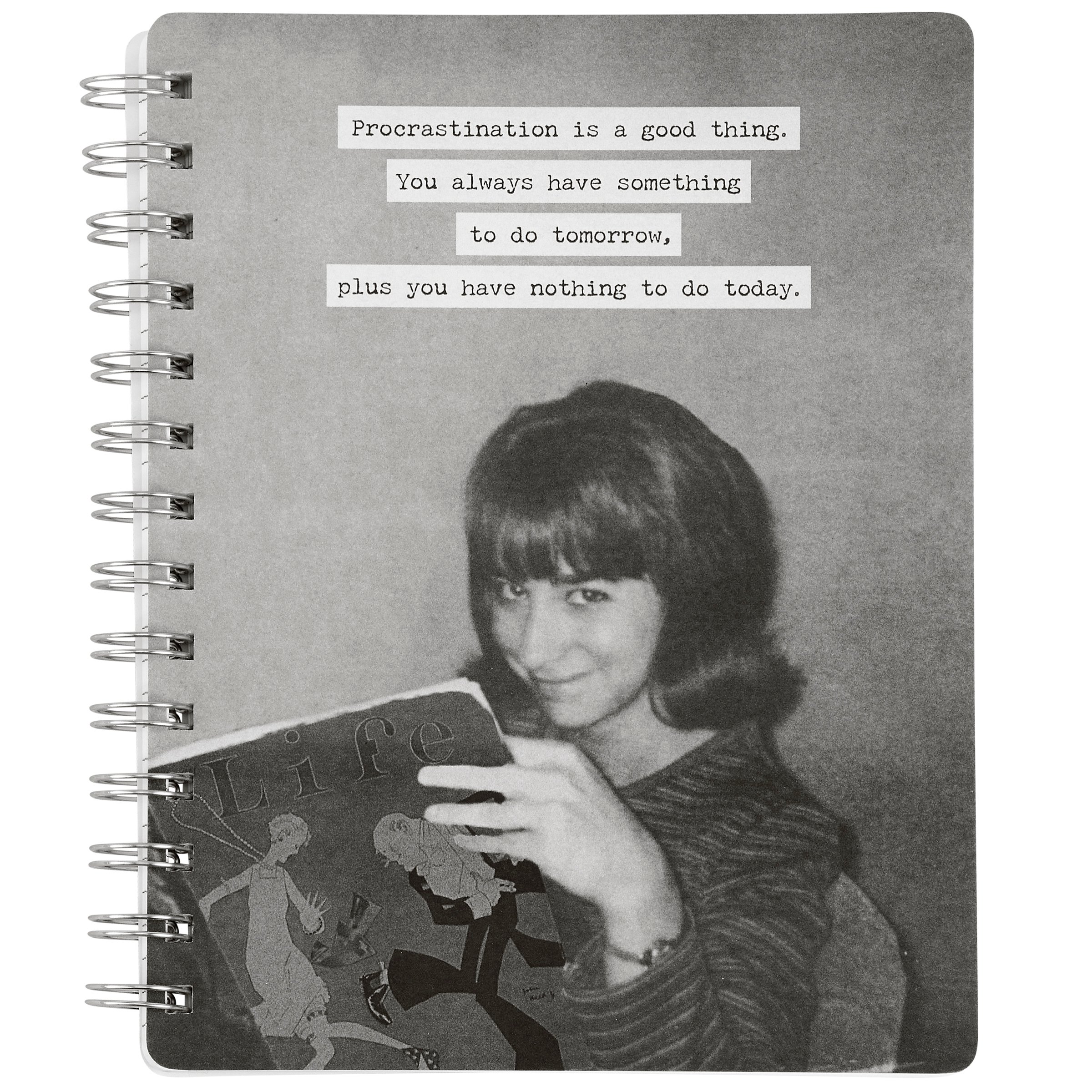 A double-sided spiral notebook from our Trash Talk By Annie Collection displaying a vintage black and white photo complemented by a sassy sentiment that reads "Procrastination Is A Good Thing. You Always Have Something To Do Tomorrow, Plus You Have Nothing To Do Today." The back cover of the notebook features a classy pink and gray retro pattern to complete the look. Our Nothing To Do Today spiral notebook includes 120 lined pages. A fun gift that calls back to a vintage style with modern sassy sentiments, perfect for making a statement while getting a giggle out of others.
