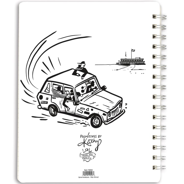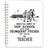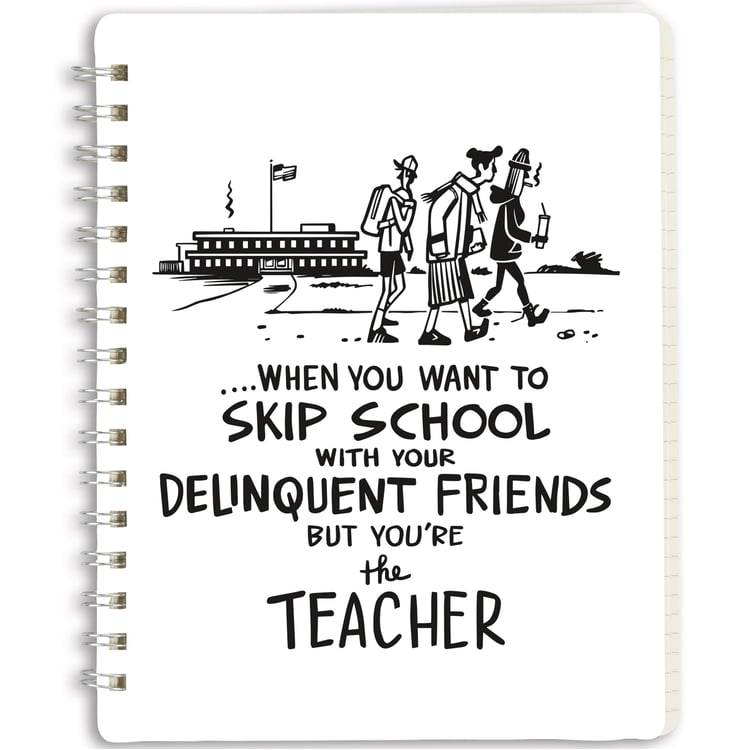 A double-sided spiral notebook from our Teacher Collection displaying a fun hand illustrated design of school kids walking away from school with a humorous teacher-themed sentiment that reads "...When You Want To Skip School With Your Delinquent Friends But You're The Teacher." Back cover features hand illustrated design of kids having fun in a car. Our Skip School spiral notebook includes 120 lined pages. A fun teacher gift perfect for an everyday accessory.
