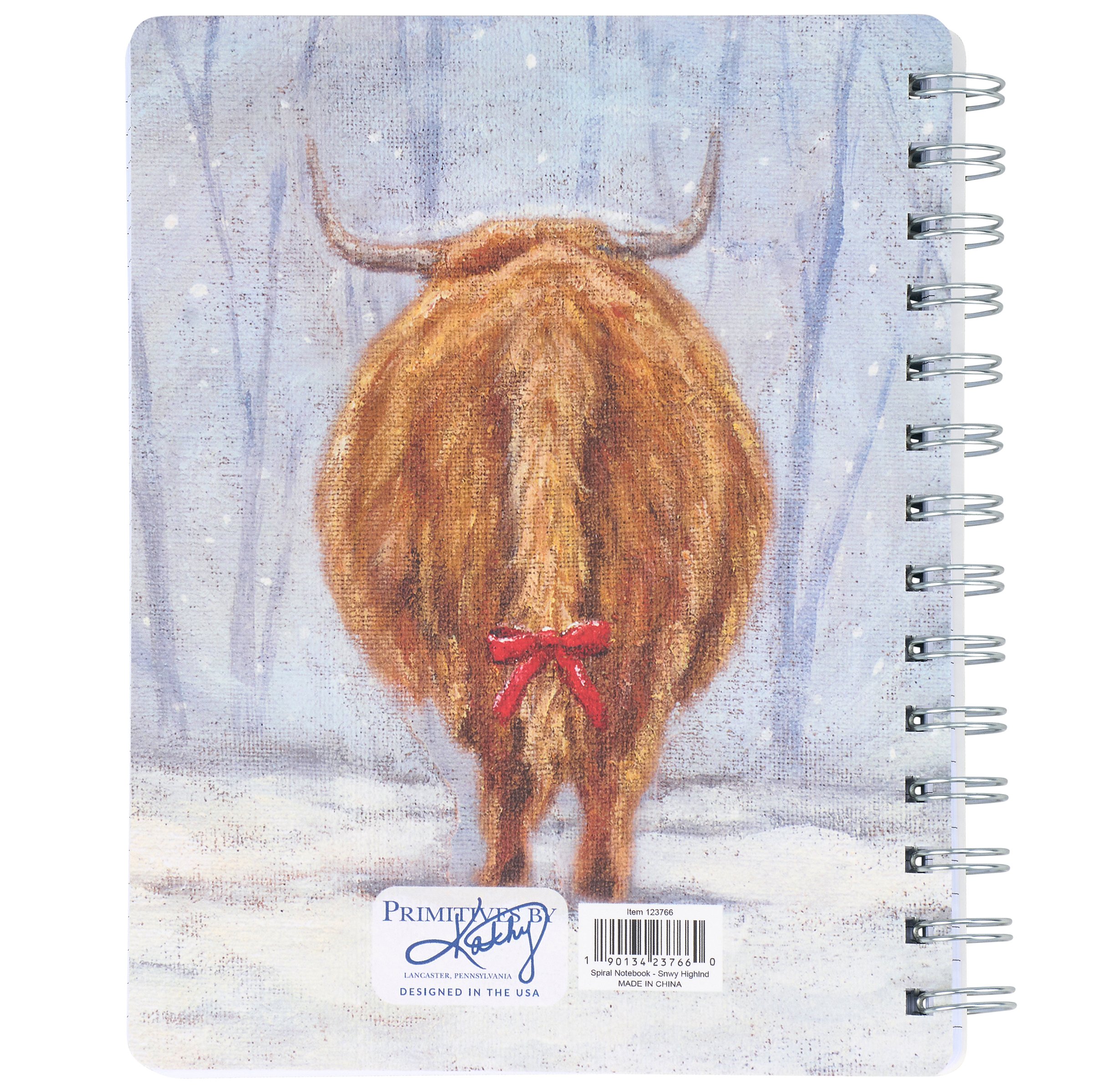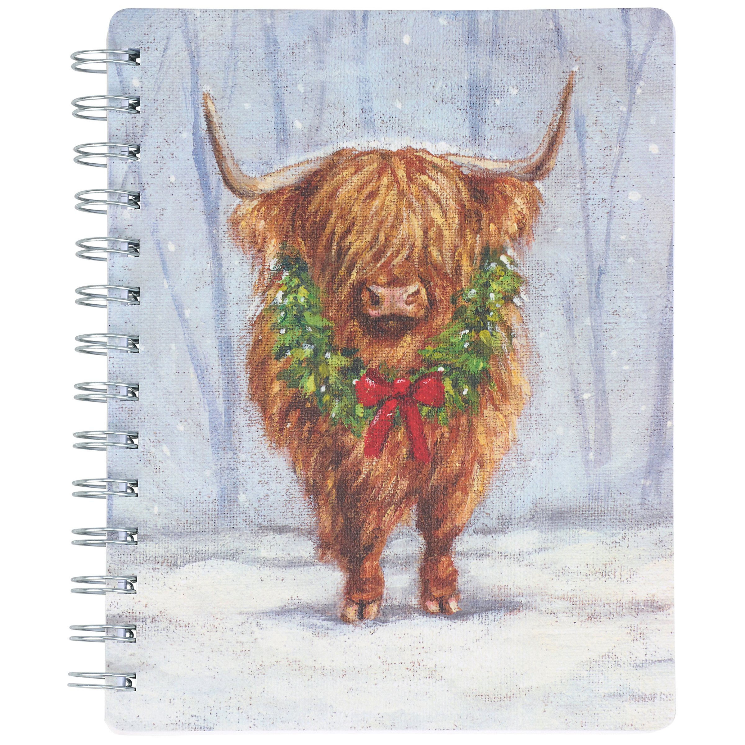 A double-sided spiral notebook from our Christmas Collection displaying a winter scene of a highland cow wearing a holiday wreath with front and back perspectives on each cover. Winter highland cow design is replicated from original artwork painted onto burlap canvas, giving the art a unique depth and texture. Our Snowy Highland spiral notebook includes 120 lined pages. A farm themed Christmas gift perfect for a seasonal accessory.